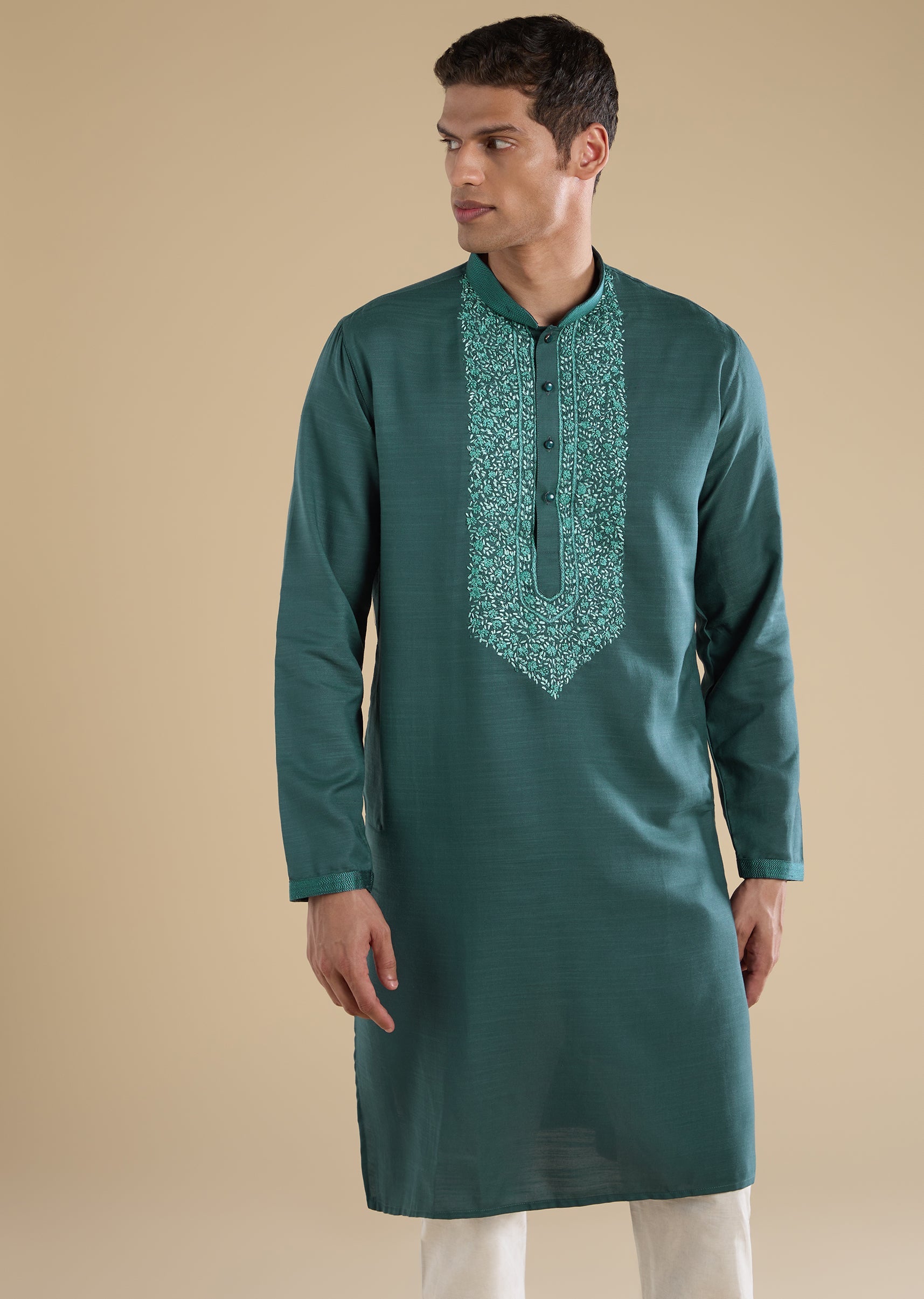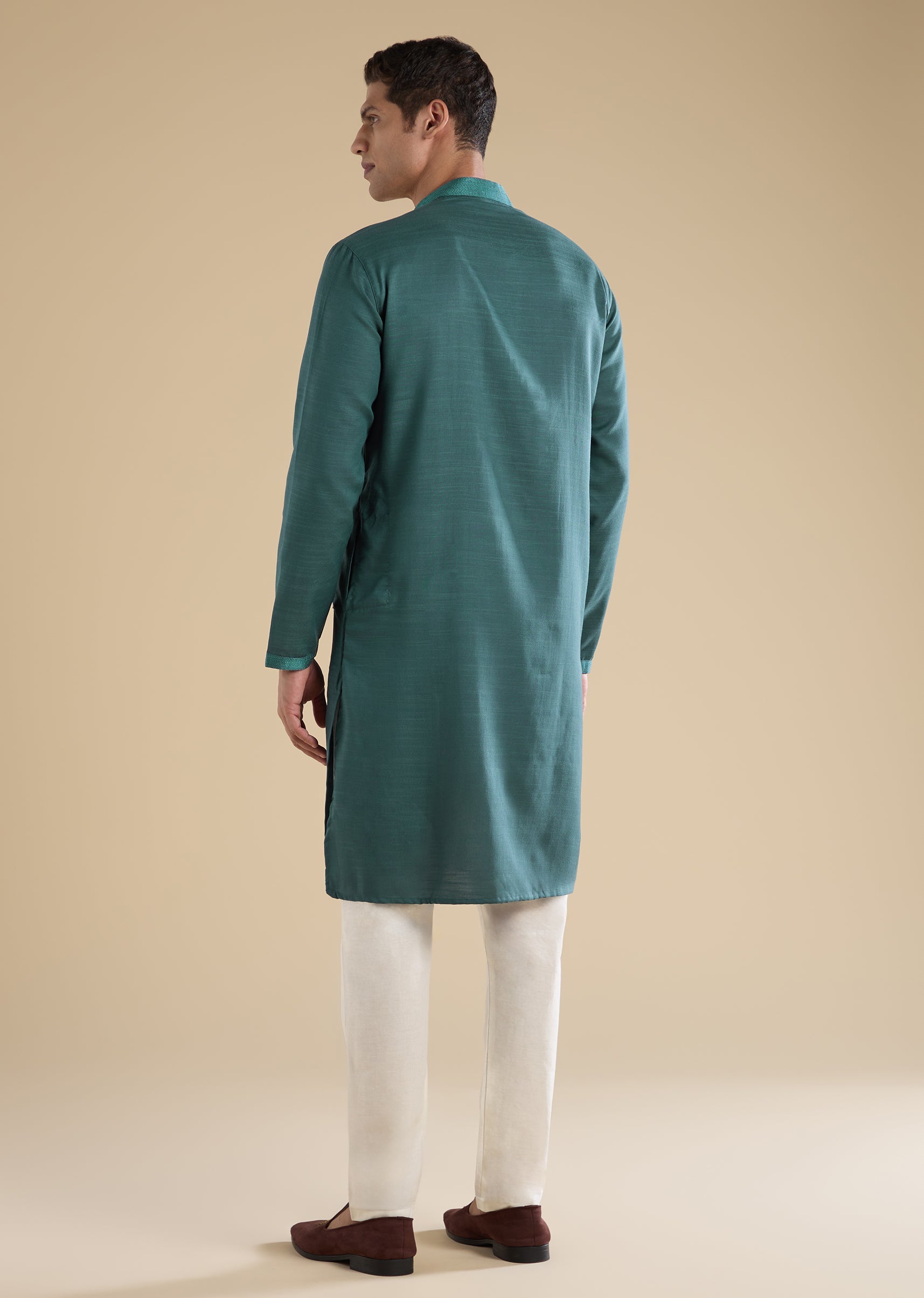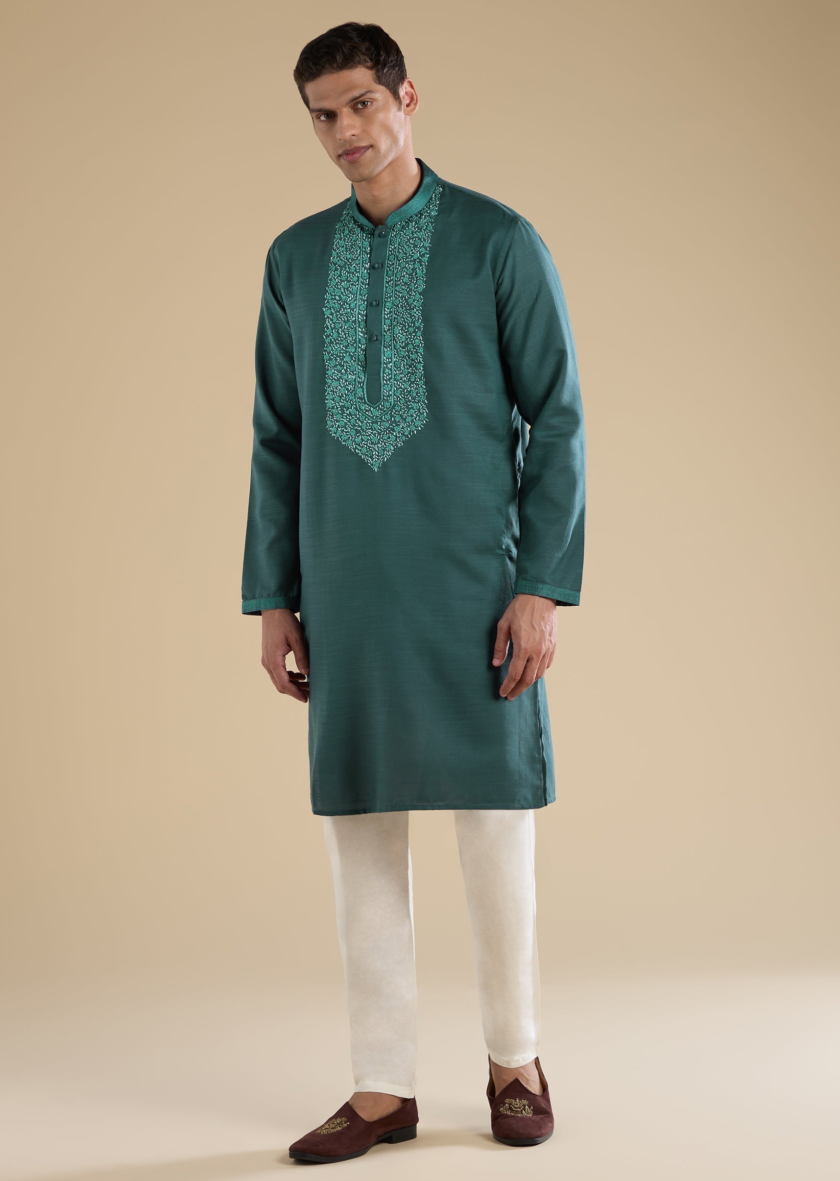 Fresh and easy-going, this green kurta set is crafted for relaxed casual wear. Featuring a mandarin collar, full sleeves, and subtle thread detailing, it offers a clean, fuss-free silhouette. Paired... More Product Details