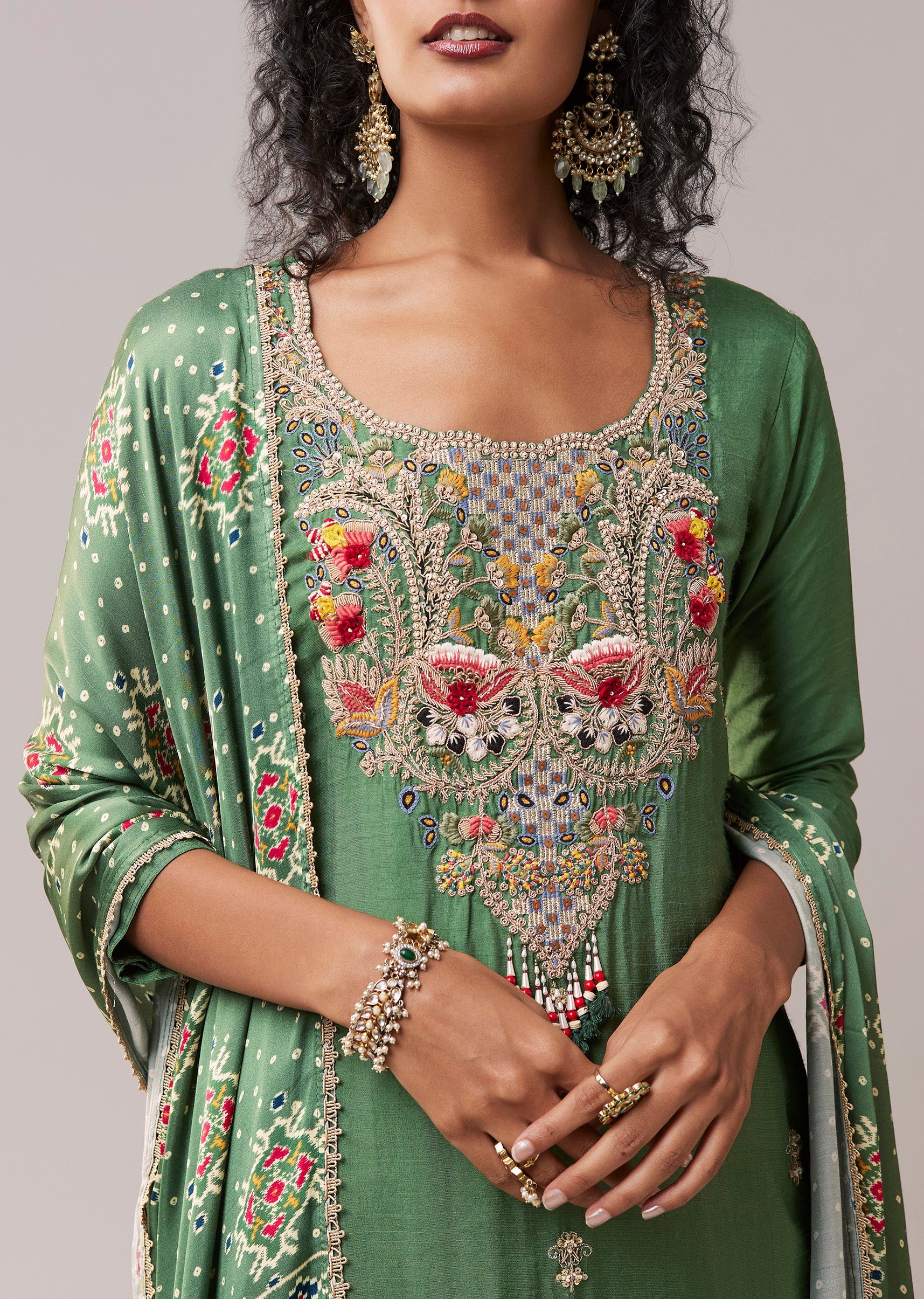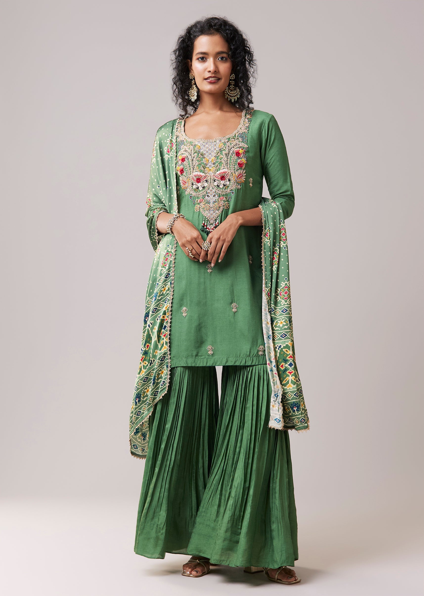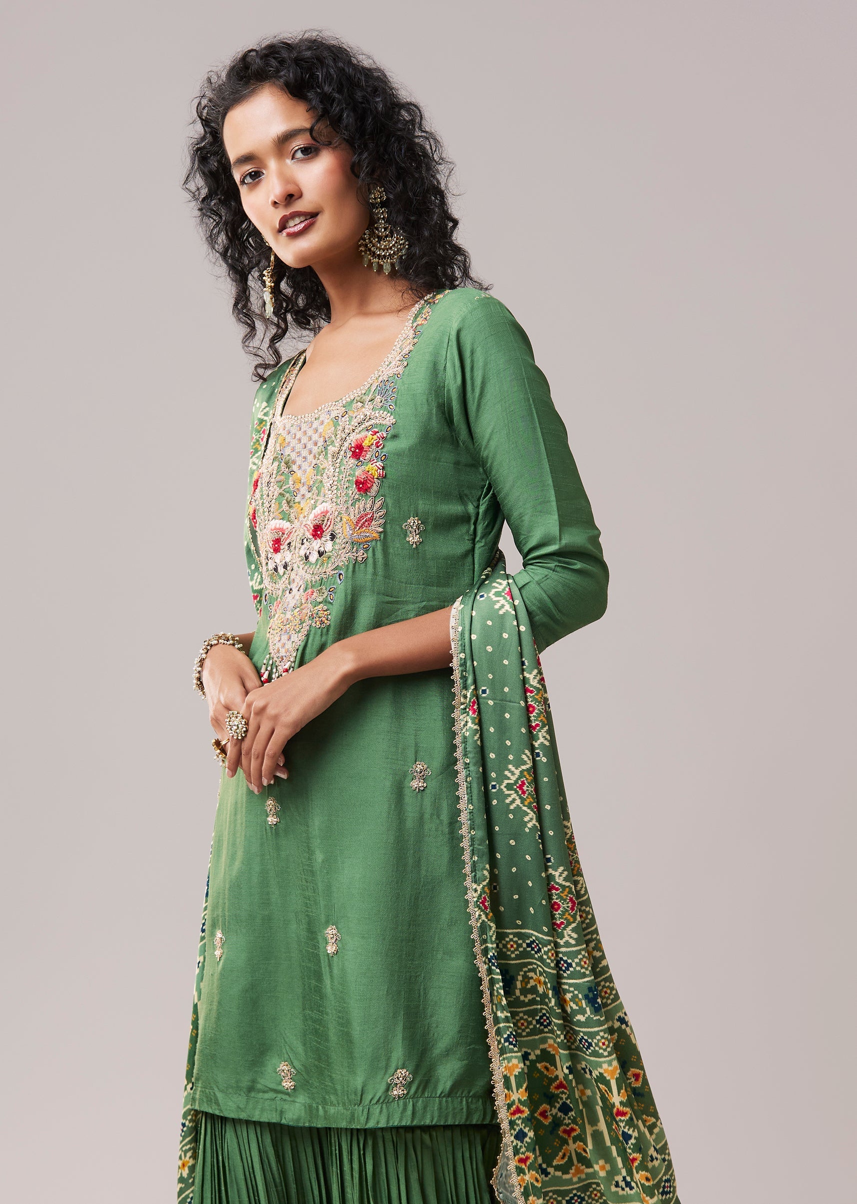 Green Chinon Silk Zardozi Embellished Kurta Sharara Set