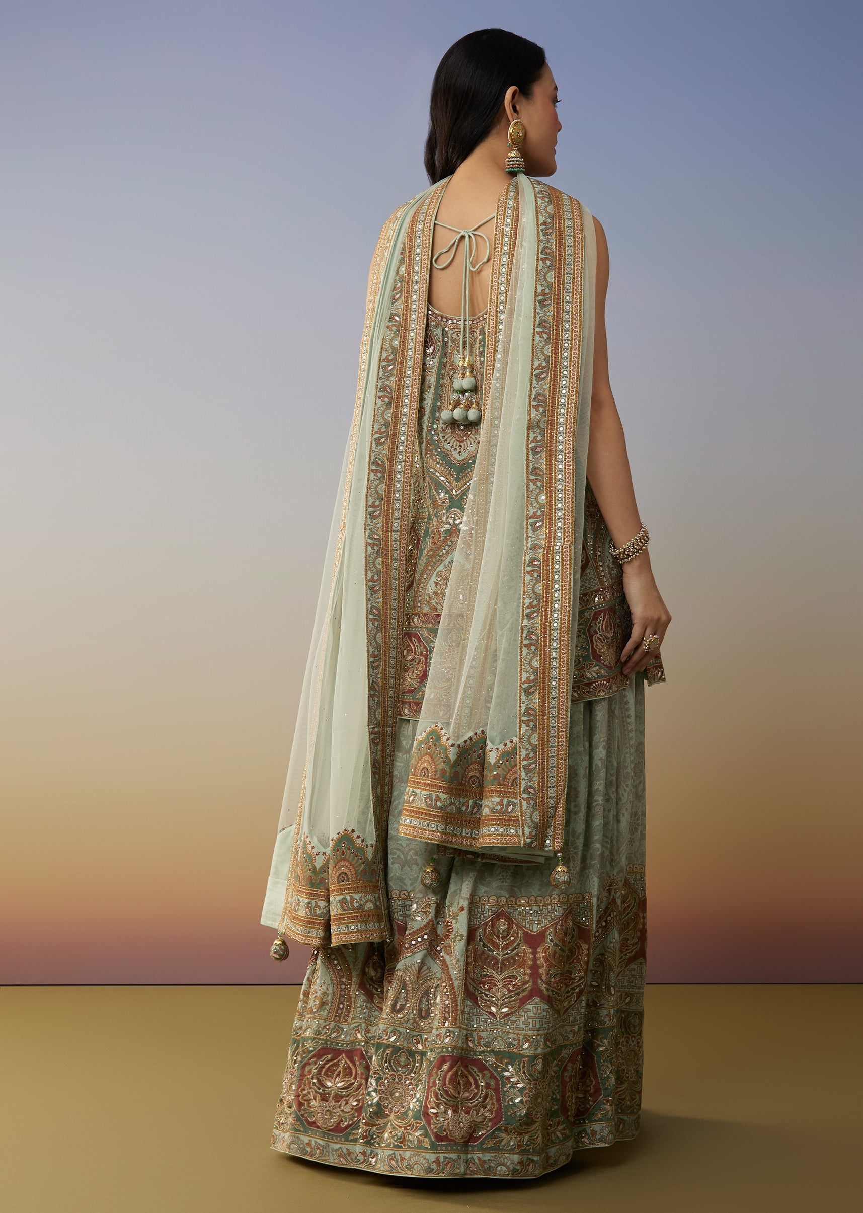 This green palazzo suit set brings a soft pastel charm perfect for mehendi sangeet and wedding celebrations. Designed in a straight silhouette with a coordinating dupatta it features a forty... More Product Details