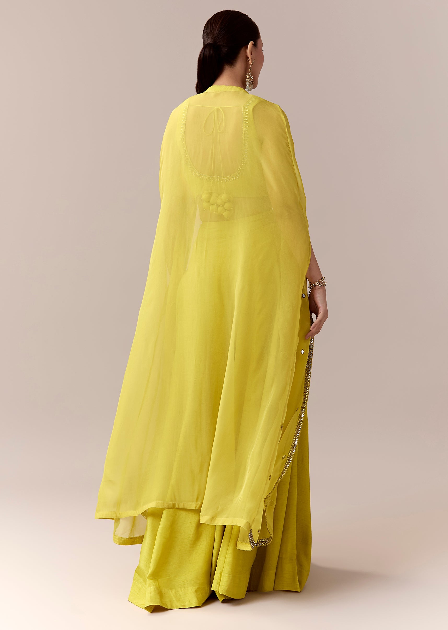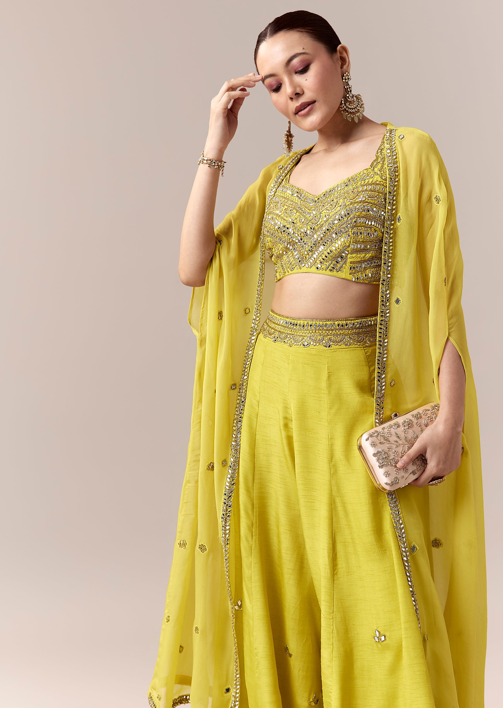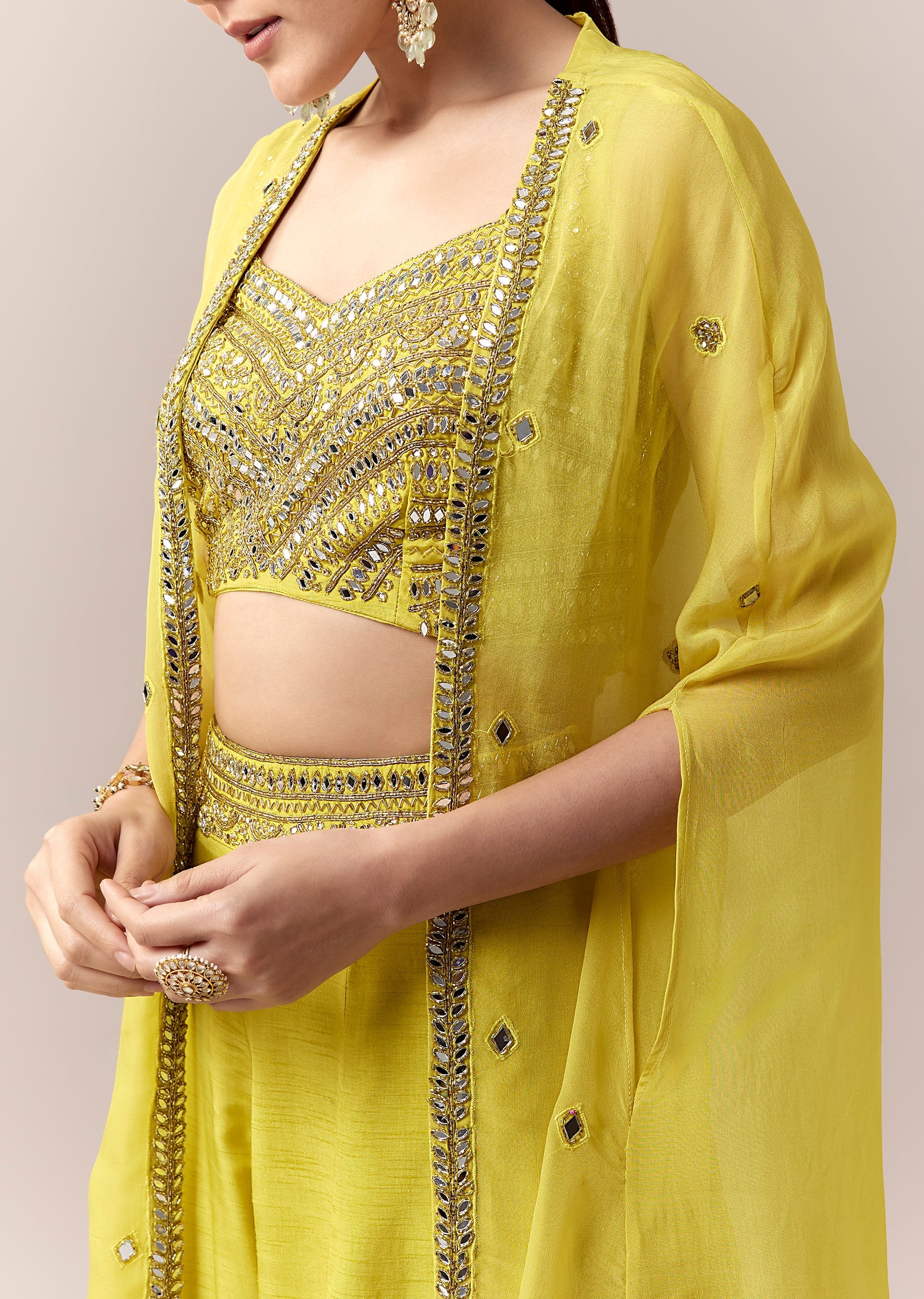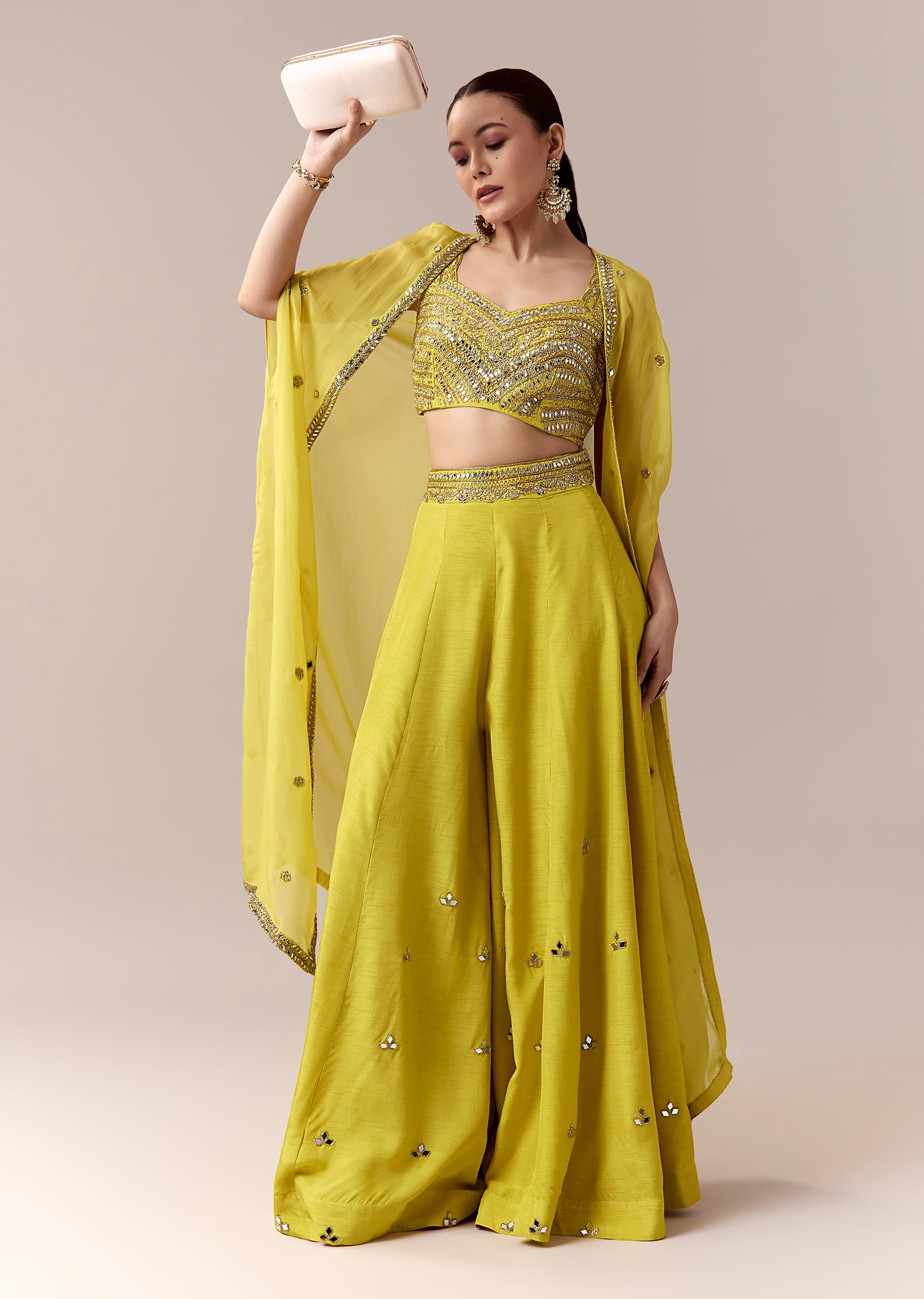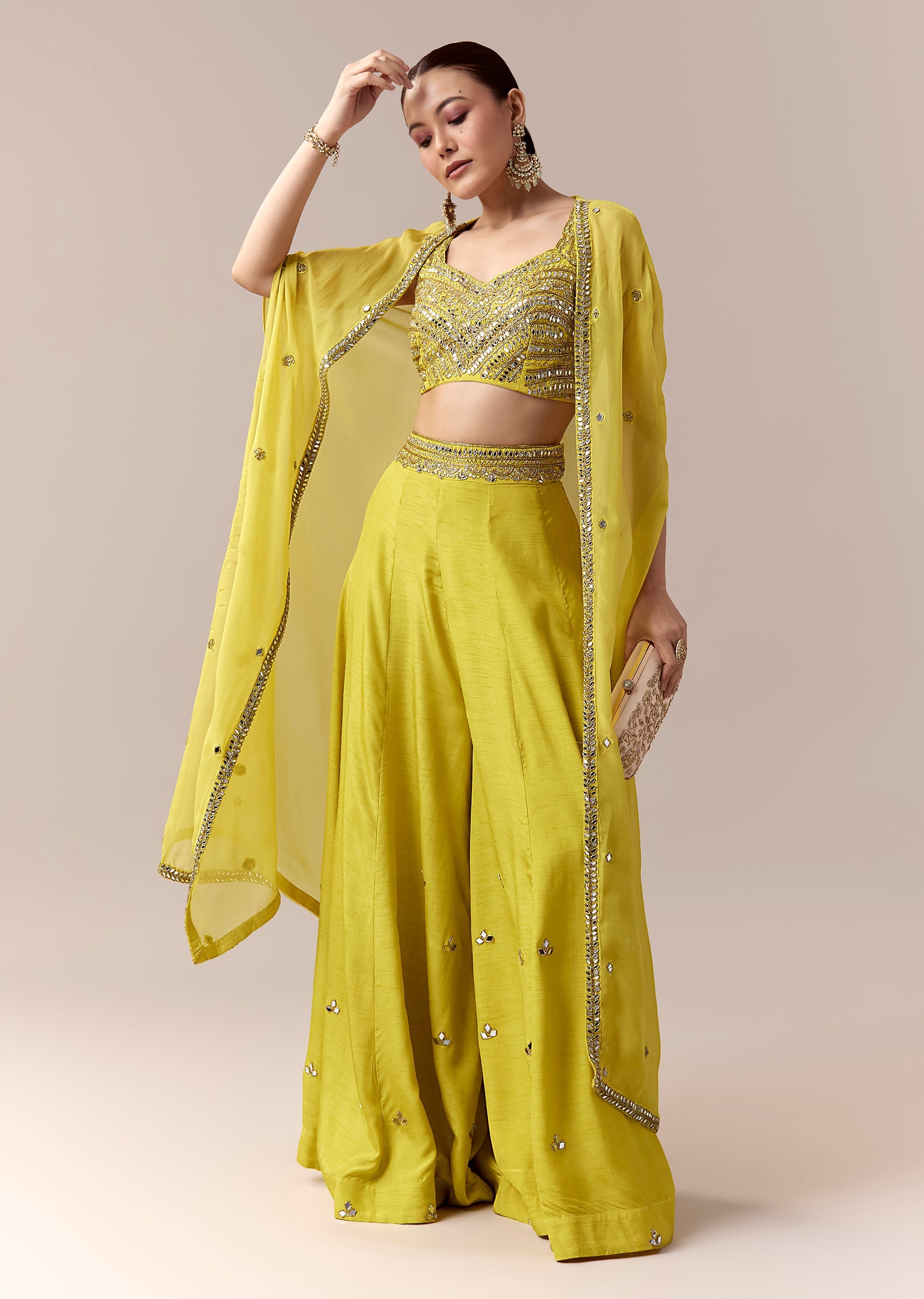 Vibrant and festive, this green crop top and pants set is perfect for haldi, sangeet, or mehendi celebrations. The sleeveless crop top features intricate mirror and cut dana work that adds a sparkling color pop, complemented by a flowing silk cape adorned with mirror detailing for a contemporary festive touch. The sweetheart neckline enhances the feminine charm, while the coordinated pants complete a chic silhouette ideal for a stylish bridesmaid or wedding guest. Awarded as the Most Trusted Brand, we're delivering styles you love, just as promised.