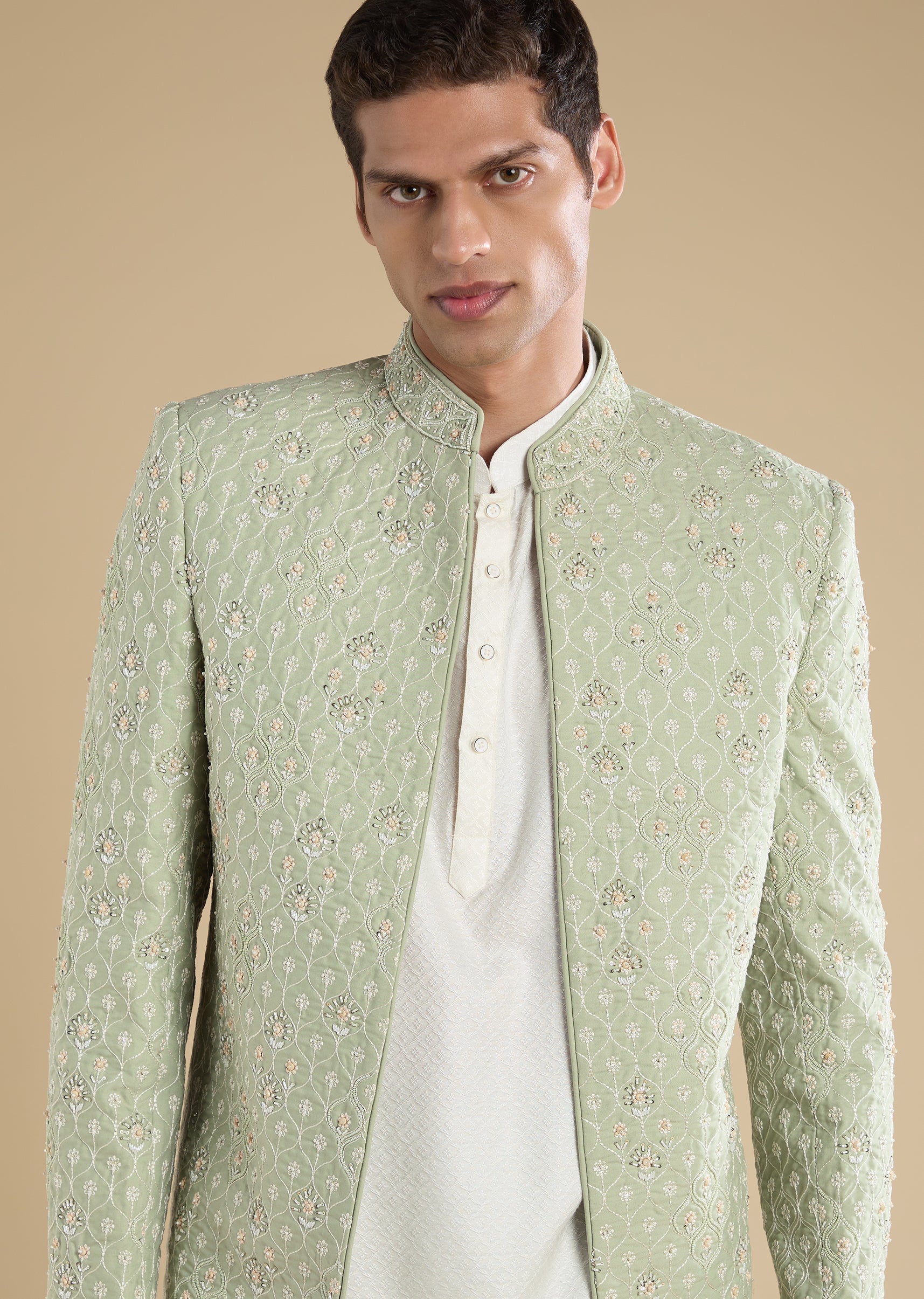 Tailored for groomsmen and wedding guests, this green jodhpuri set is crafted in rayon and elevated with thread/resham, sequins, cut dana and beadwork. The silhouette features a mandarin collar and... More Product Details