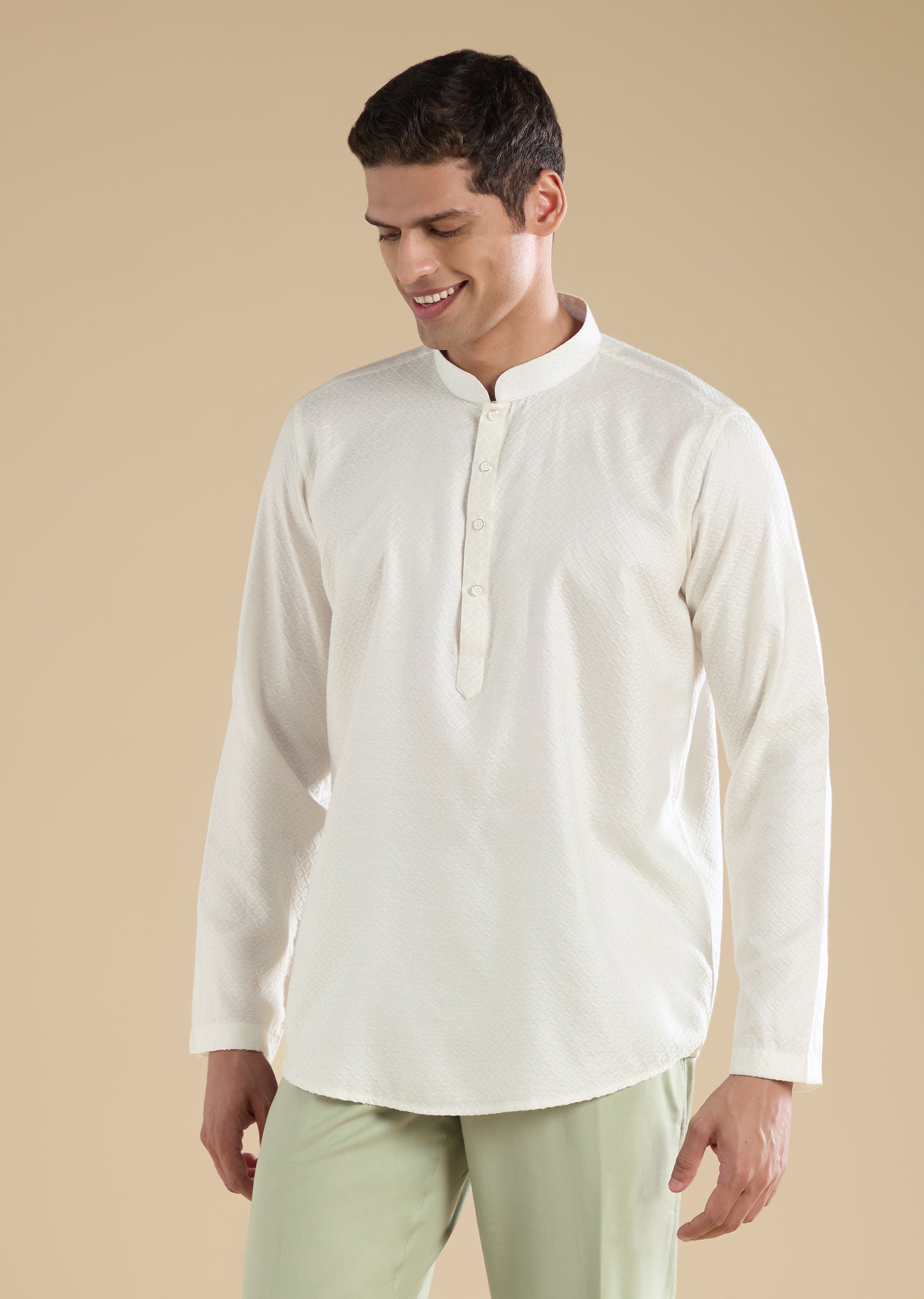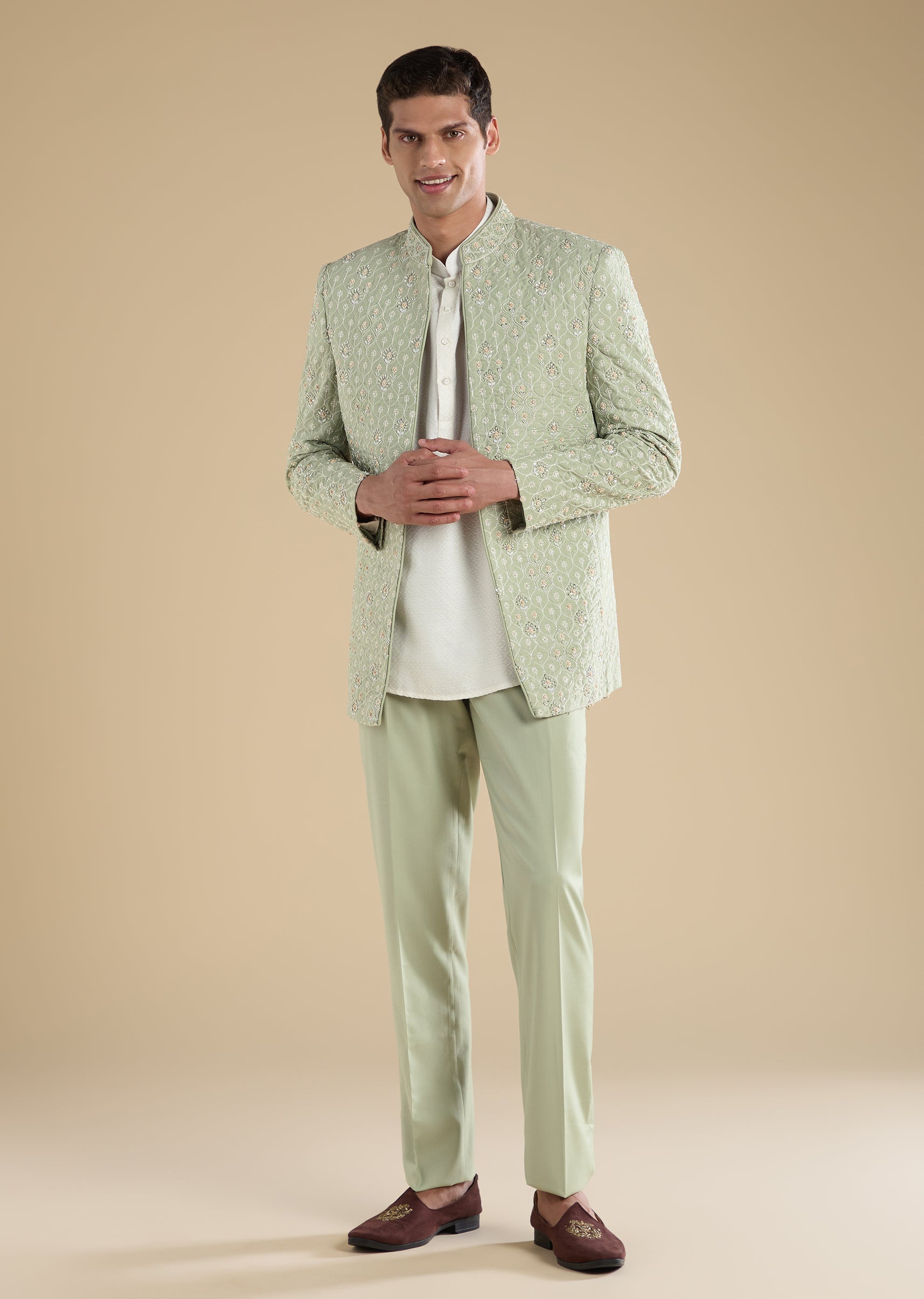Tailored for groomsmen and wedding guests, this green jodhpuri set is crafted in rayon and elevated with thread/resham, sequins, cut dana and beadwork. The silhouette features a mandarin collar and full sleeves, finished with front button closure. The set includes a matching kurta and straight pants with a mid-waist fit—ideal for engagement, mehendi and wedding celebrations. Awarded as the Most Trusted Brand, we're delivering styles you love, just as promised.