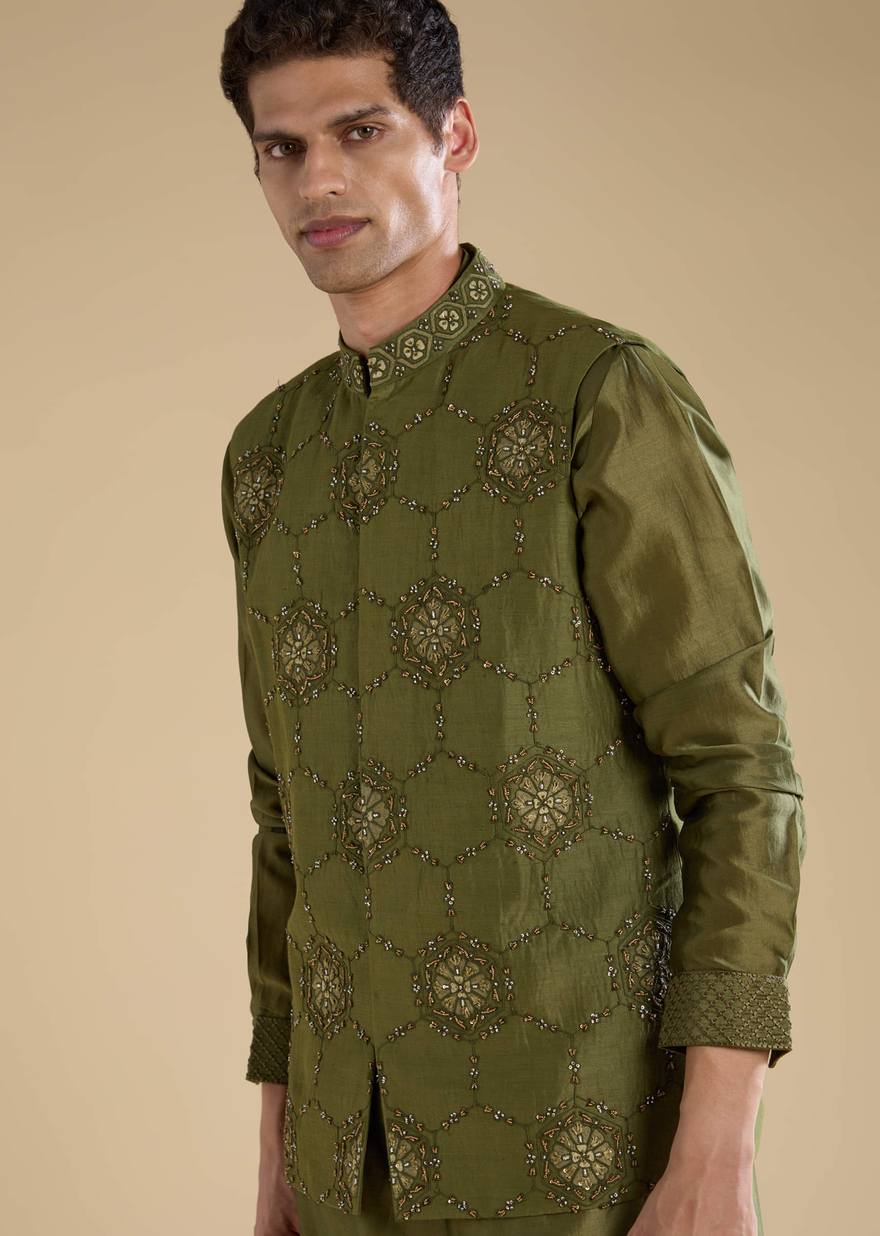 Green Embroidered Mens Satin Jacket Kurta and Pant Set