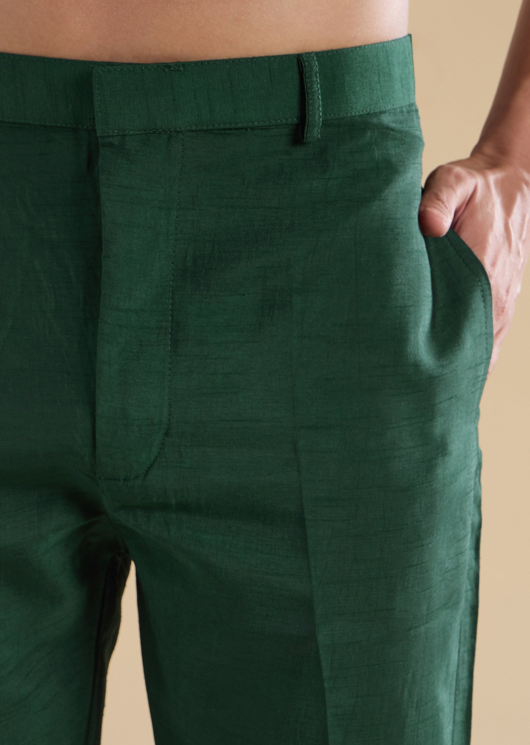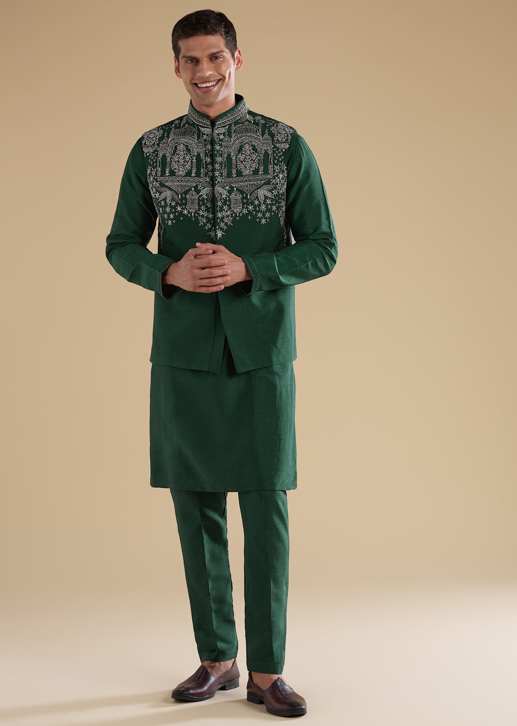 Fresh and festive with refined detailing, this green kurta jacket set is crafted in smooth art silk for a rich celebratory look. The kurta features a mandarin collar, full sleeves,... More Product Details