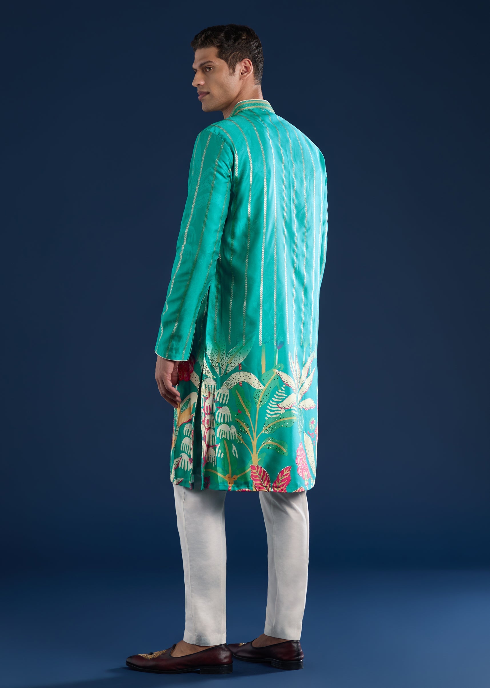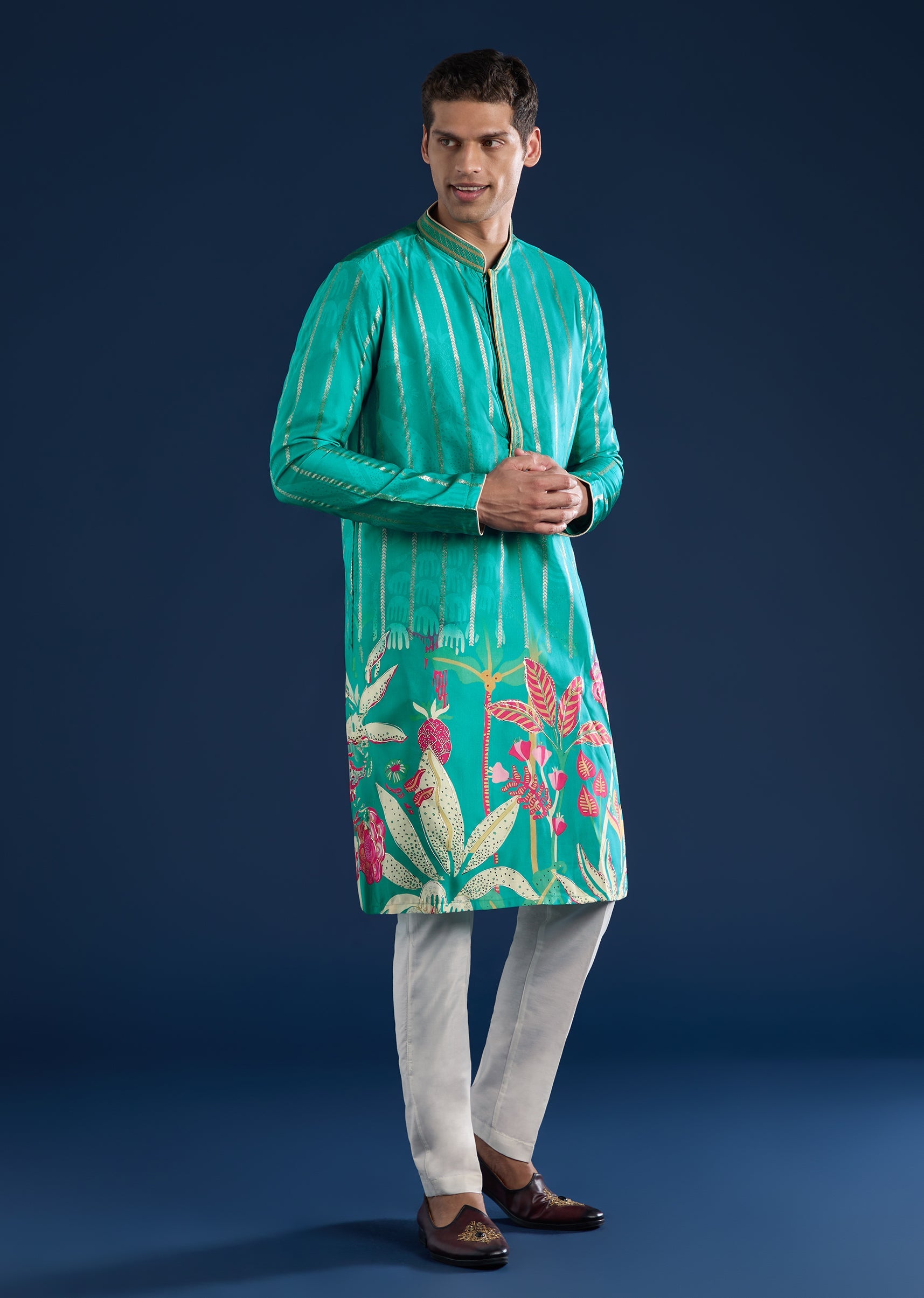This green kurta set is crafted in art silk for a clean festive look. Designed with a mandarin collar, full sleeves, and side slits, it offers timeless elegance paired with straight-fit trousers and a partially elasticated waist for comfort. Awarded as the Most Trusted Brand, we're delivering styles you love, just as promised.