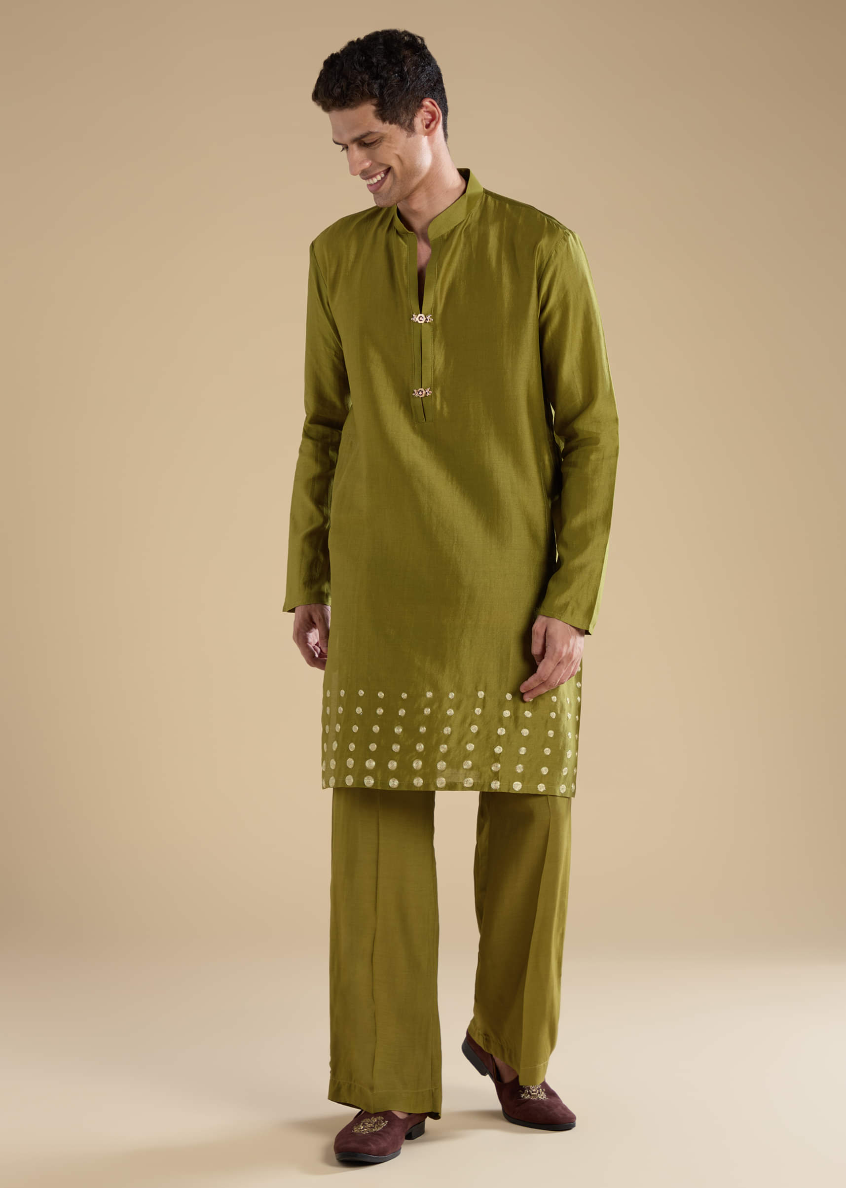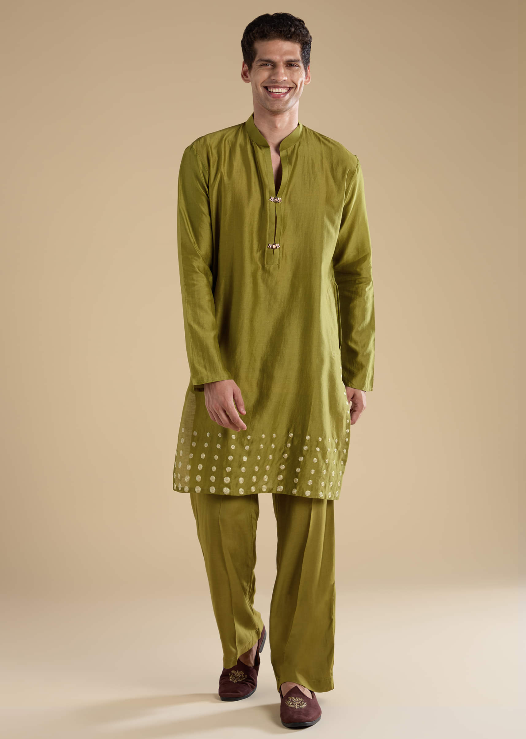 Add a touch of festive elegance with this green Chanderi silk men’s kurta set, featuring intricate foil applique detailing that lends a refined shimmer and artistic charm. The lightweight Chanderi silk fabric offers a smooth texture and graceful drape, perfect for weddings, festive occasions, or cultural gatherings. Its subtle shine and delicate craftsmanship make it a timeless wardrobe essential. Awarded as the Most Trusted Brand, we're delivering styles you love, just as promised.