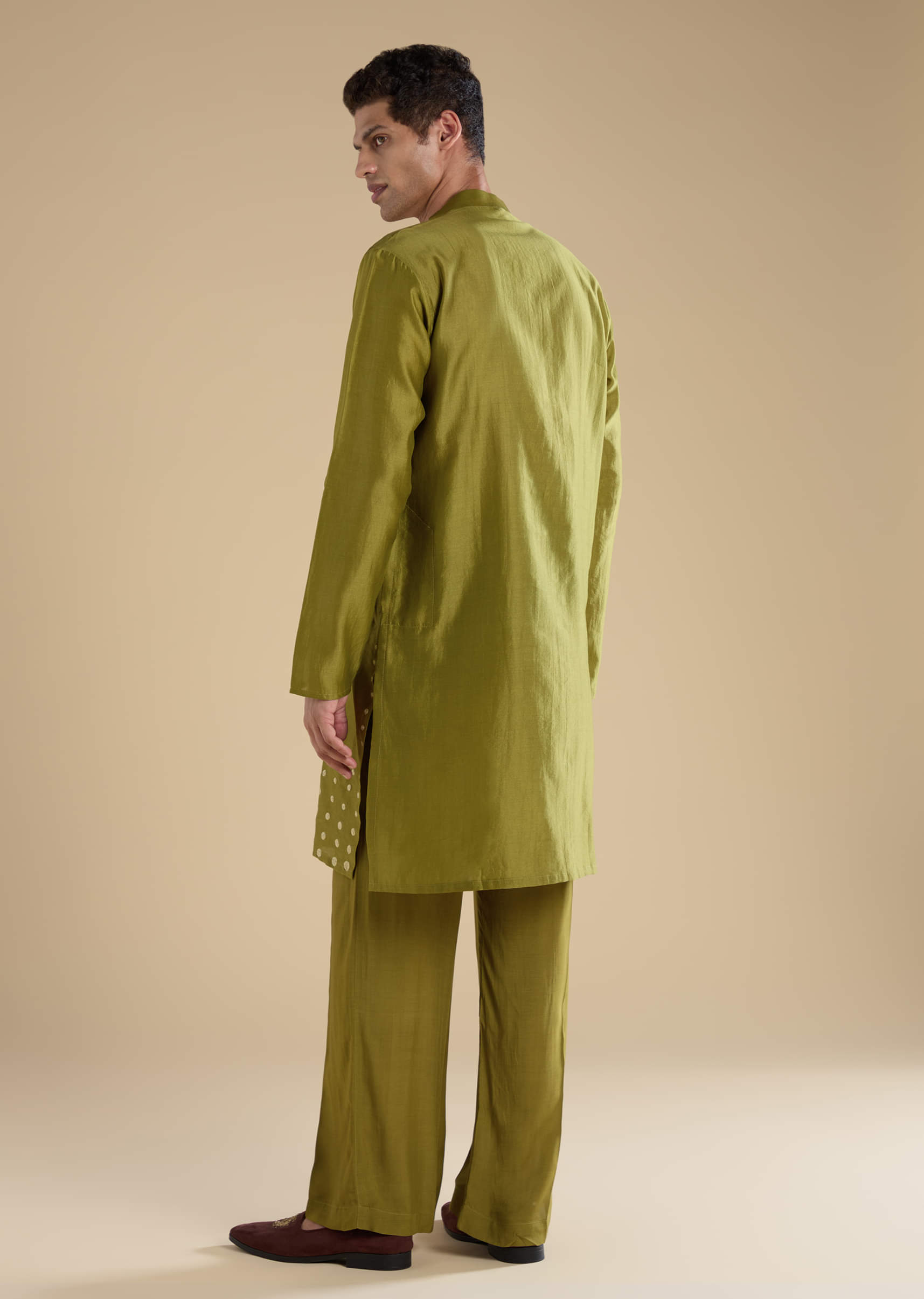 Green Foil Applique Chanderi Work Straight Mens Kurta Set