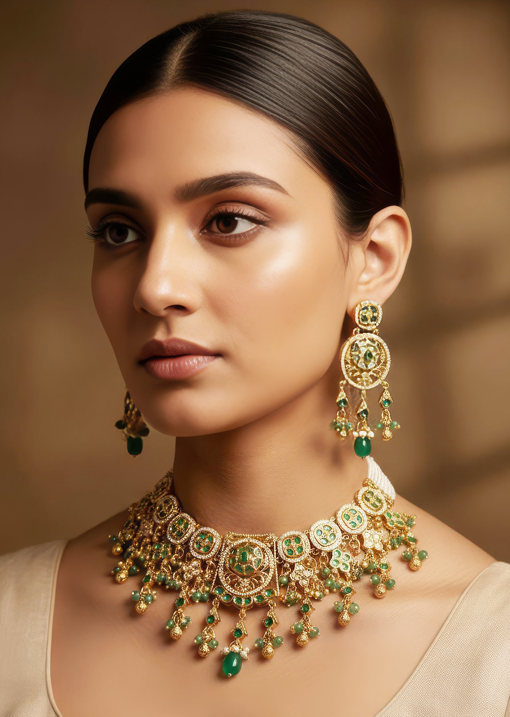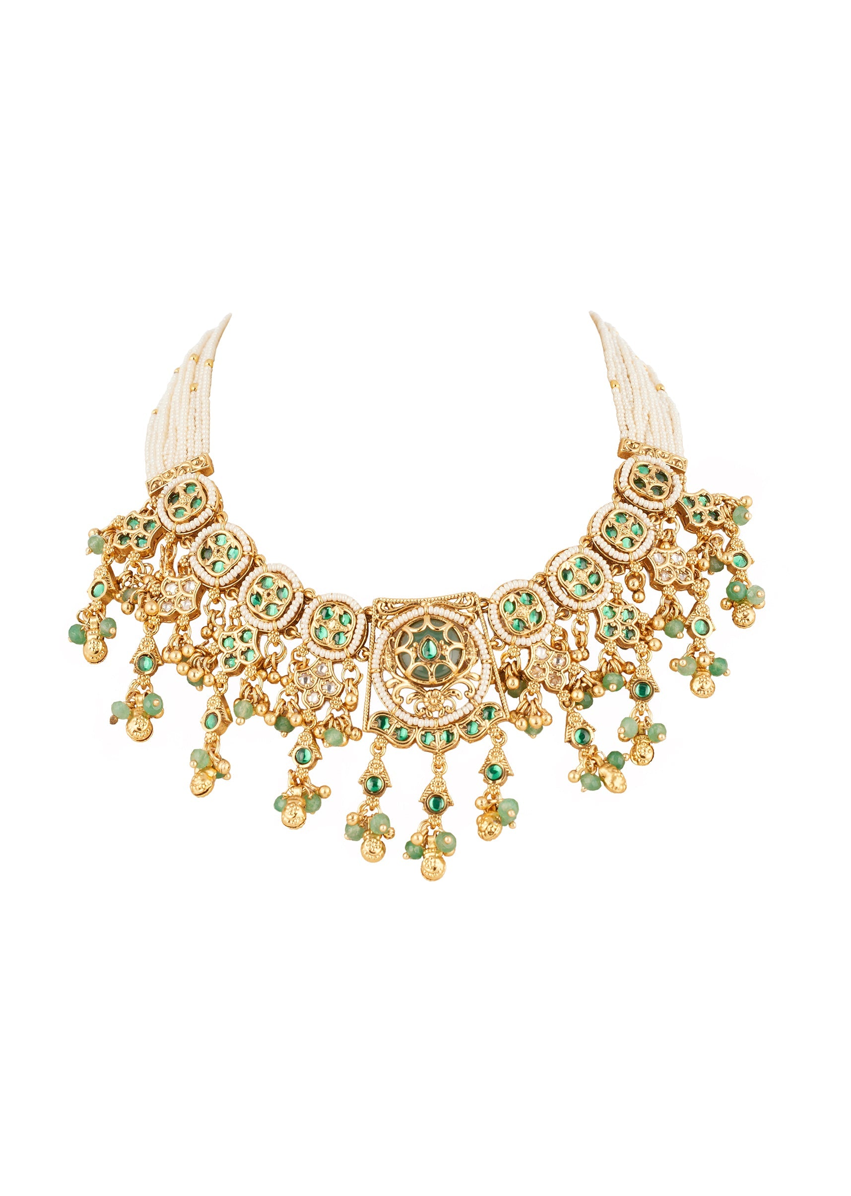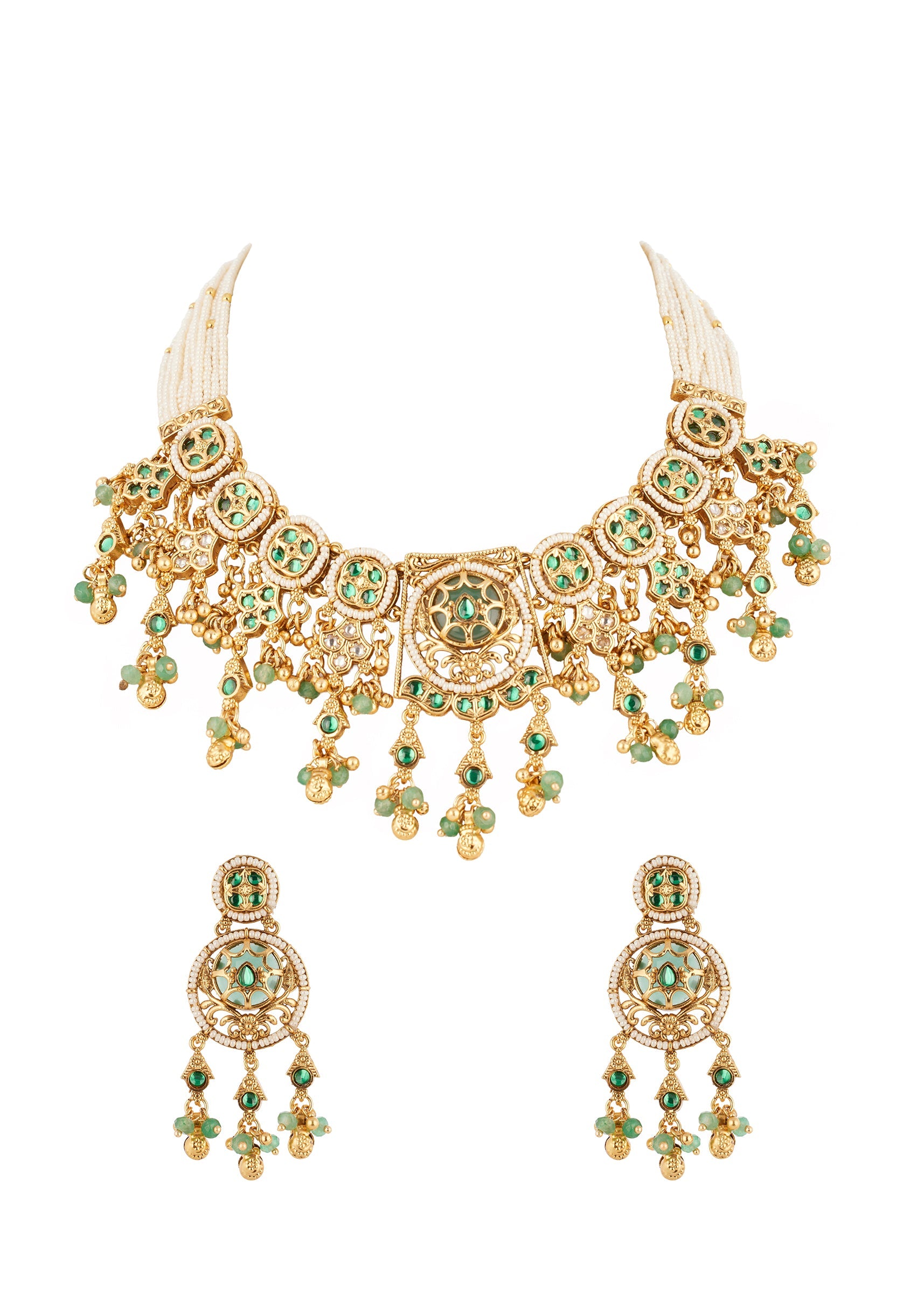 Green Gold Necklace Set With Elegant Kundan Detail