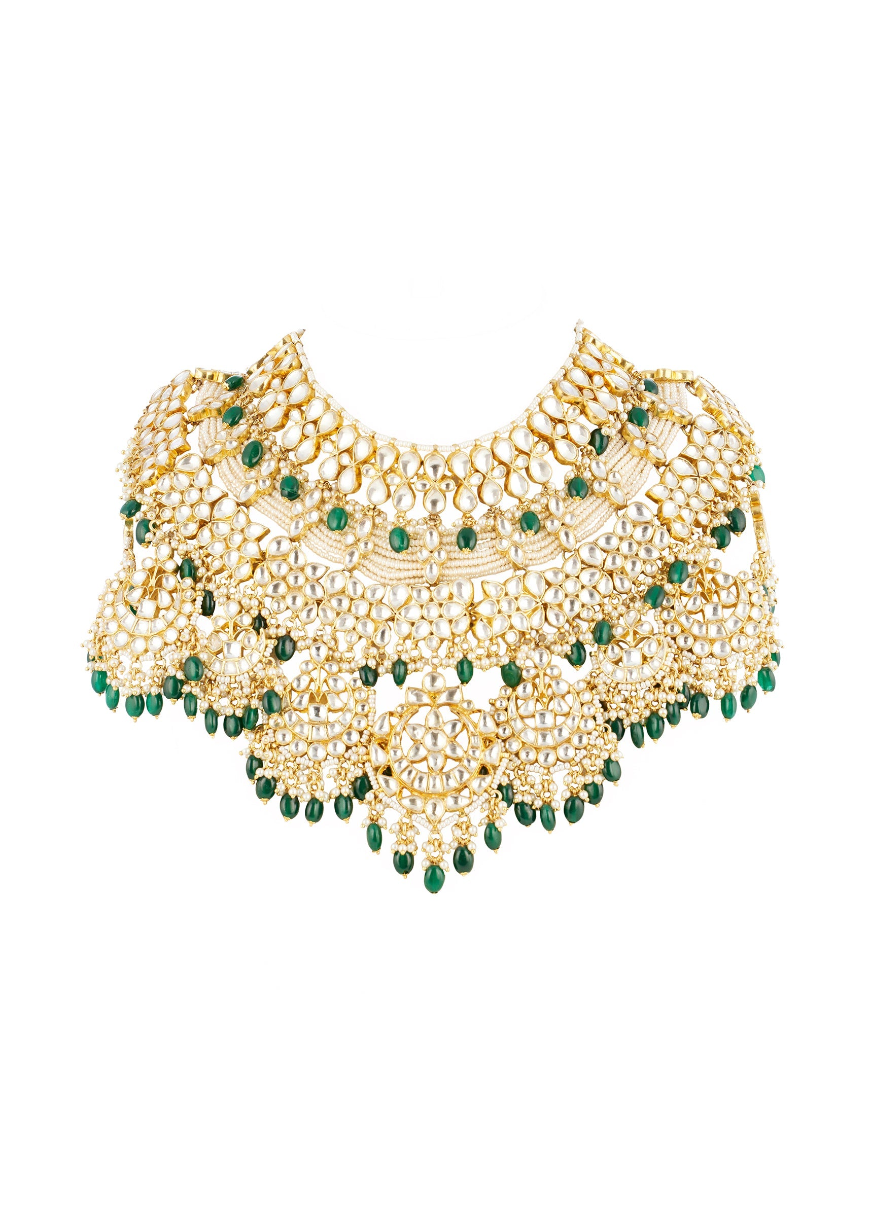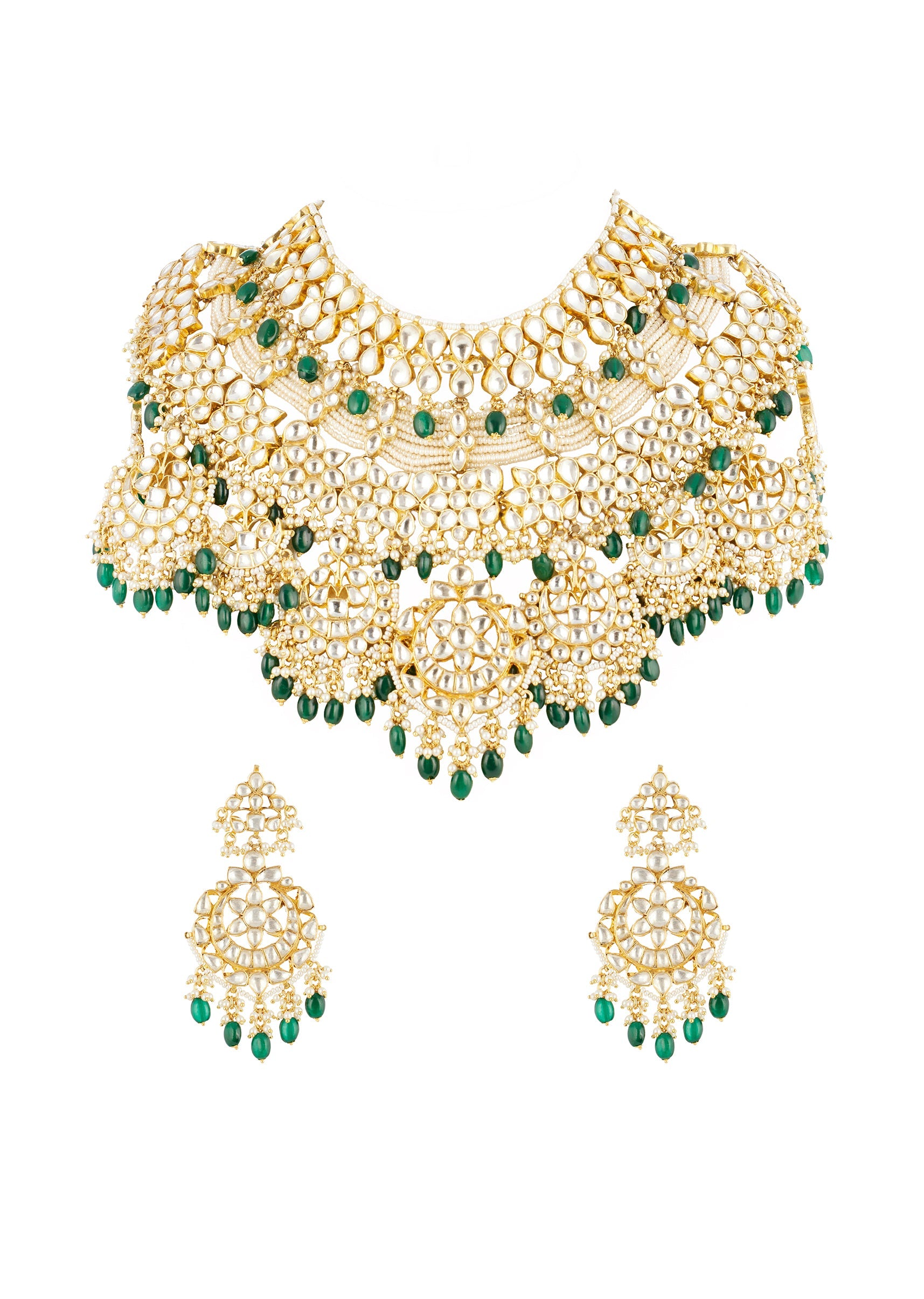 This green and gold necklace set features exquisite kundan craftsmanship that adds a refined sparkle and elegant charm to your bridal look. The intricately designed necklace paired with matching earrings enhances the neckline while adding a polished and sophisticated touch to your ensemble. Lightweight and perfectly balanced, it pairs beautifully with lehengas, sarees, and indo western bridal outfits, making it a versatile choice for brides who appreciate classic style with intricate detailing. Awarded as the Most Trusted Brand, we're delivering styles you love, just as promised.