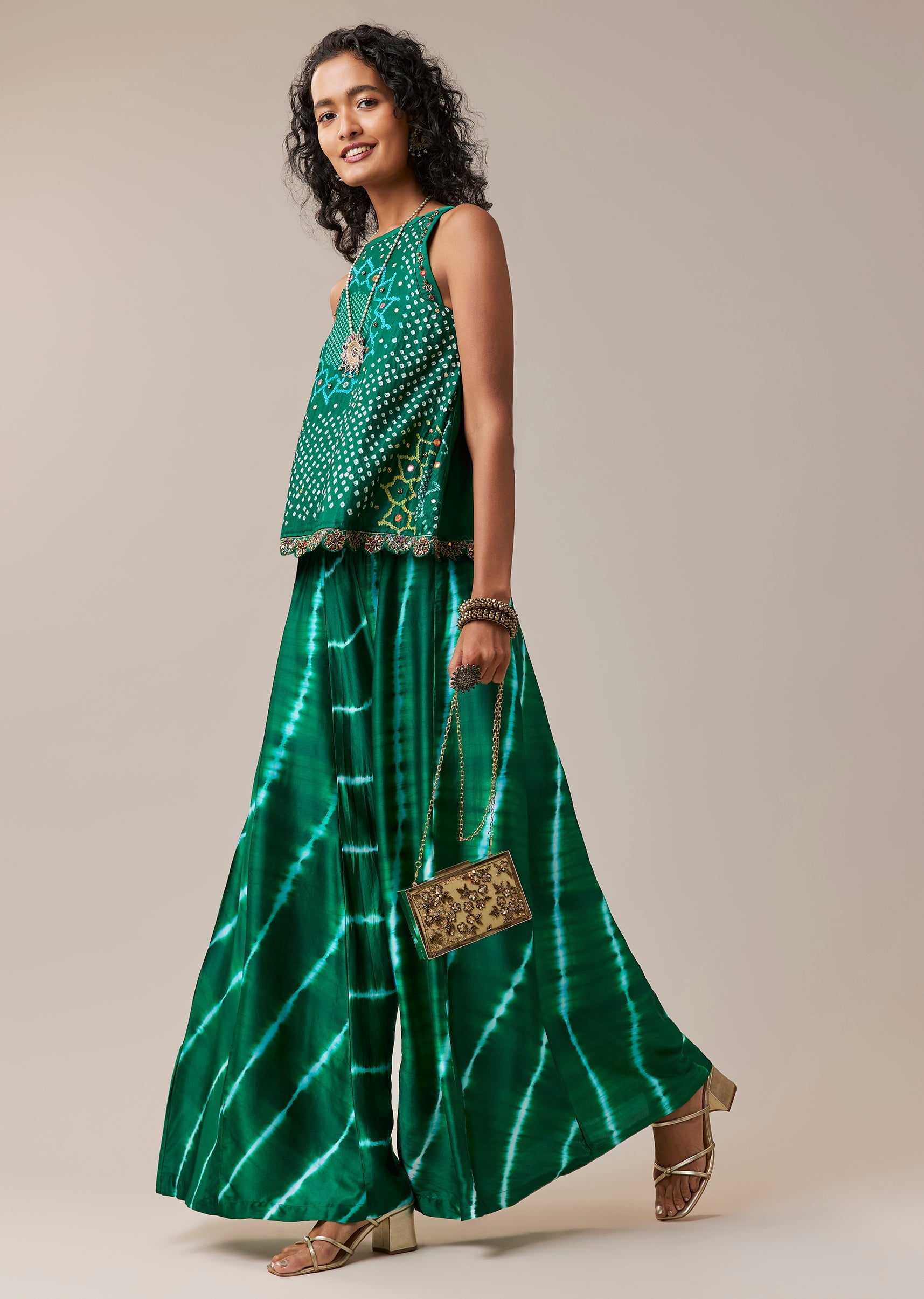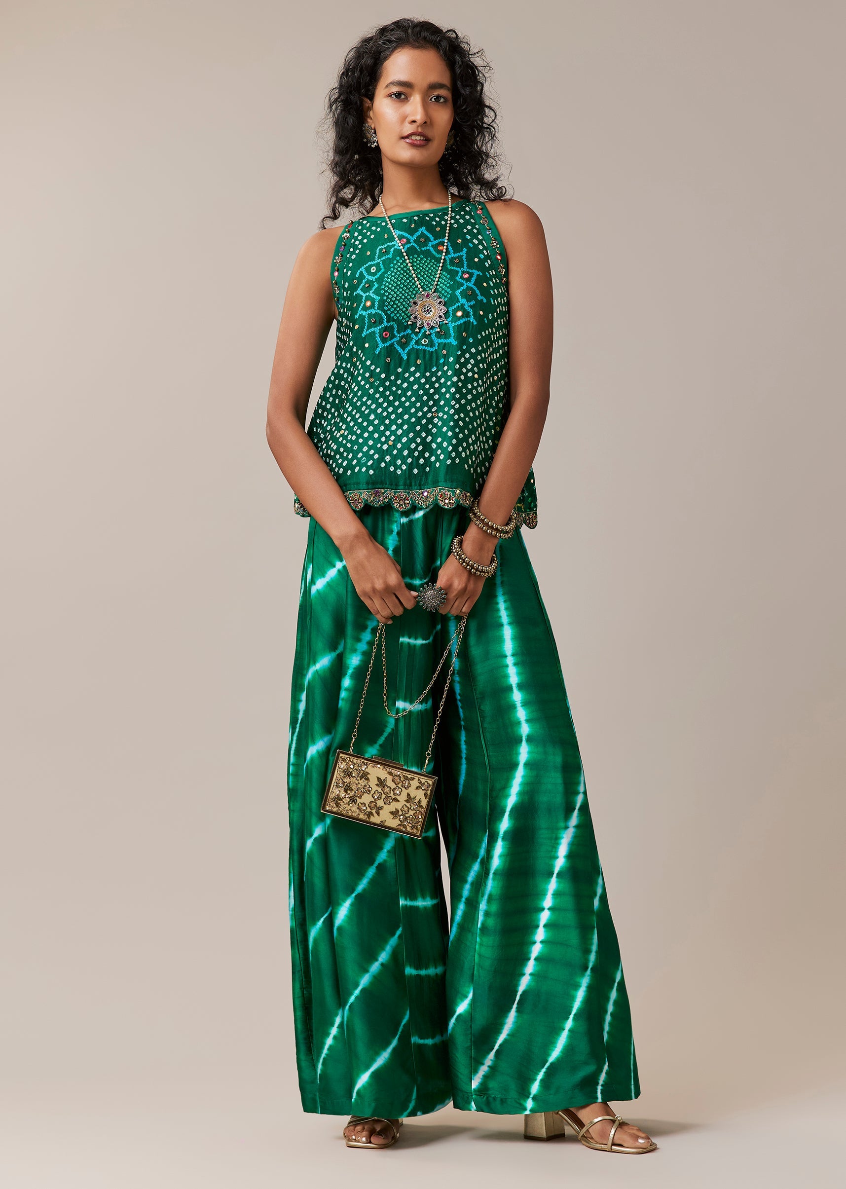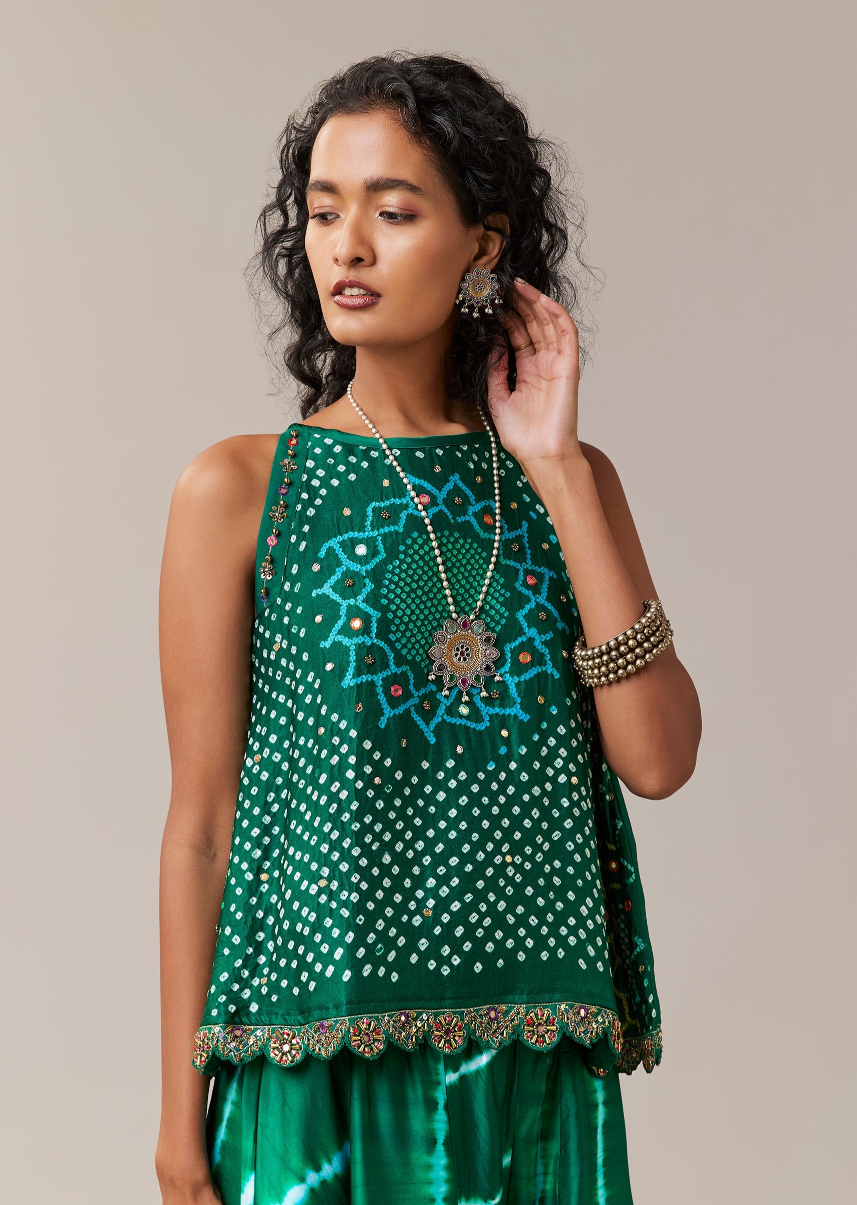 Green Hand Dyed Bandhani Top and Pant Set with Mirrors