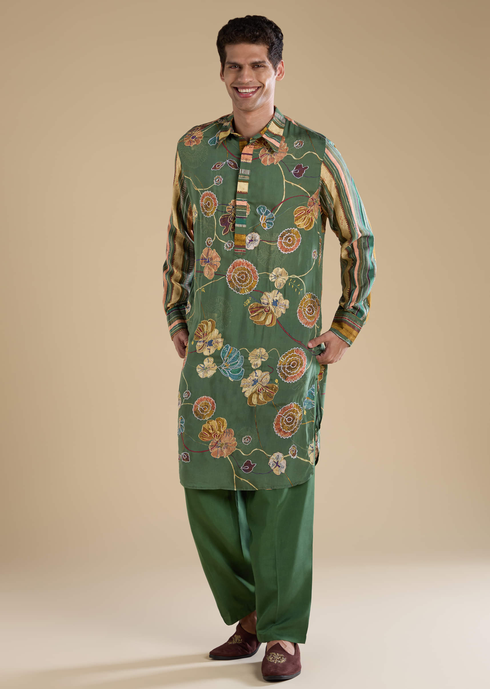 Green Kalamkari Mens Kurta and Pant Set