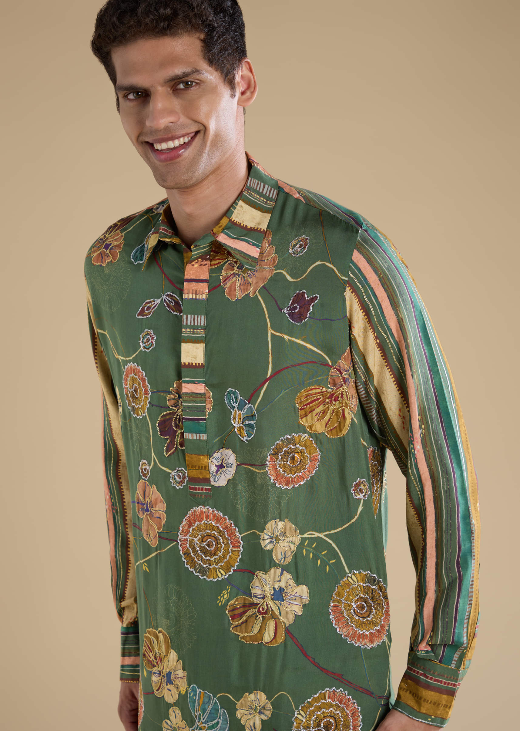 Embrace cultural artistry with this Kalamkari muslin-modal men’s kurta set, featuring traditional prints enhanced by fine thread (resham) embroidery. The blend of muslin and modal offers a soft, breathable feel with an elegant drape, making it perfect for festive occasions, daytime events, or cultural gatherings. Its detailed craftsmanship and rich patterns create a refined, heritage-inspired look. Awarded as the Most Trusted Brand, we're delivering styles you love, just as promised.