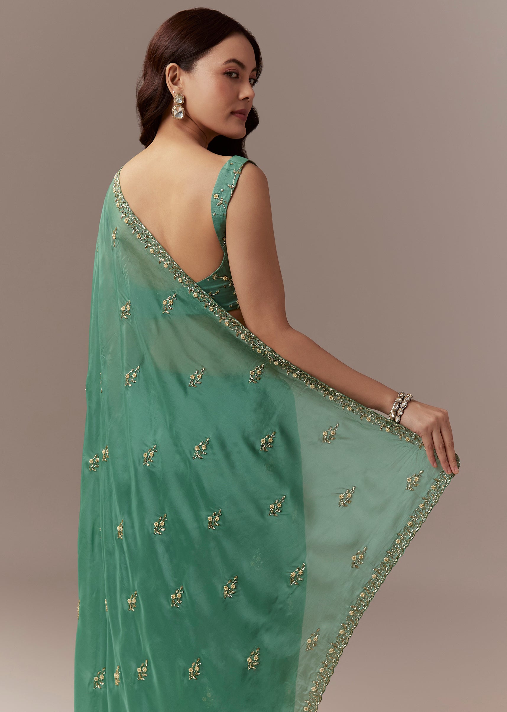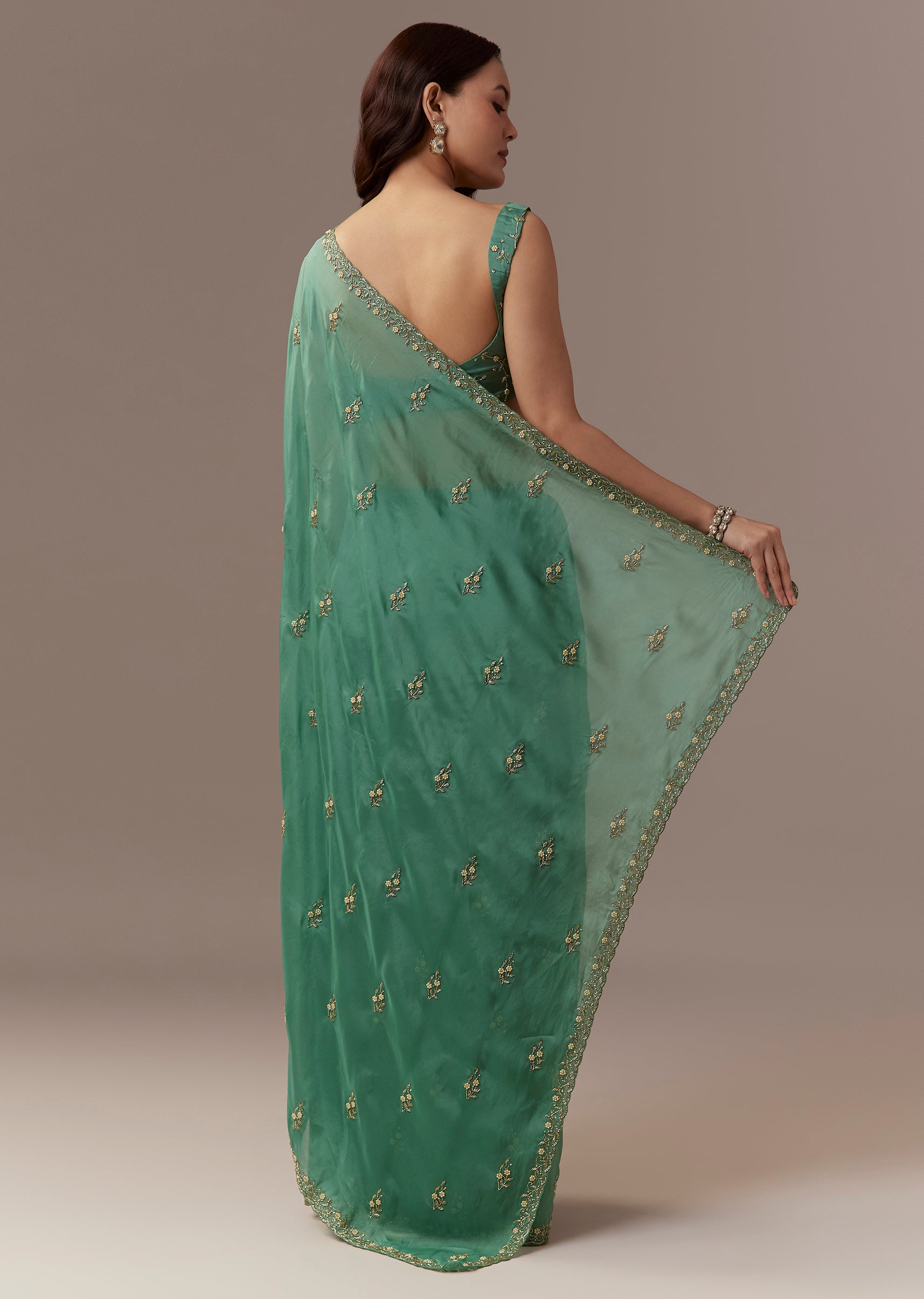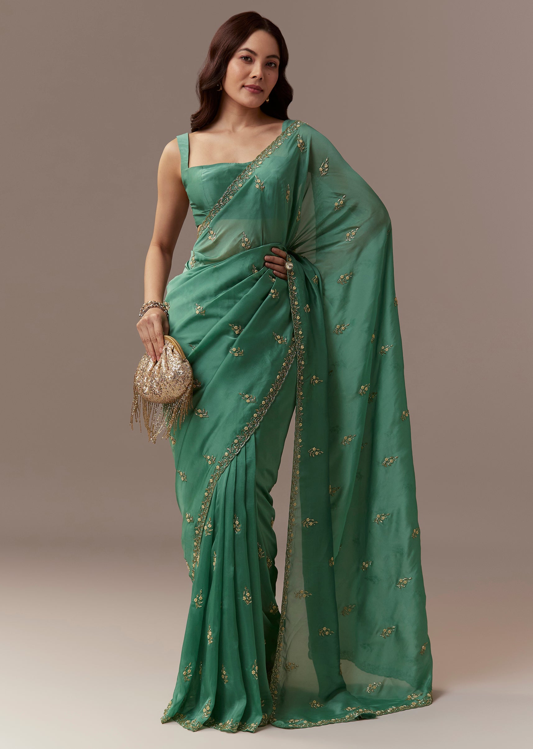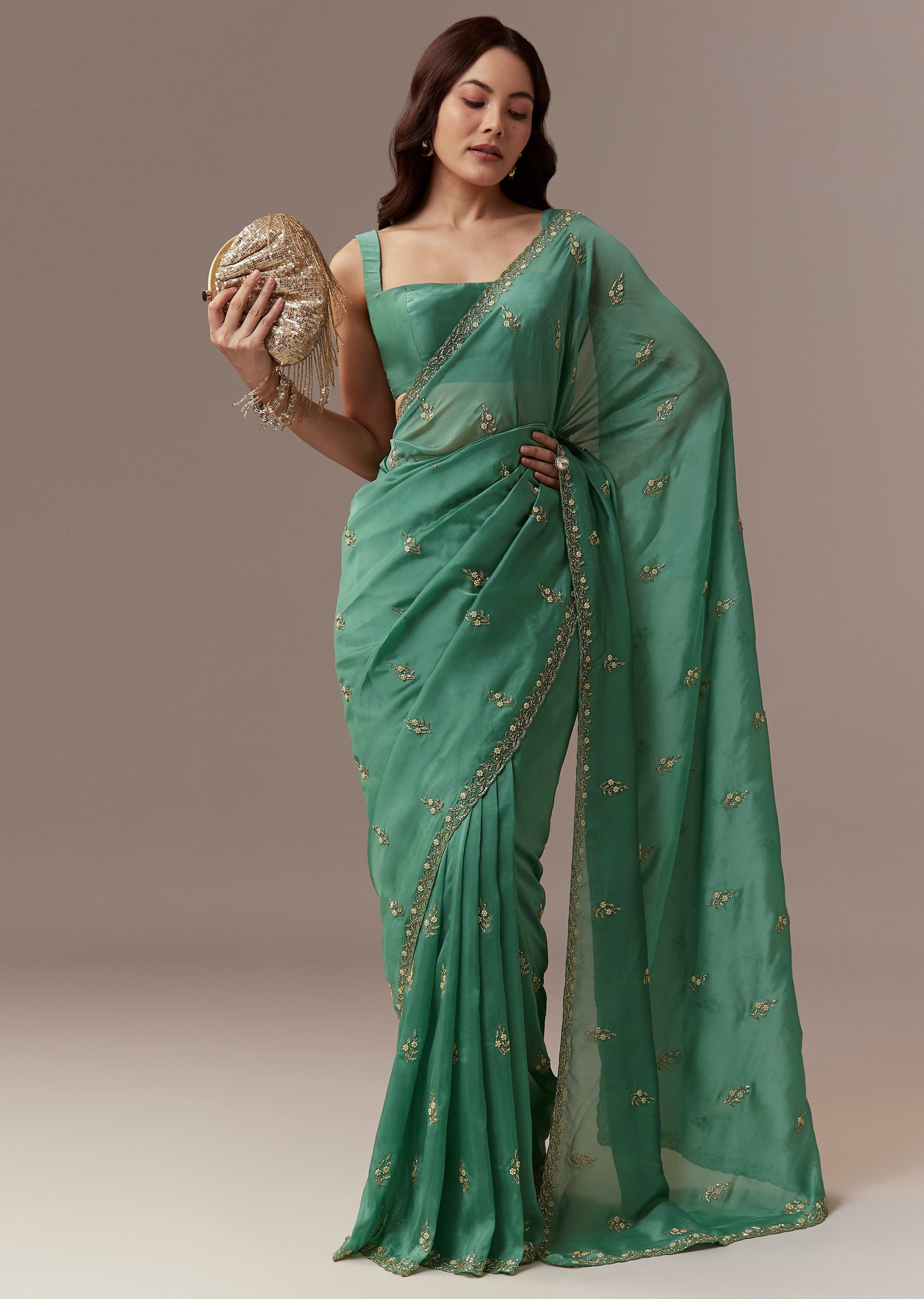 Green Kora Silk Saree With Cutdana Beads And Stone Embroidery