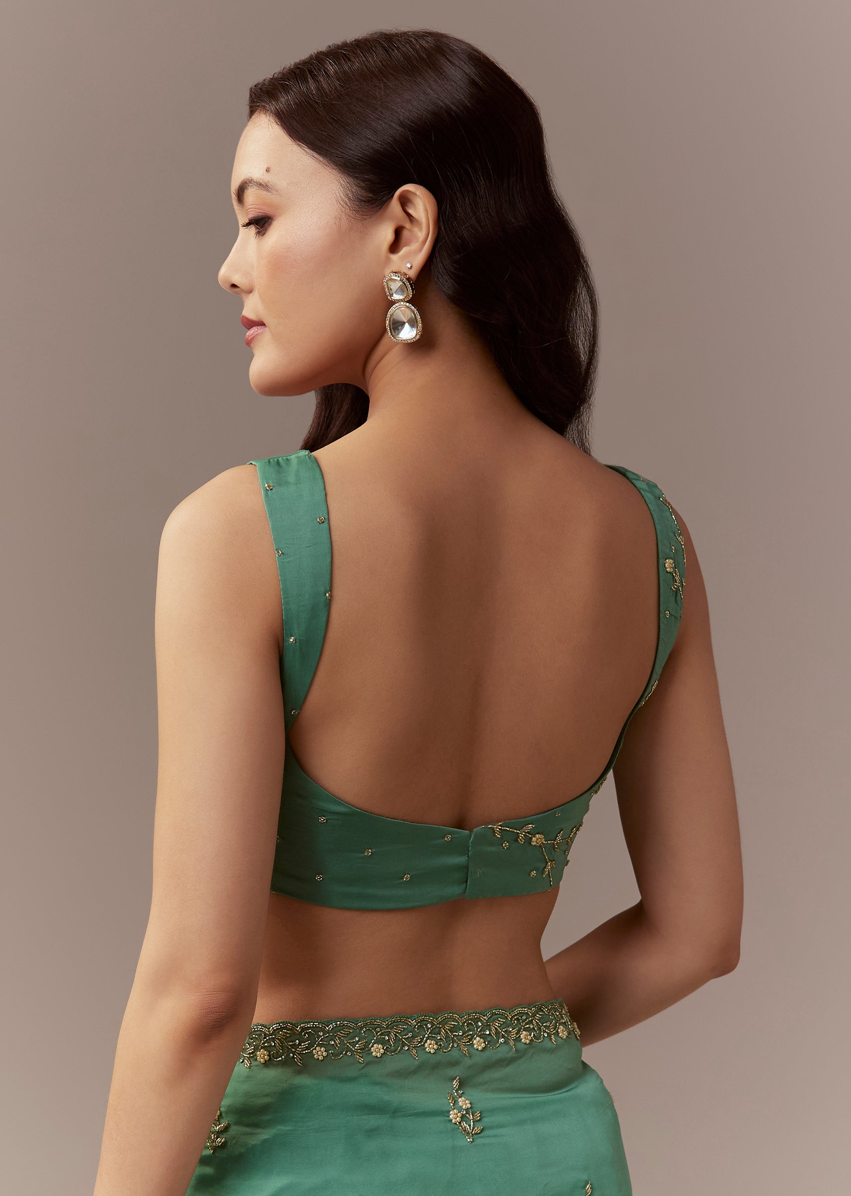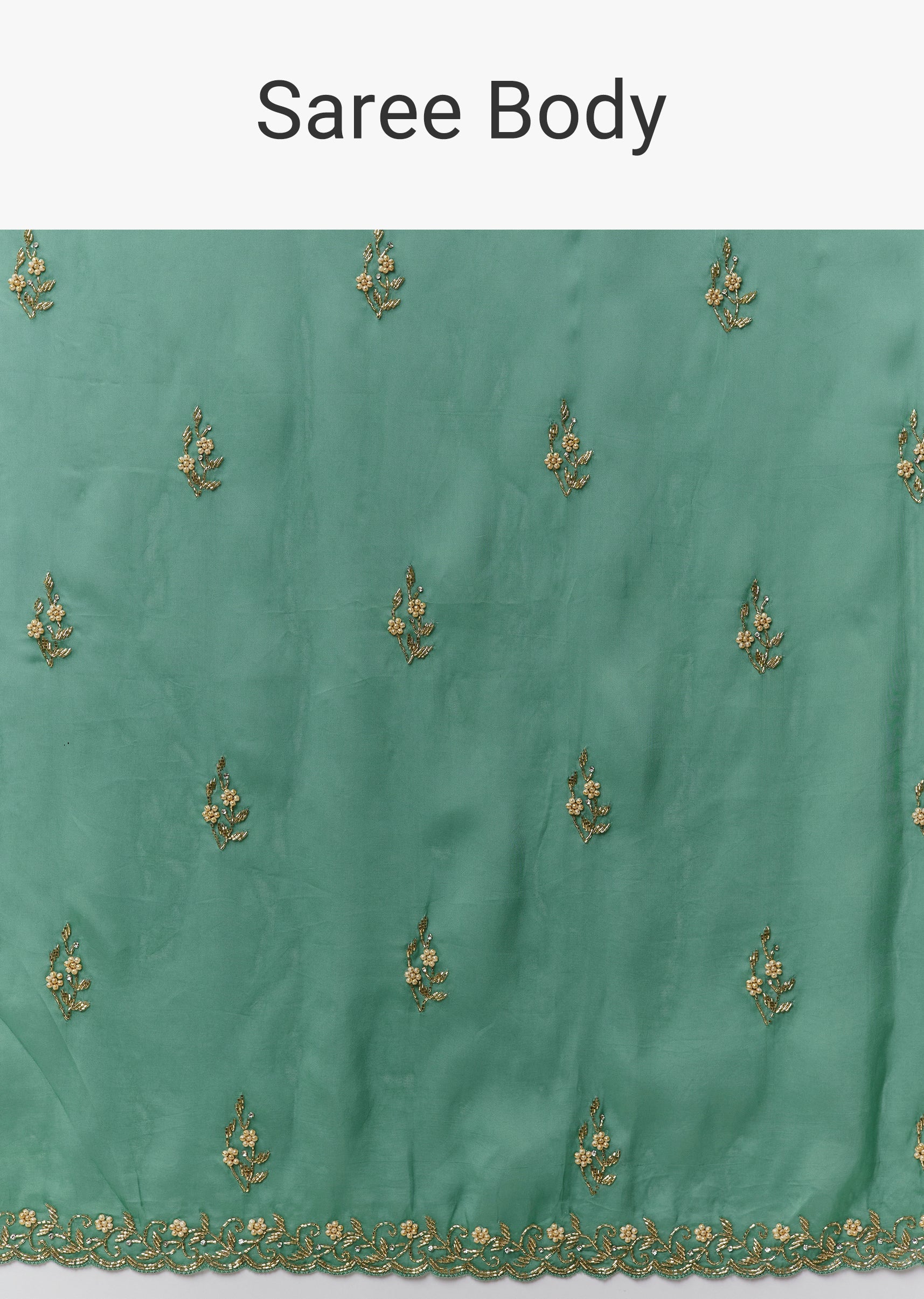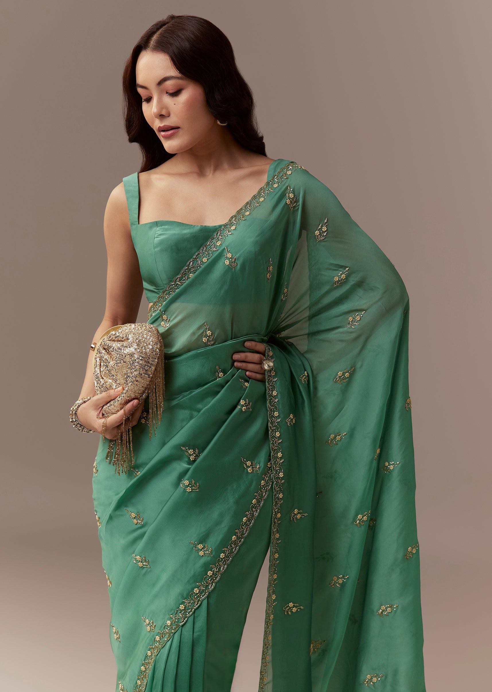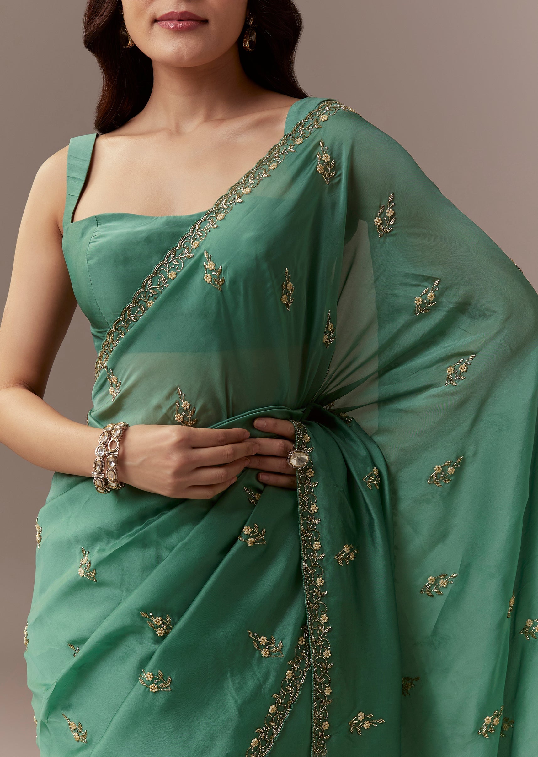 Green Kora Silk Saree With Cutdana Beads And Stone Embroidery