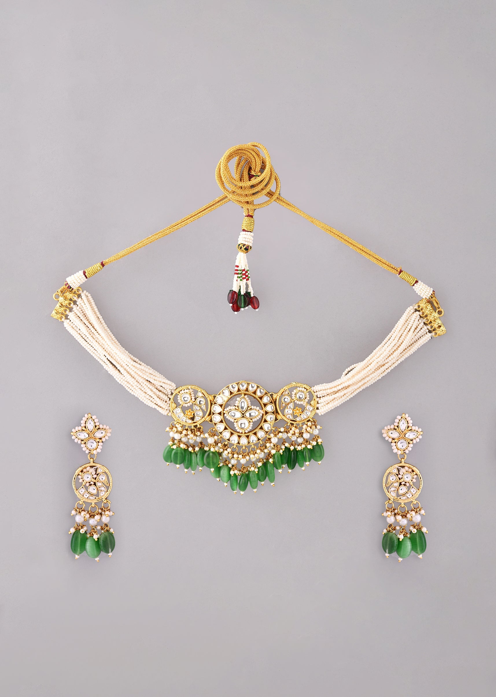 Brighten your festive look with this green kundan pendant necklace and earrings set, accented with elegant bead drops for a refined touch. Perfect for weddings or celebrations, it adds a... More Product Details