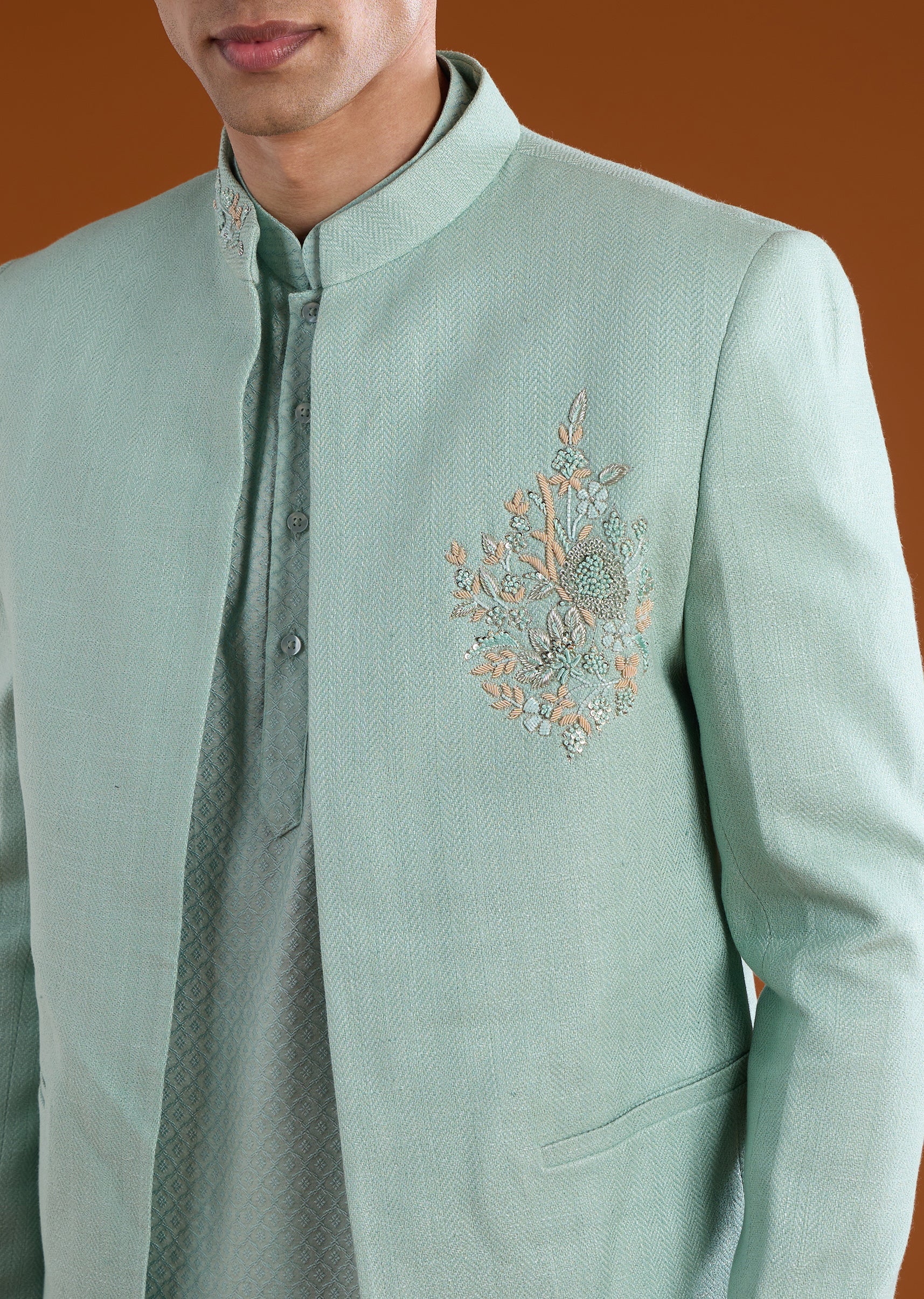 Timeless in character and refined in detail, this matka silk jodhpuri kurta set reflects classic Indian elegance. Crafted in textured matka silk, the kurta is enhanced with subtle thread and resham work that adds understated richness. Full sleeves and a mandarin collar give the silhouette a structured, regal finish. Paired with coordinated pants, this ensemble is ideal for weddings, festive occasions, and traditional celebrations.Awarded as the Most Trusted Brand, we're delivering styles you love, just as promised.