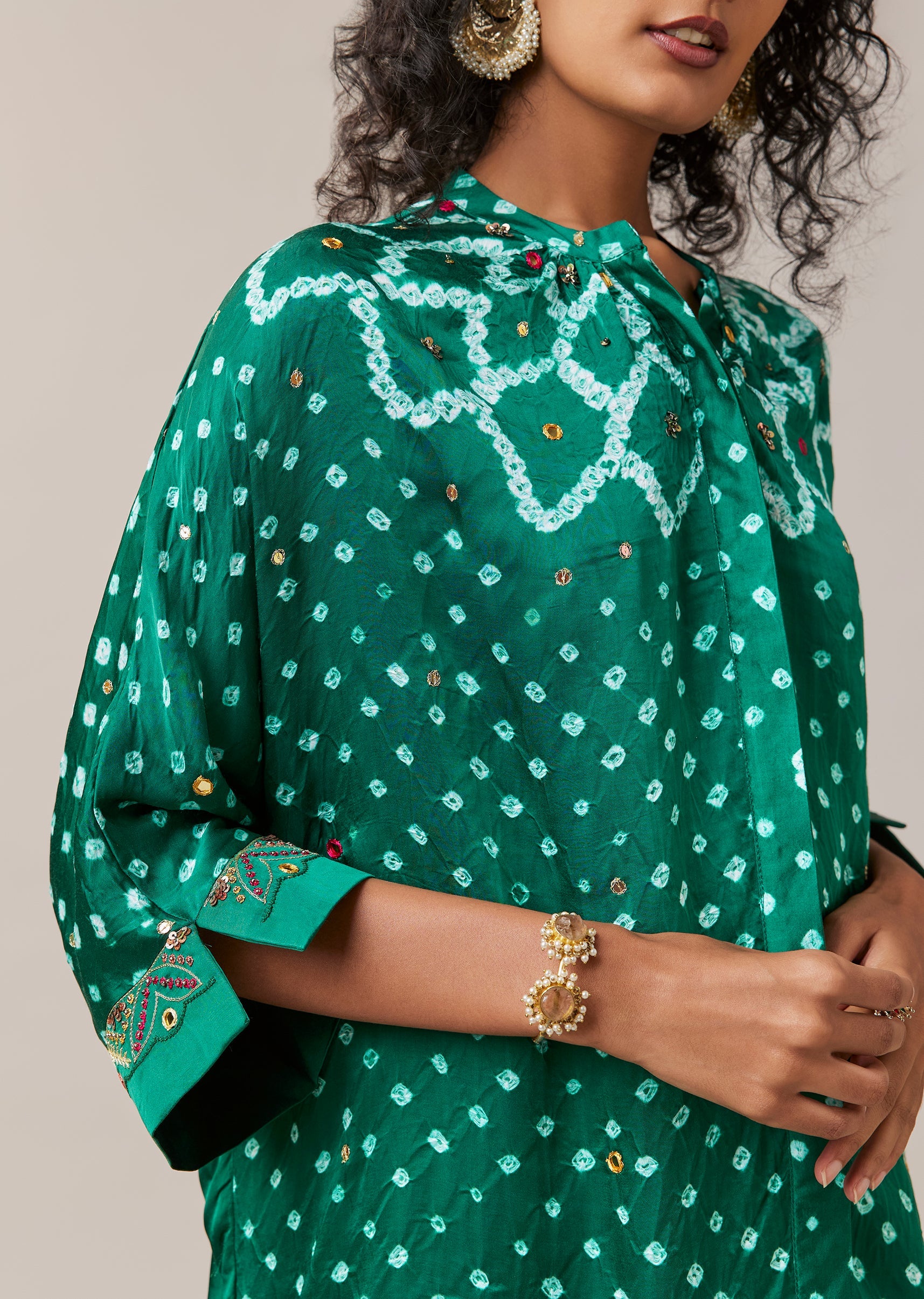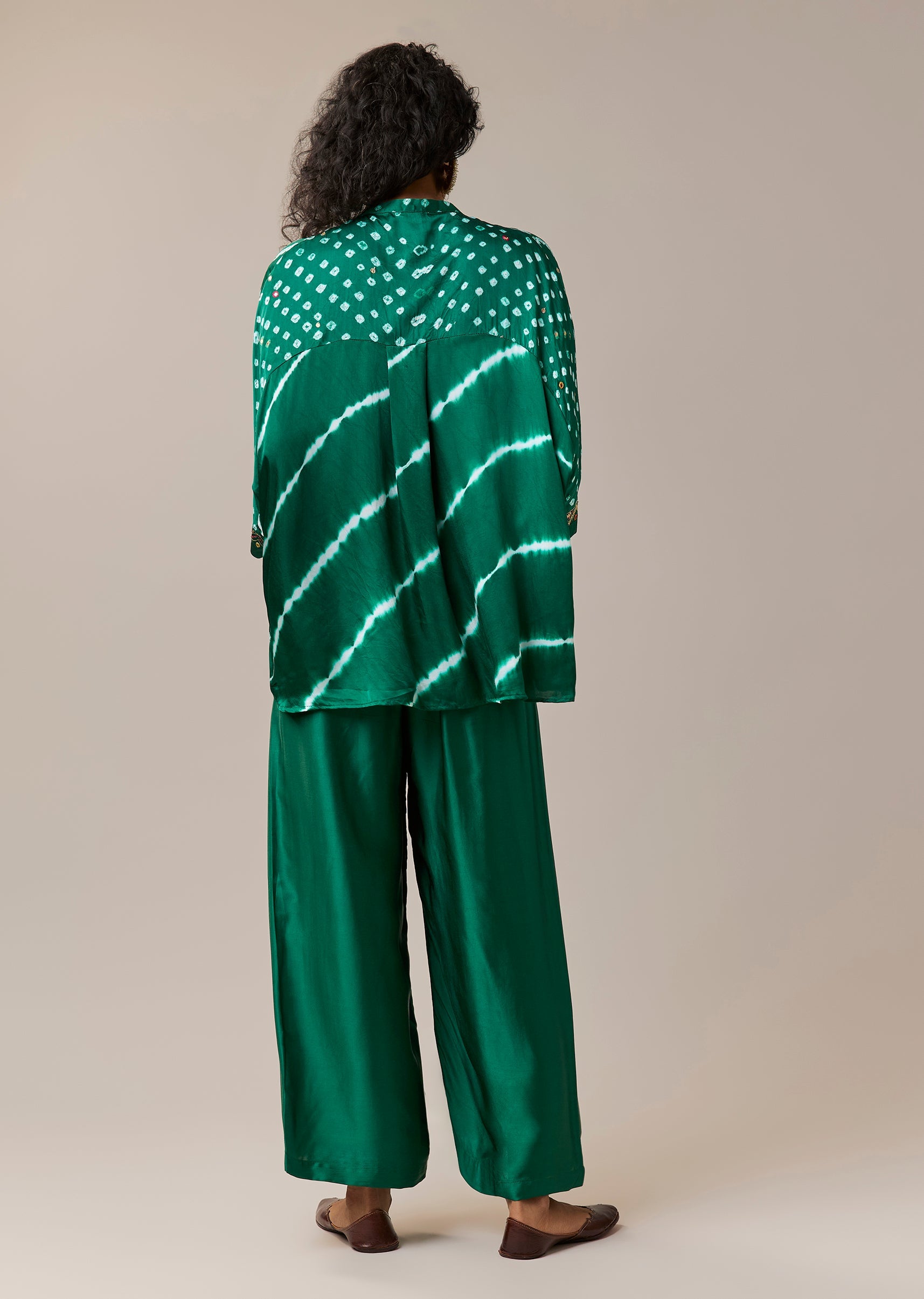 Green Mirror Work Hand Dyed Bandhani and Leheriya Pant Set