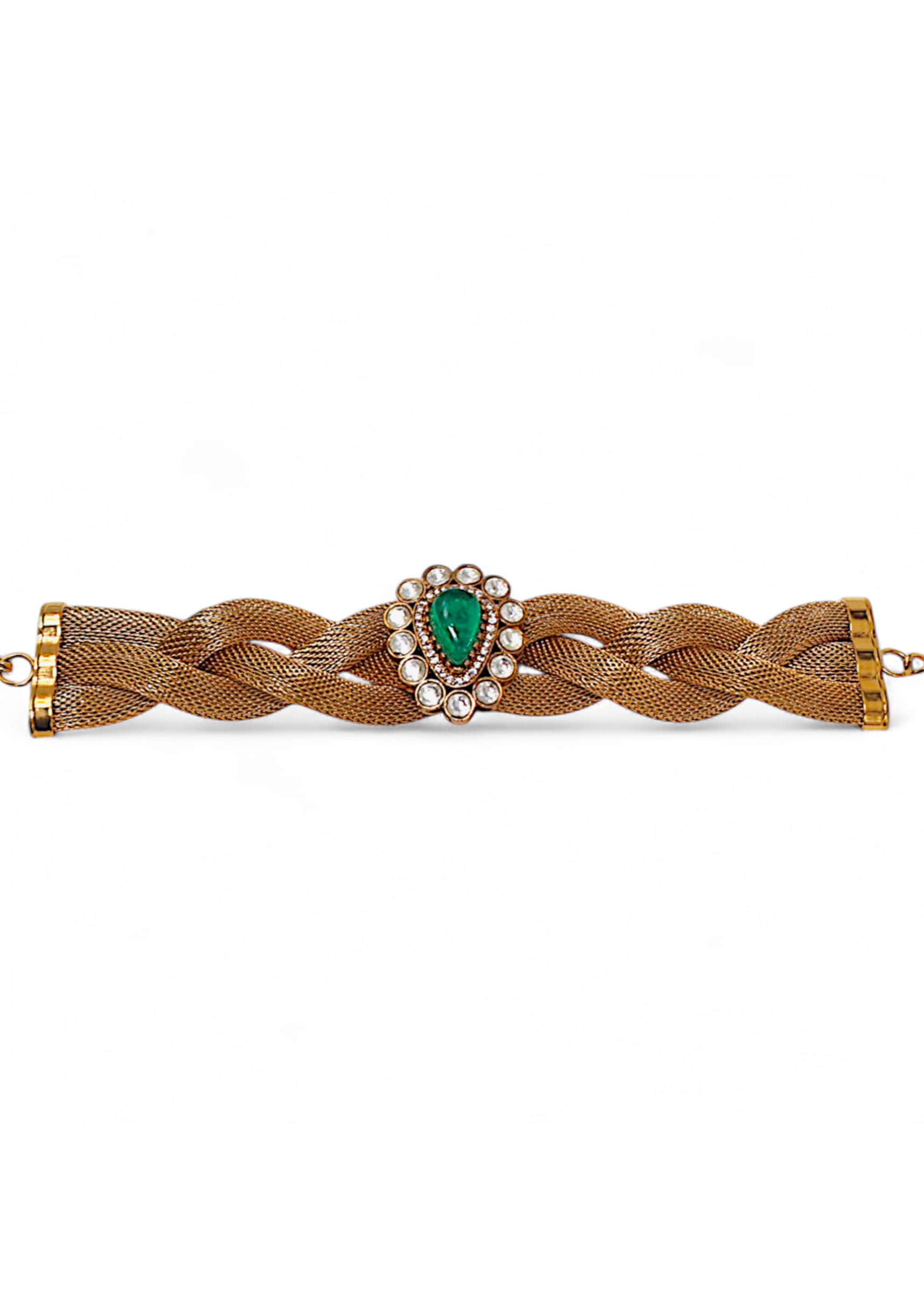 A green modern polki bracelet featuring vibrant stones and contemporary design, adding a chic yet traditional touch. Perfect for enhancing festive, bridal, or ethnic outfits with a pop of color.... More Product Details