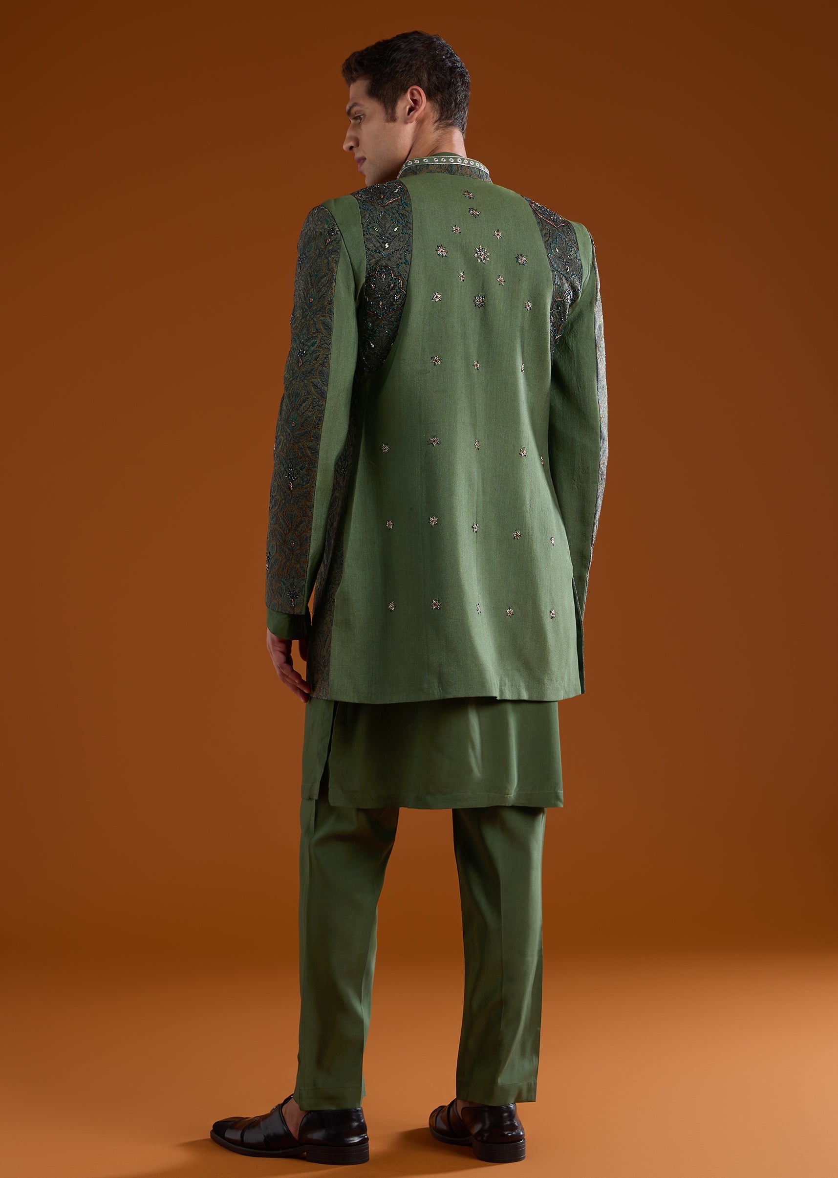 Pair with classic mojaris or loafers and keep styling minimal to let the jacket detailing stand out.
