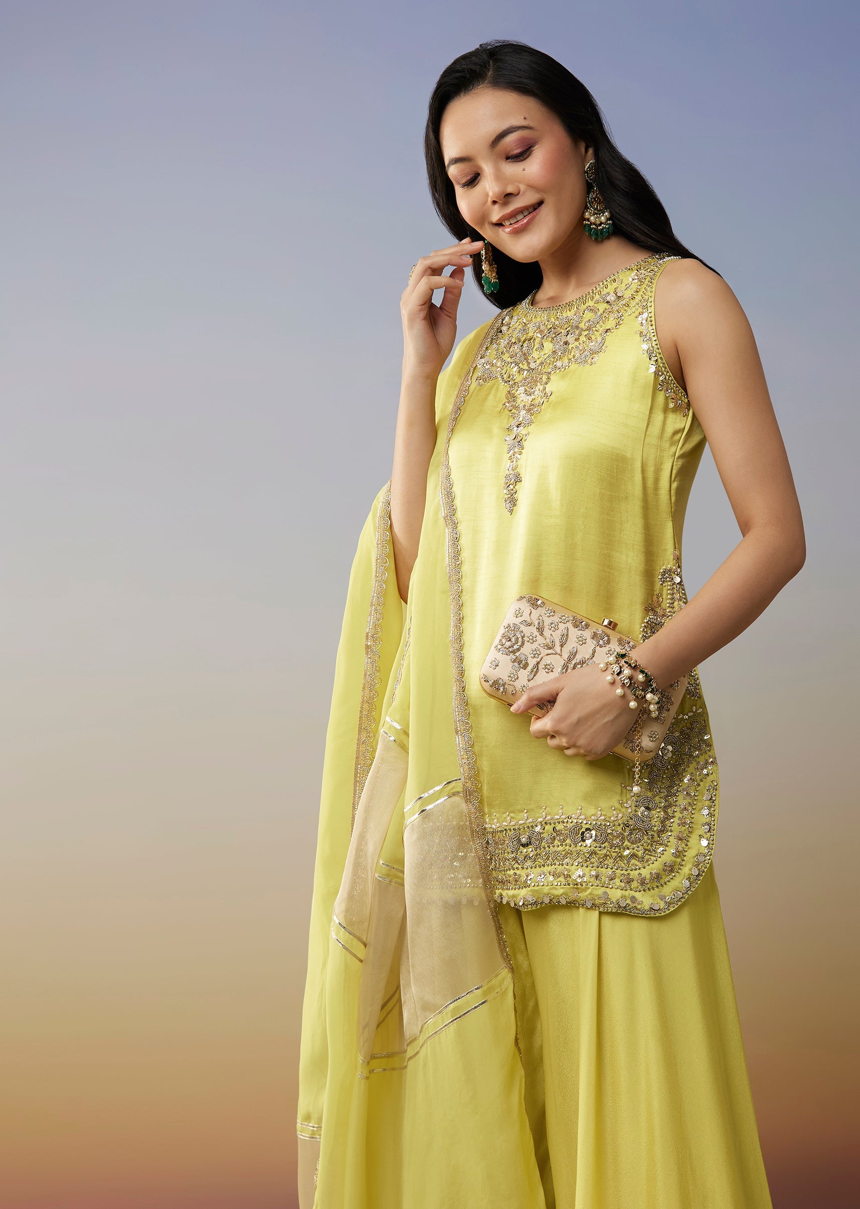 This green palazzo suit brings a refreshing color pop to engagement haldi and mehendi celebrations perfect for bridesmaids or wedding guests. Crafted in a satin primary fabric with a chinnon... More Product Details