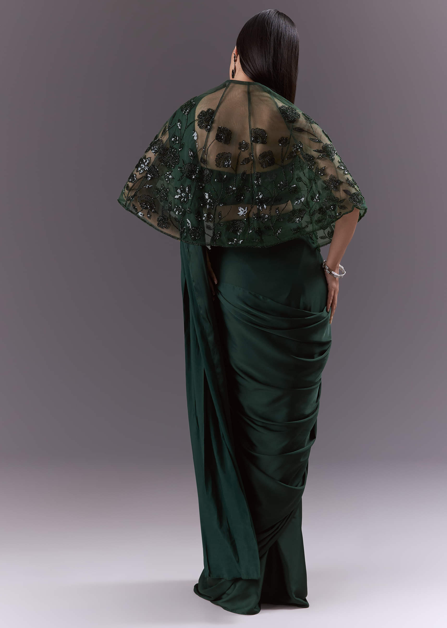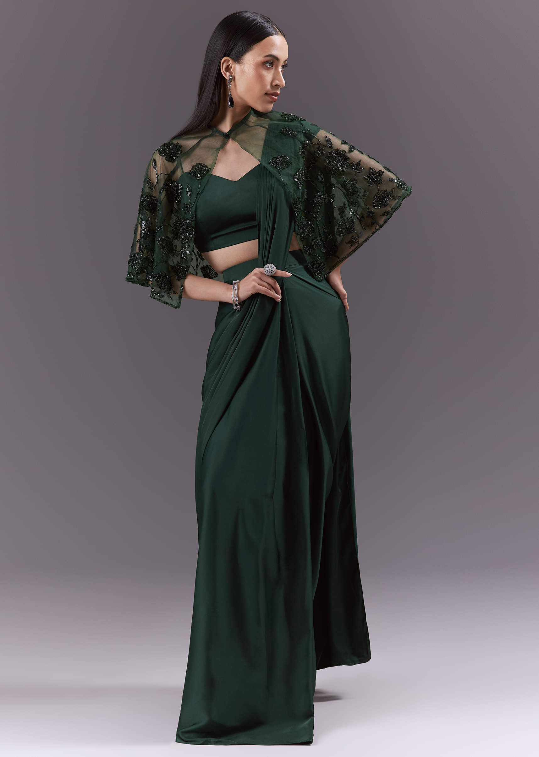 For a minimalist take on shine, this green satin ready pleated saree pairs a pre-stitched drape with a coordinating blouse and a light cape for extra flourish. The satin sheen... More Product Details