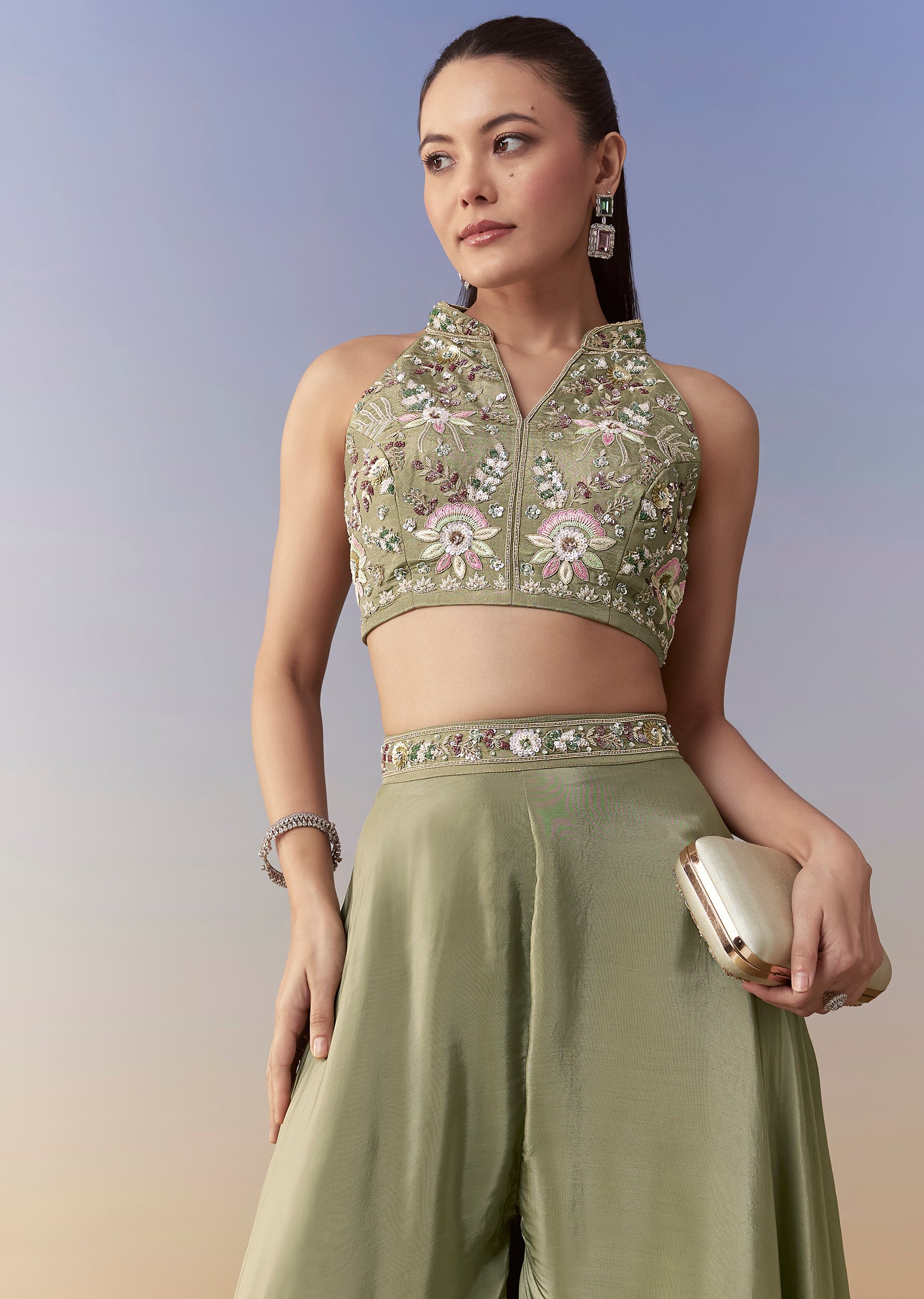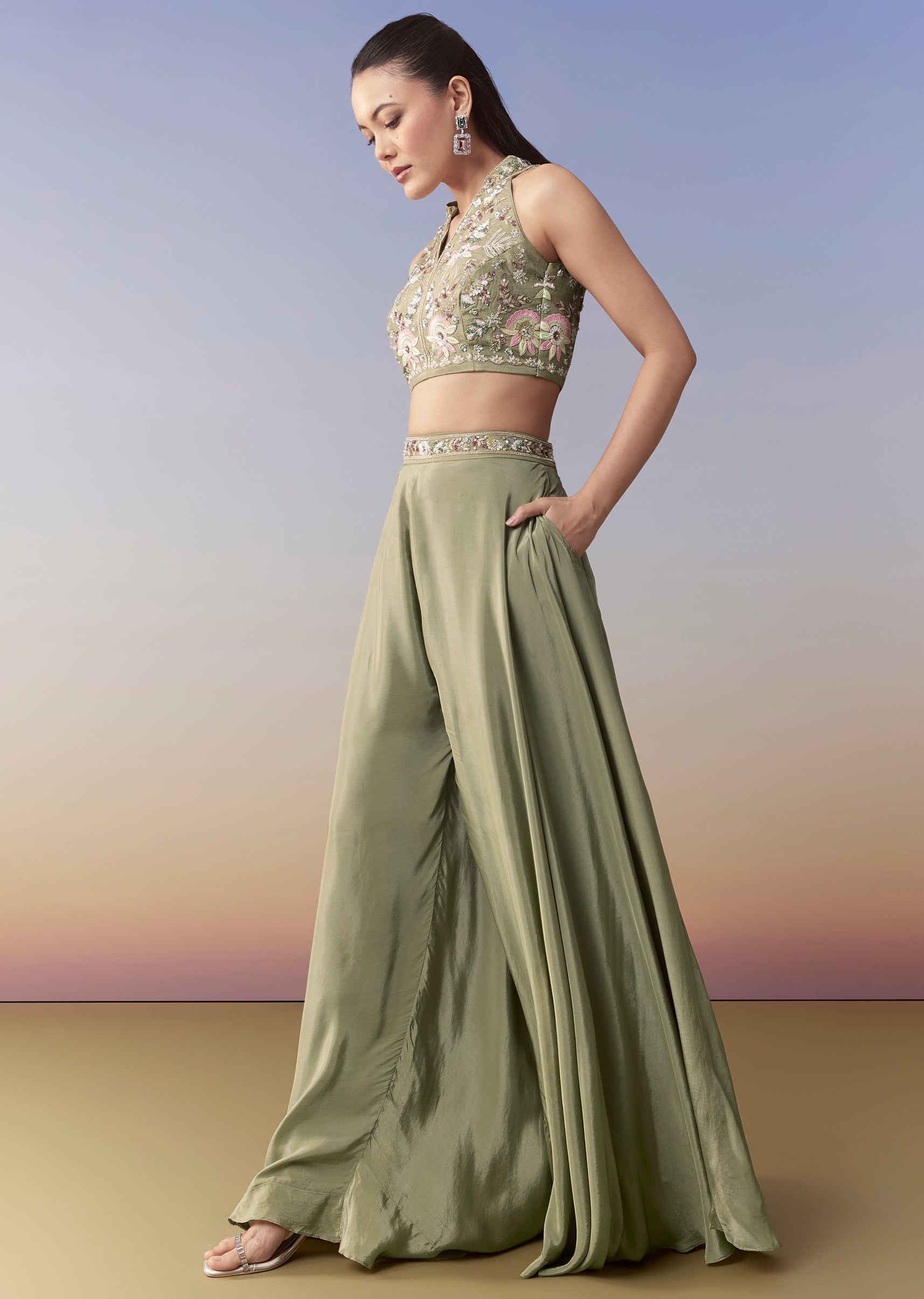 Step into contemporary elegance with this green palazzo set, featuring a chic crop top embellished with sequin and resham work for a refined festive shimmer. The fancy-cut crop top adds... More Product Details