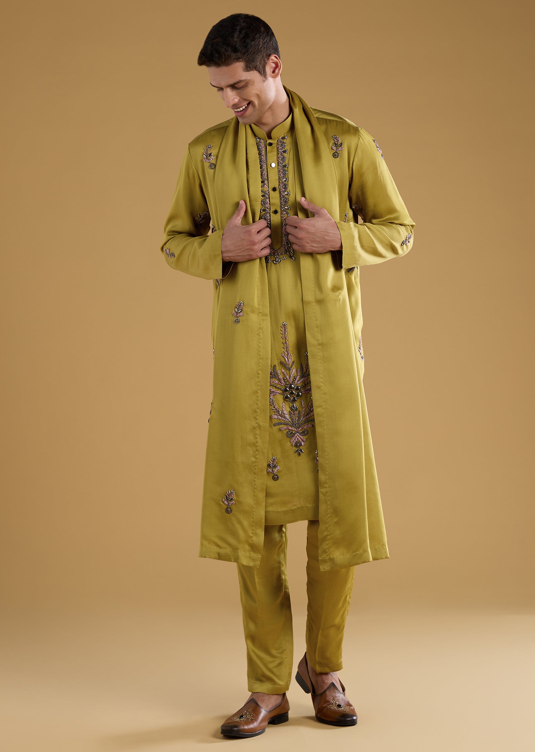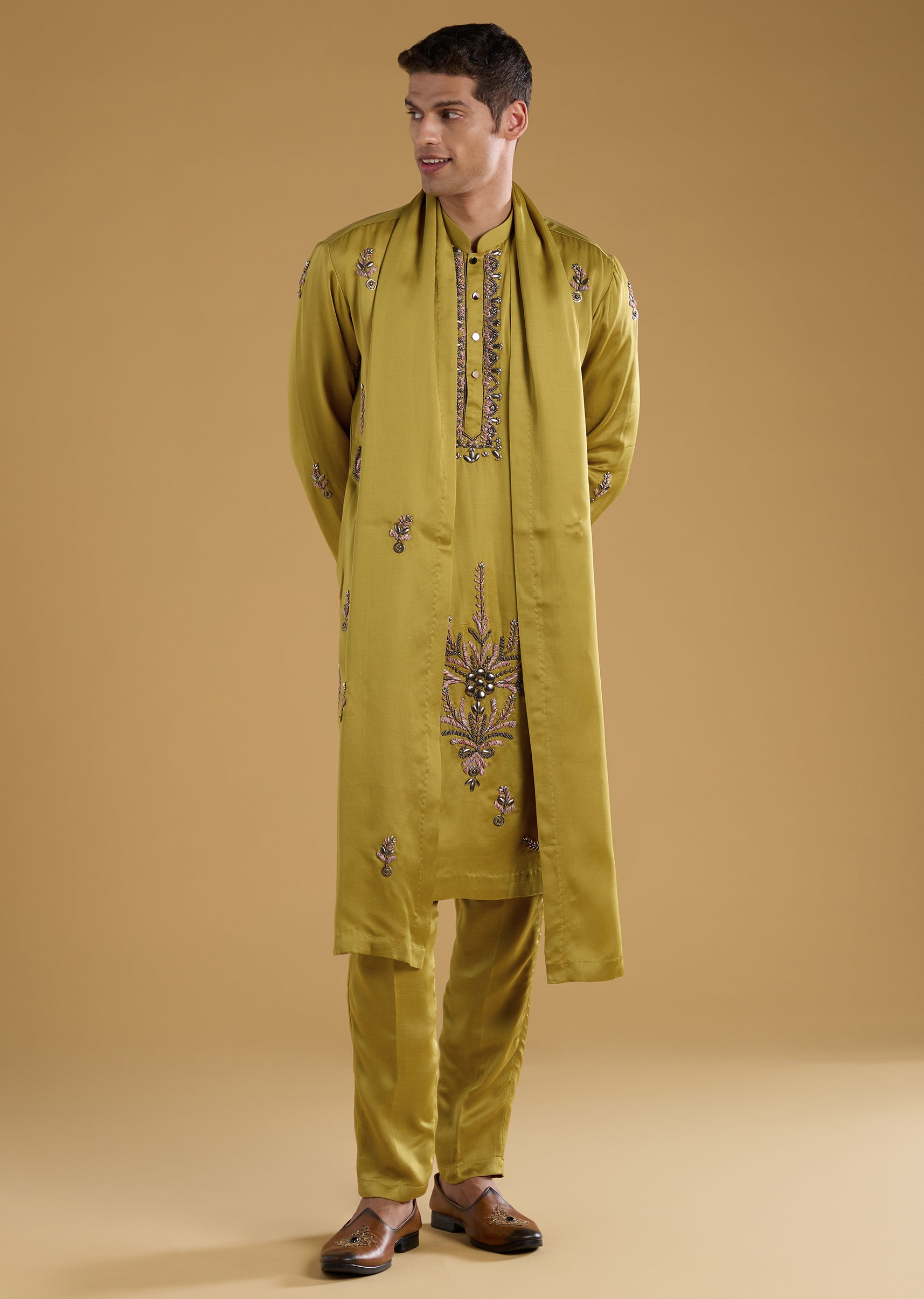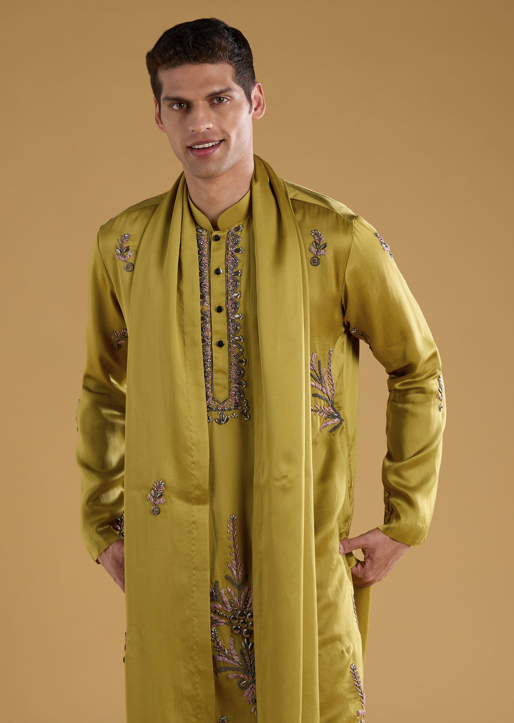 Green Silk Bead Work Men's Kurta Set with Dupatta