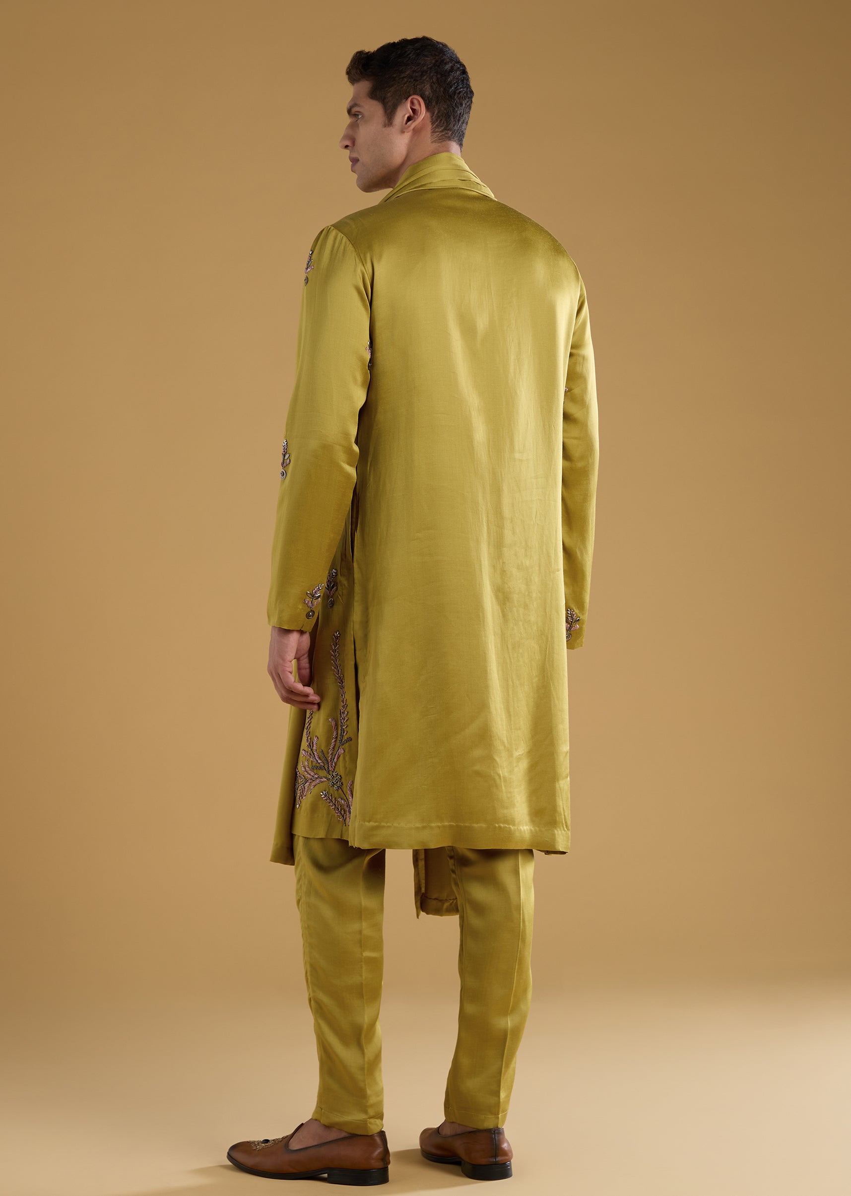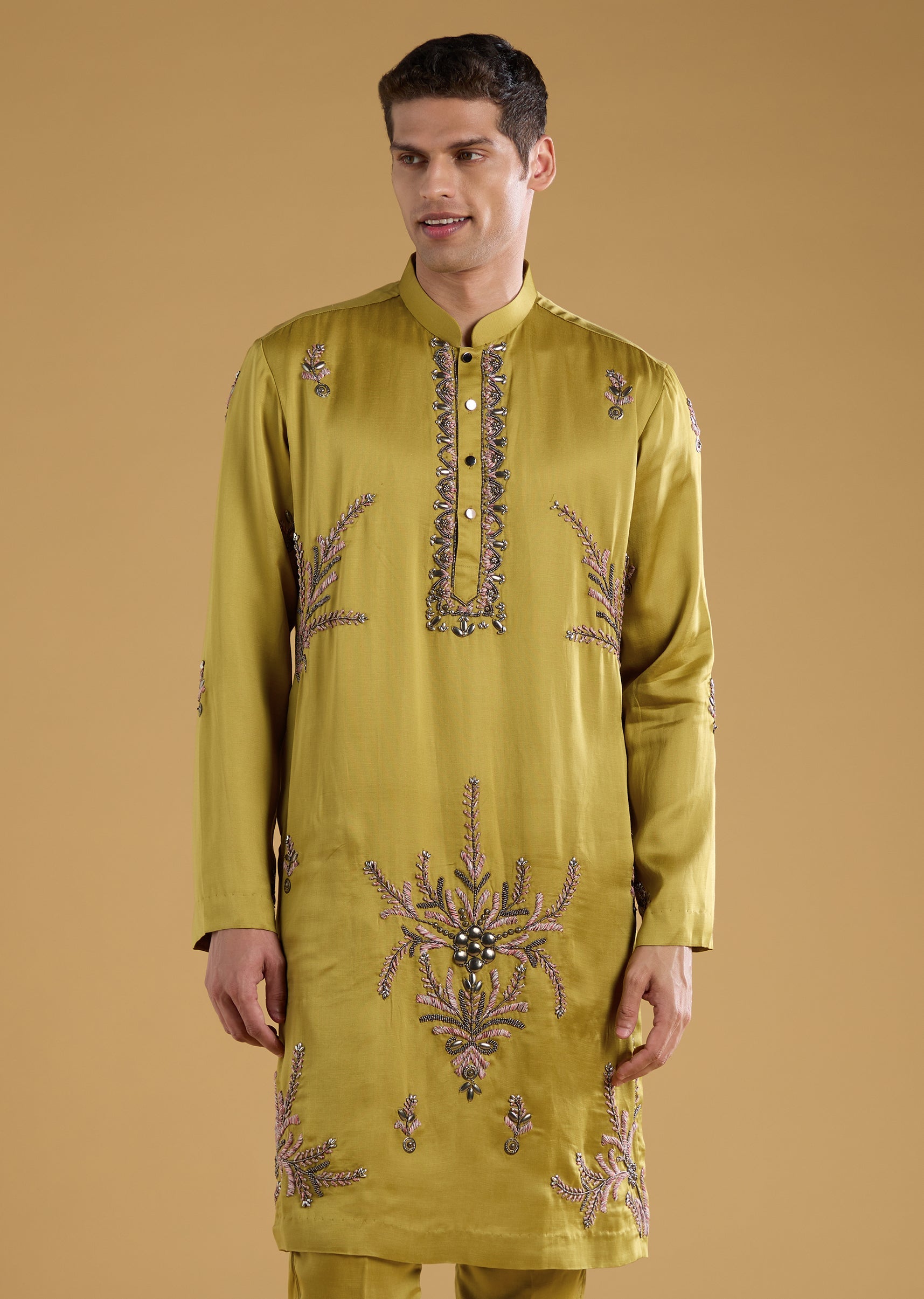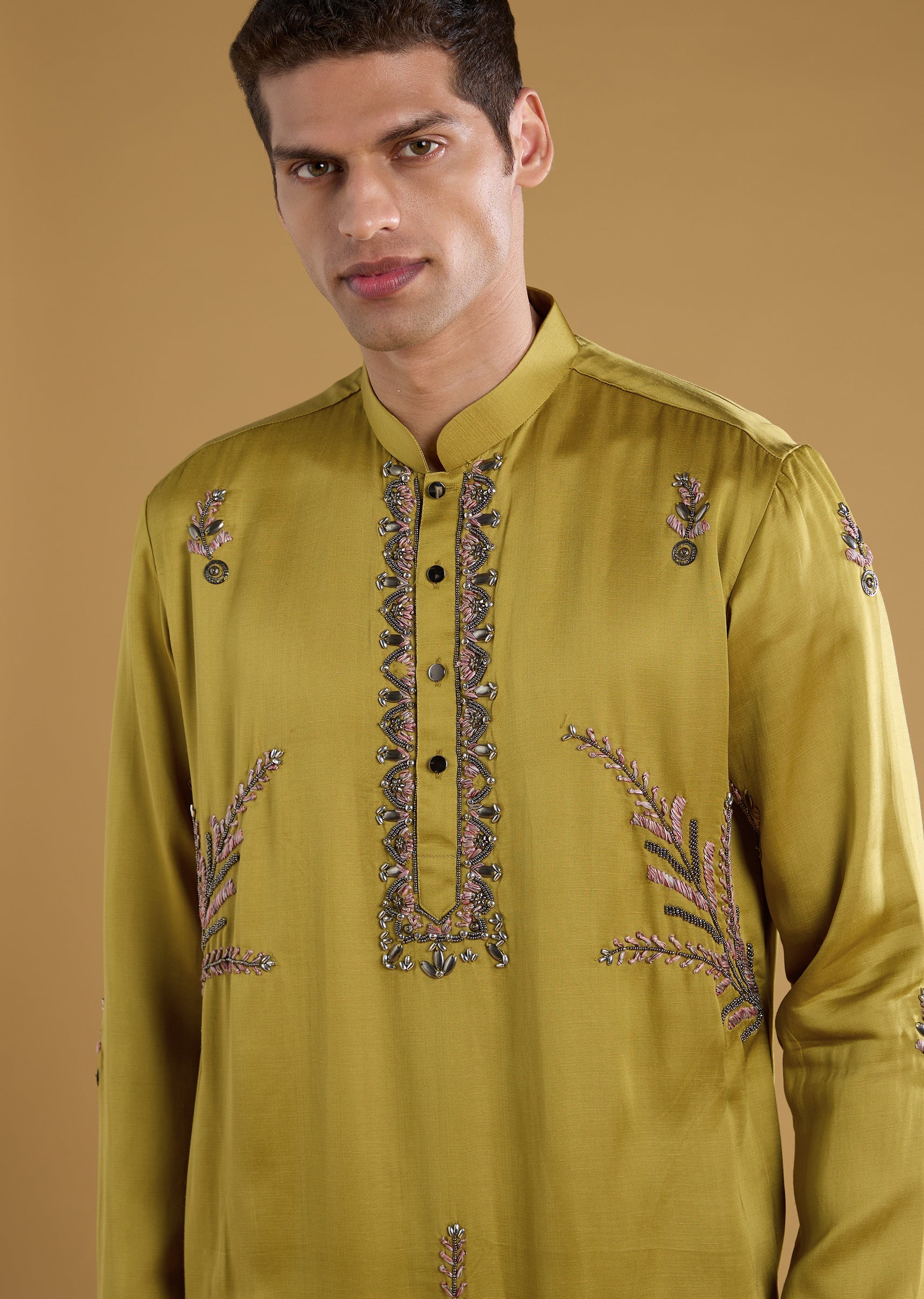Blending silk richness with art silk finesse, this kurta set stands out with unique resham embroidery elevated by bead and metal accents for a modern festive sparkle. The mandarin collar... More Product Details