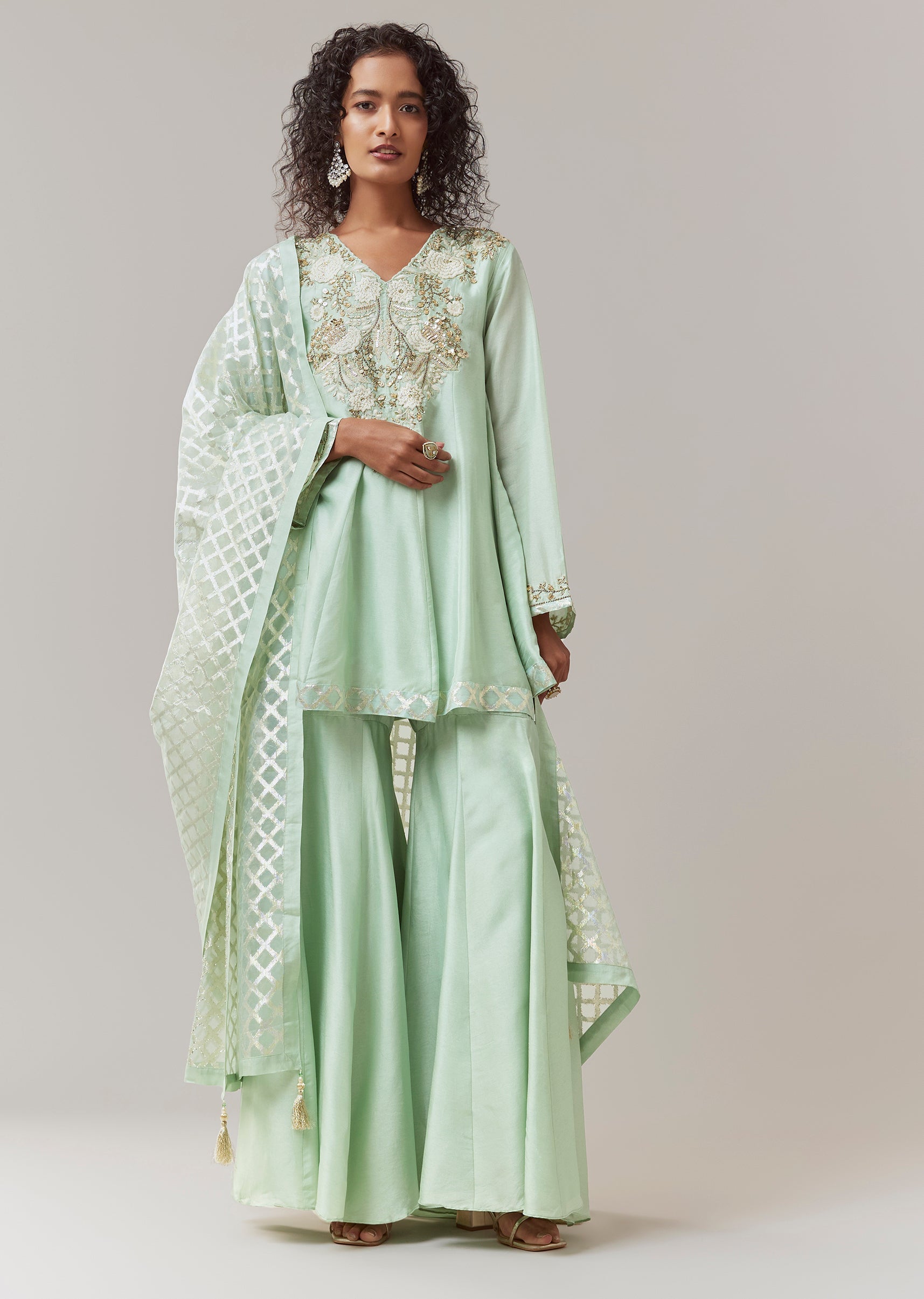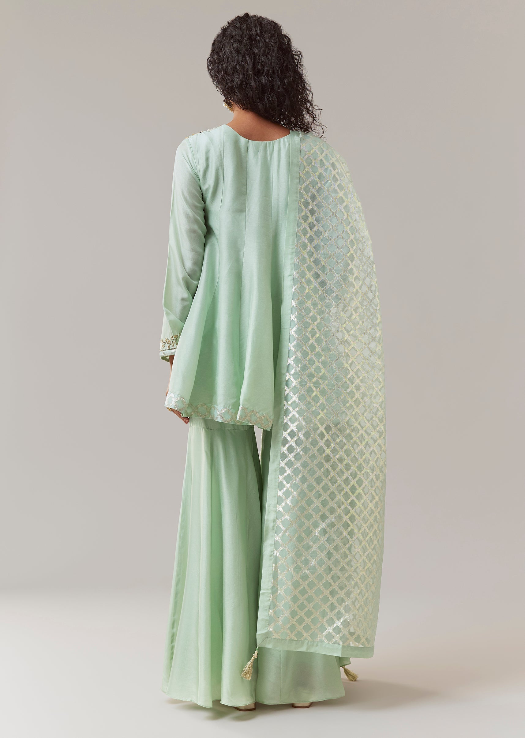 Green Silk Embroidered Kurta Sharara Set