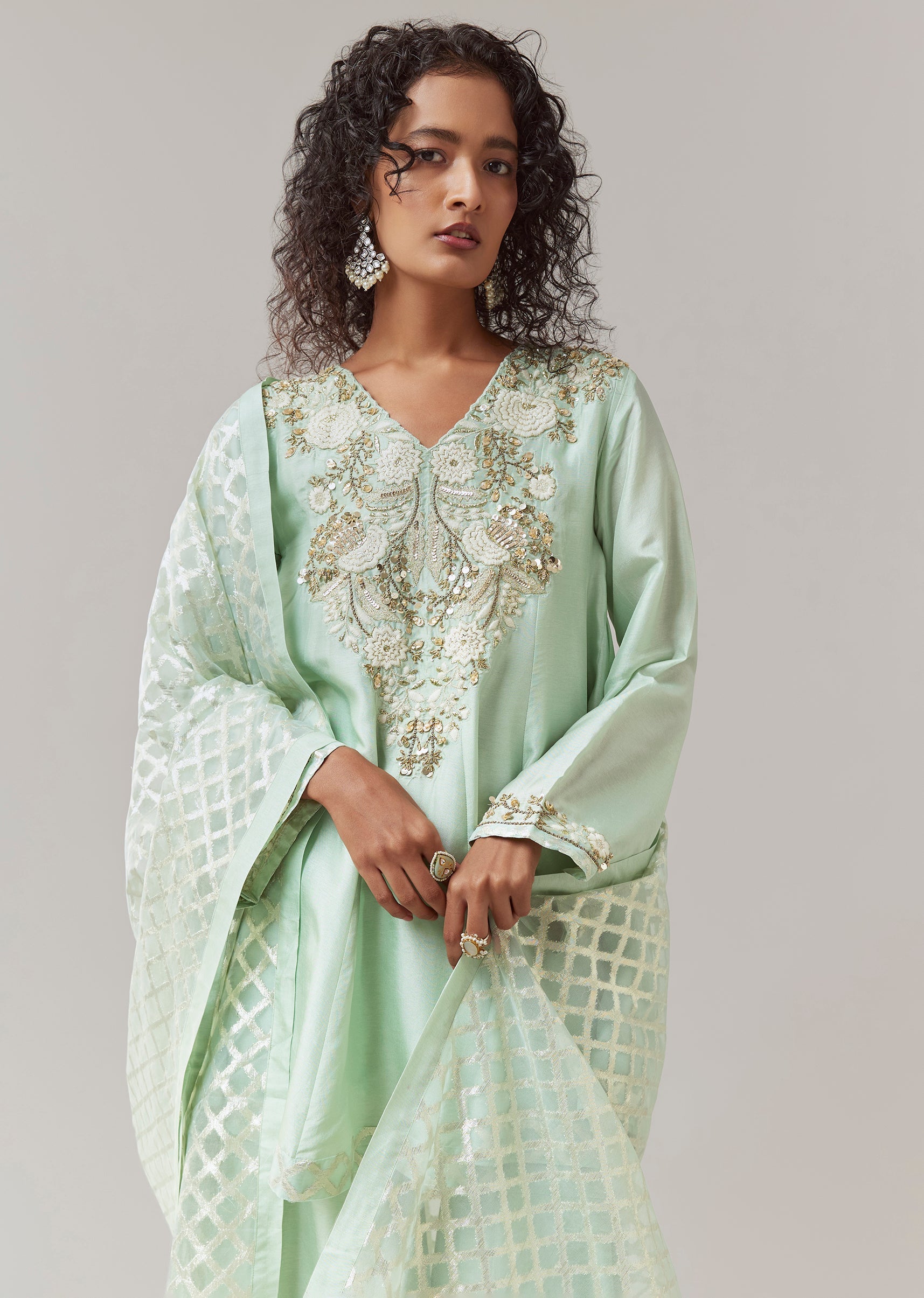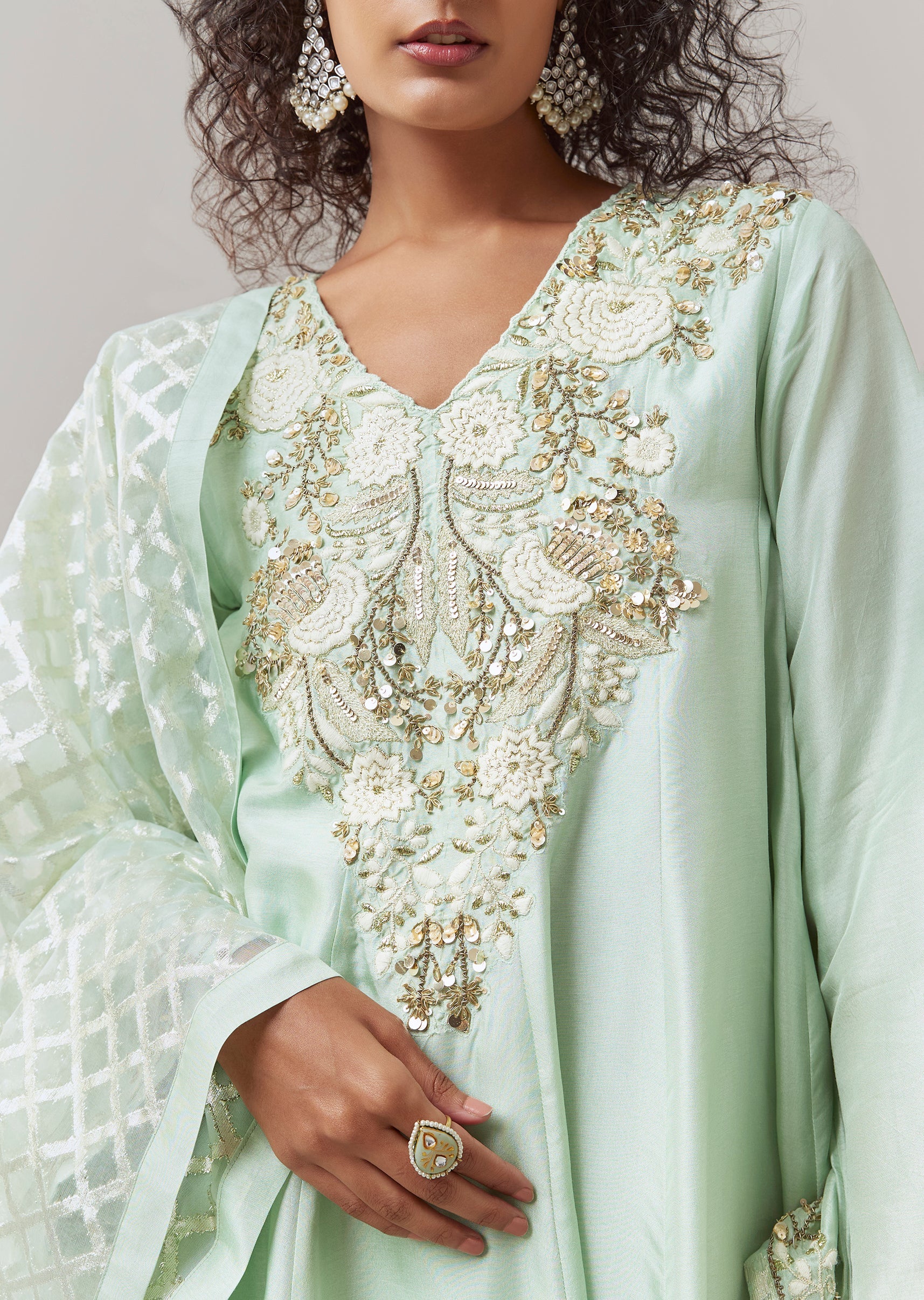 Enhance the elegant feel with delicate jhumkas and embellished heels, keeping makeup soft and glowing for a refined festive look.