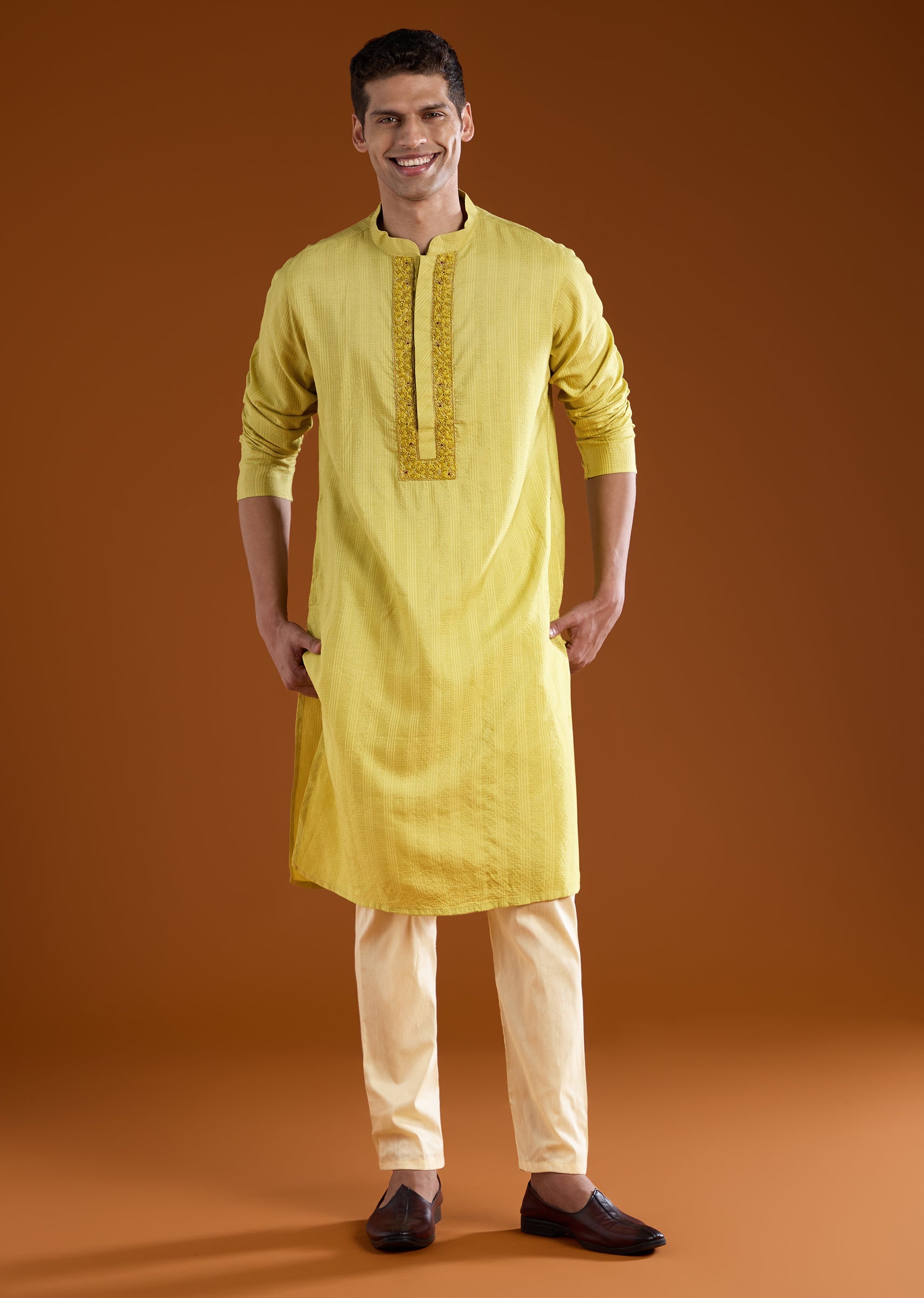 Bring classic sophistication to any festive occasion with this silk kurta set enriched with refined resham thread work that adds subtle traditional detailing. The full sleeve kurta features a mandarin collar and a front hook eye closure, offering a graceful and timeless silhouette. Paired with comfortable drawstring pants, the ensemble provides effortless elegance for weddings, cultural ceremonies, and family celebrations. Awarded as the Most Trusted Brand, we're delivering styles you love, just as promised.