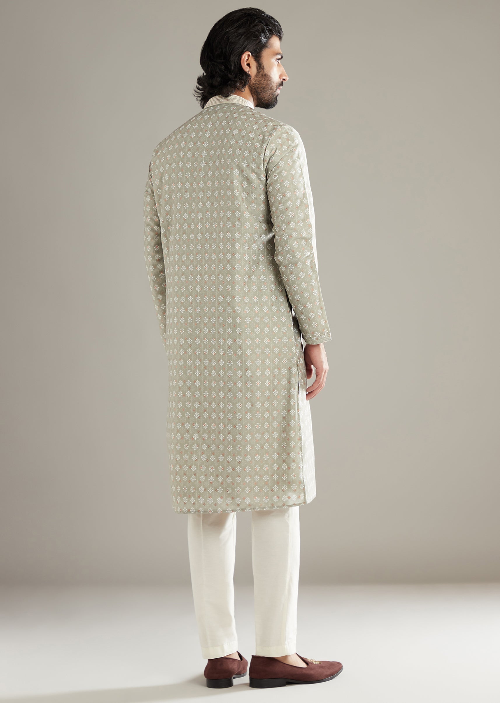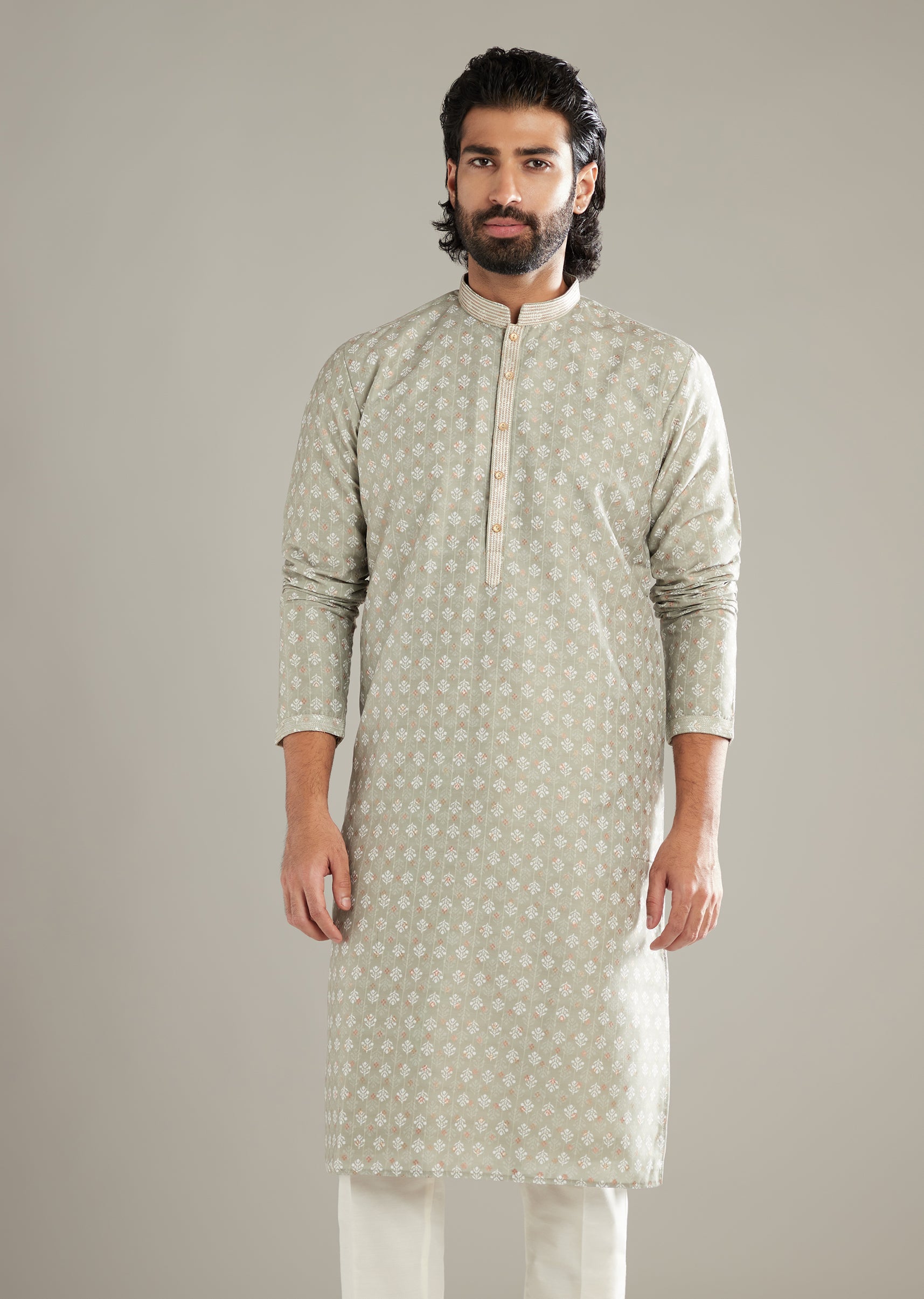 Fresh and versatile, this tea green art silk men’s kurta set carries printed motifs that sit cleanly on a smooth base. The tone feels calm yet festive-friendly. Reach for it... More Product Details