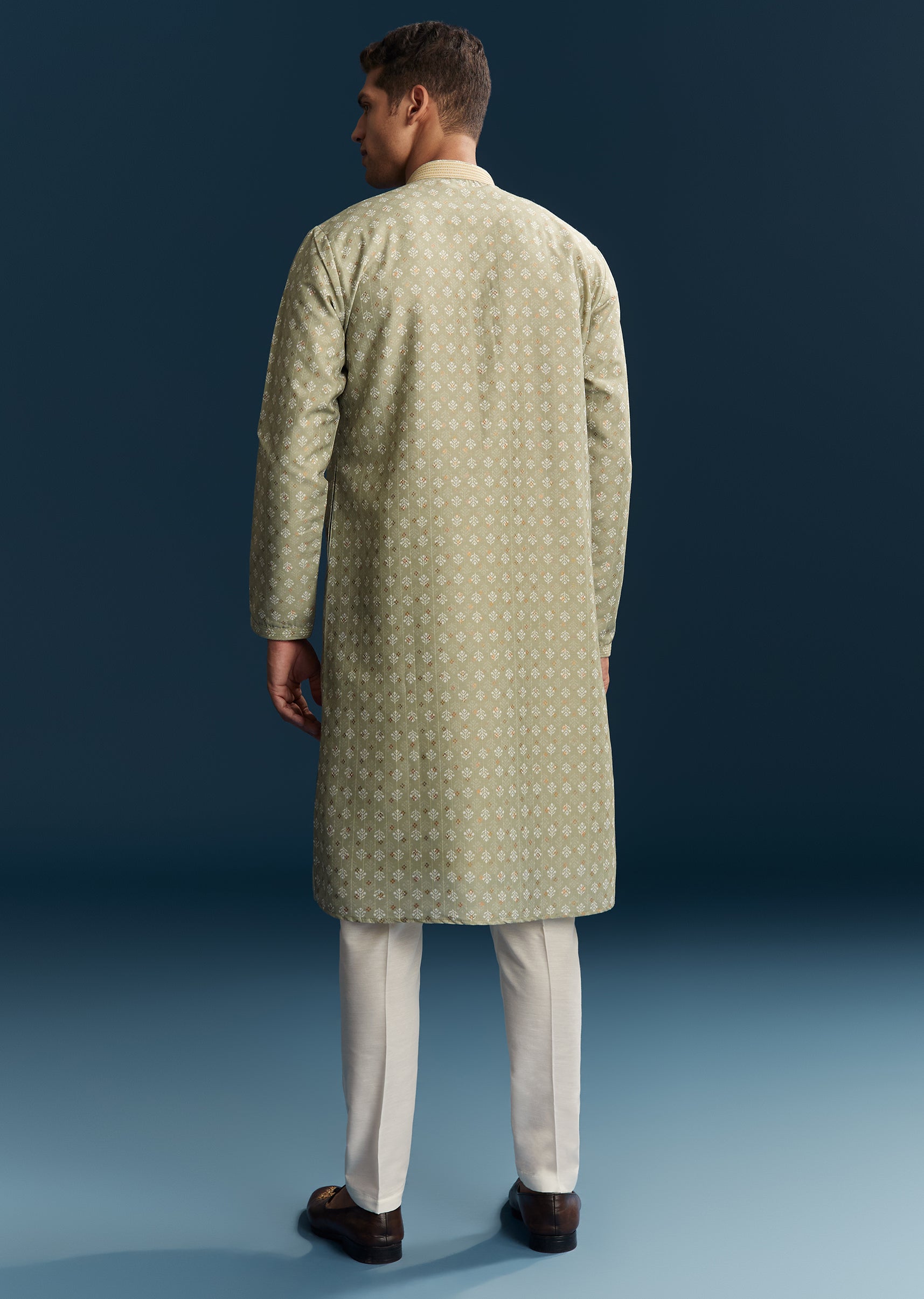 Fresh and understated, this green men’s kurta set in soft pastels is perfect for casual festive occasions. Crafted in smooth silk fabric, it features minimal thread detailing that adds subtle... More Product Details