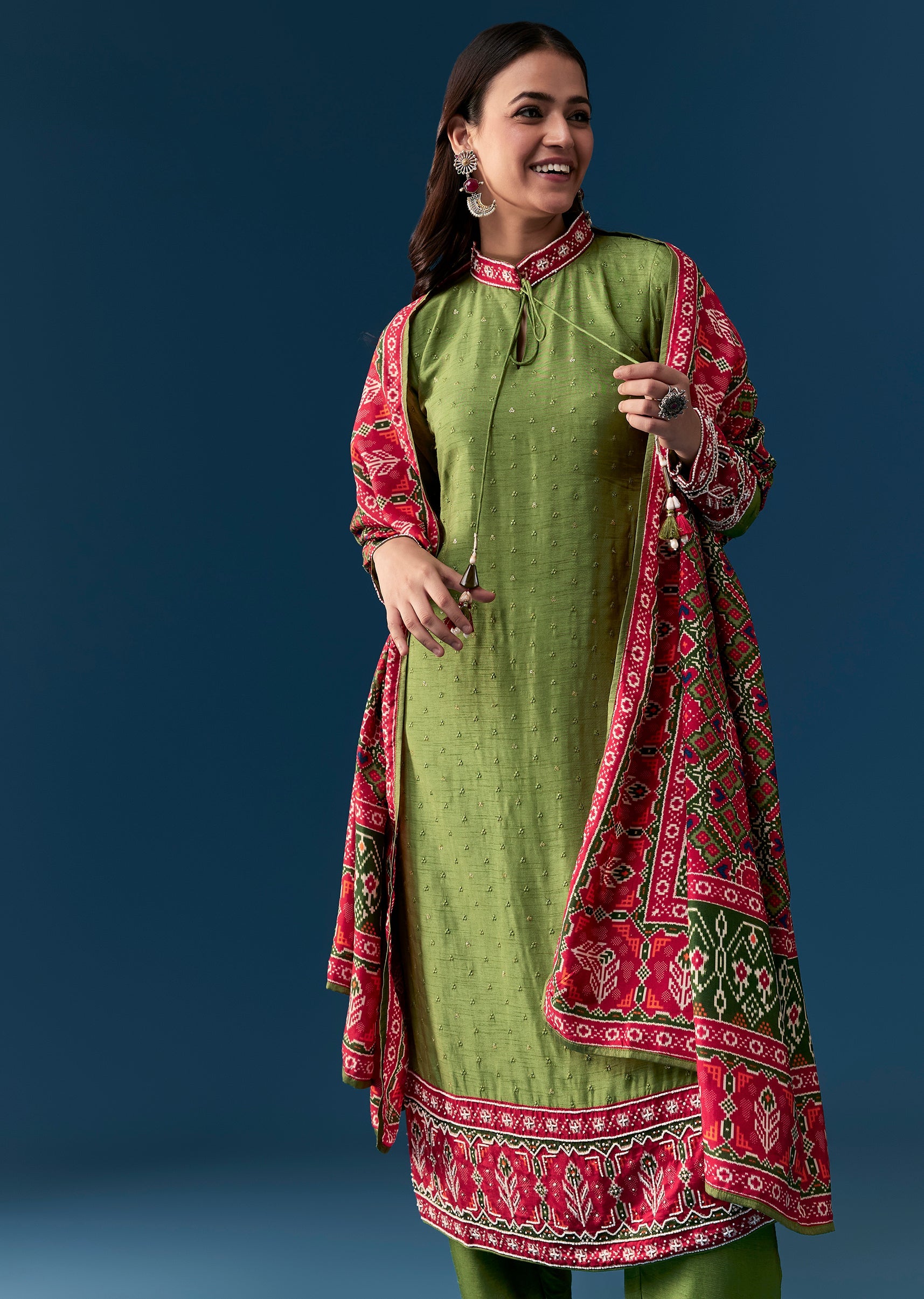 Green Silk Kurta Set With Resham Butti And Cut Dana Work