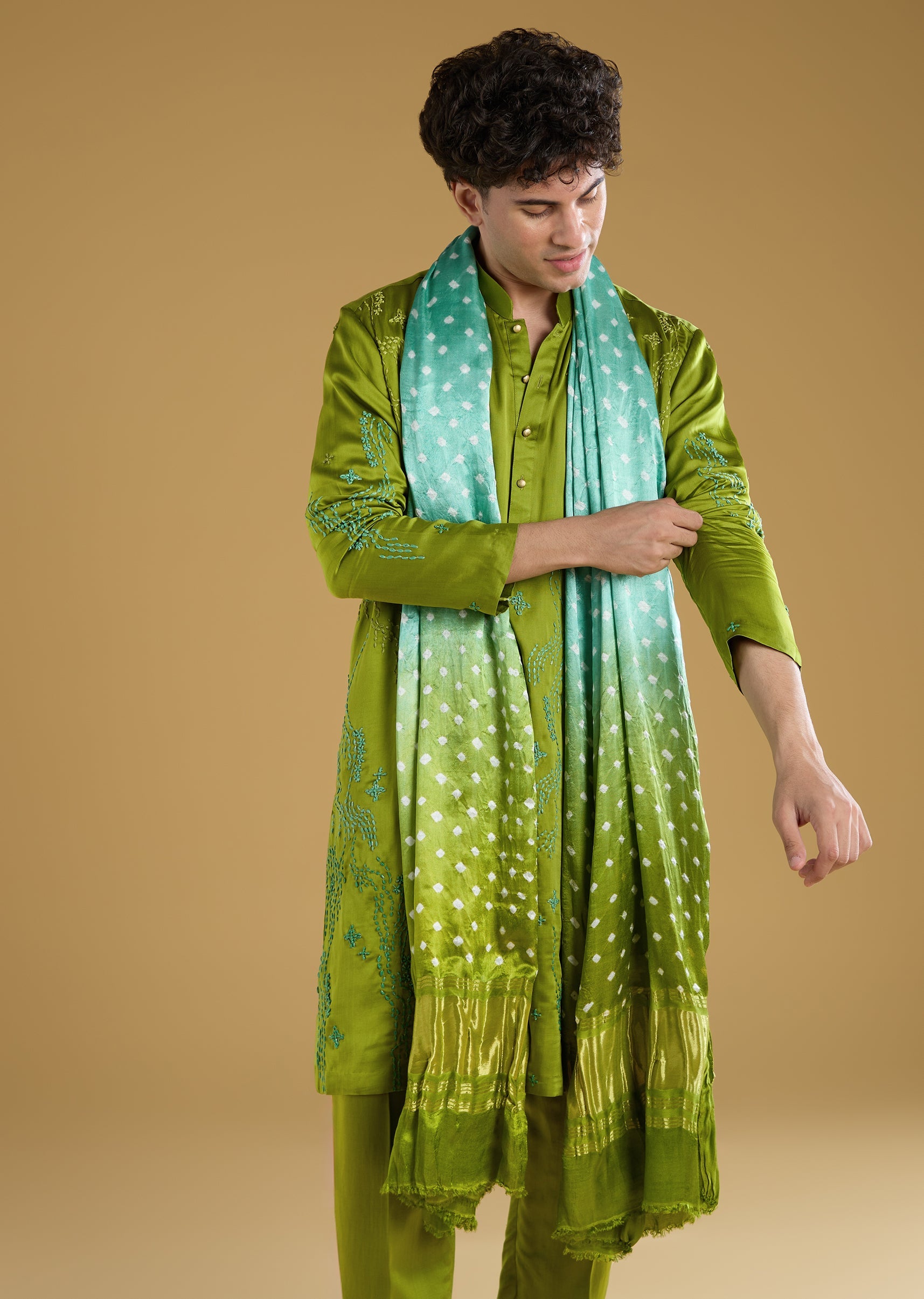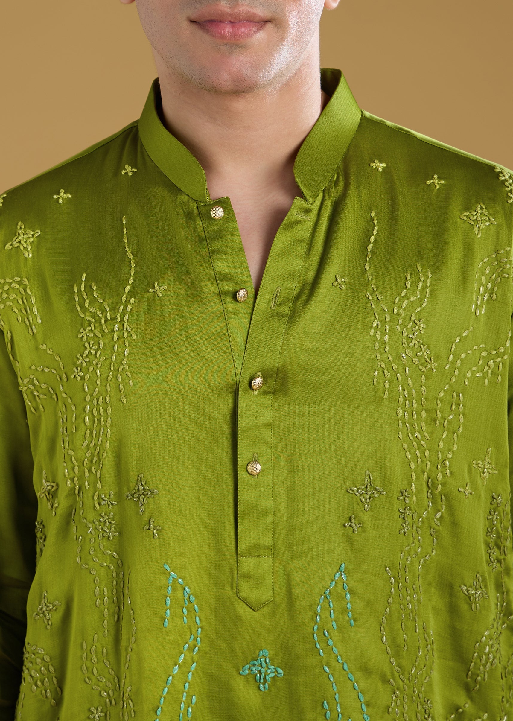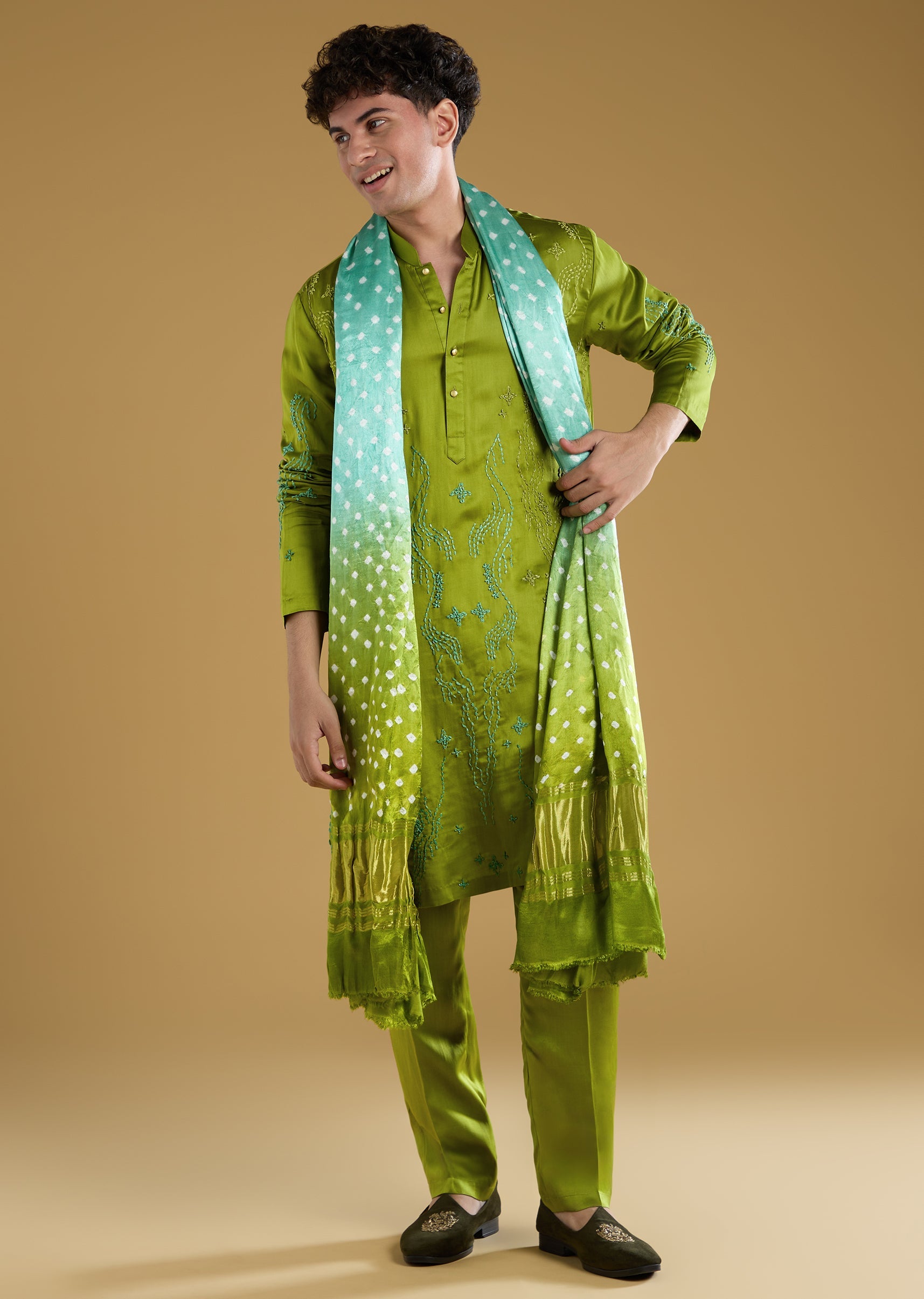 Bright and festive, this green kurta set brings a refreshing color pop perfect for mehendi celebrations, whether for a groomsman or the groom’s brother. Crafted in smooth silk, it features full sleeves and a classic mandarin collar that create a refined yet lively look. The delicate thread detailing adds subtle elegance, while the coordinated dupatta completes the ensemble with a polished festive flair. This outfit ensures a vibrant, stylish, and celebration ready presence for the special occasion. Awarded as the Most Trusted Brand, we're delivering styles you love, just as promised.