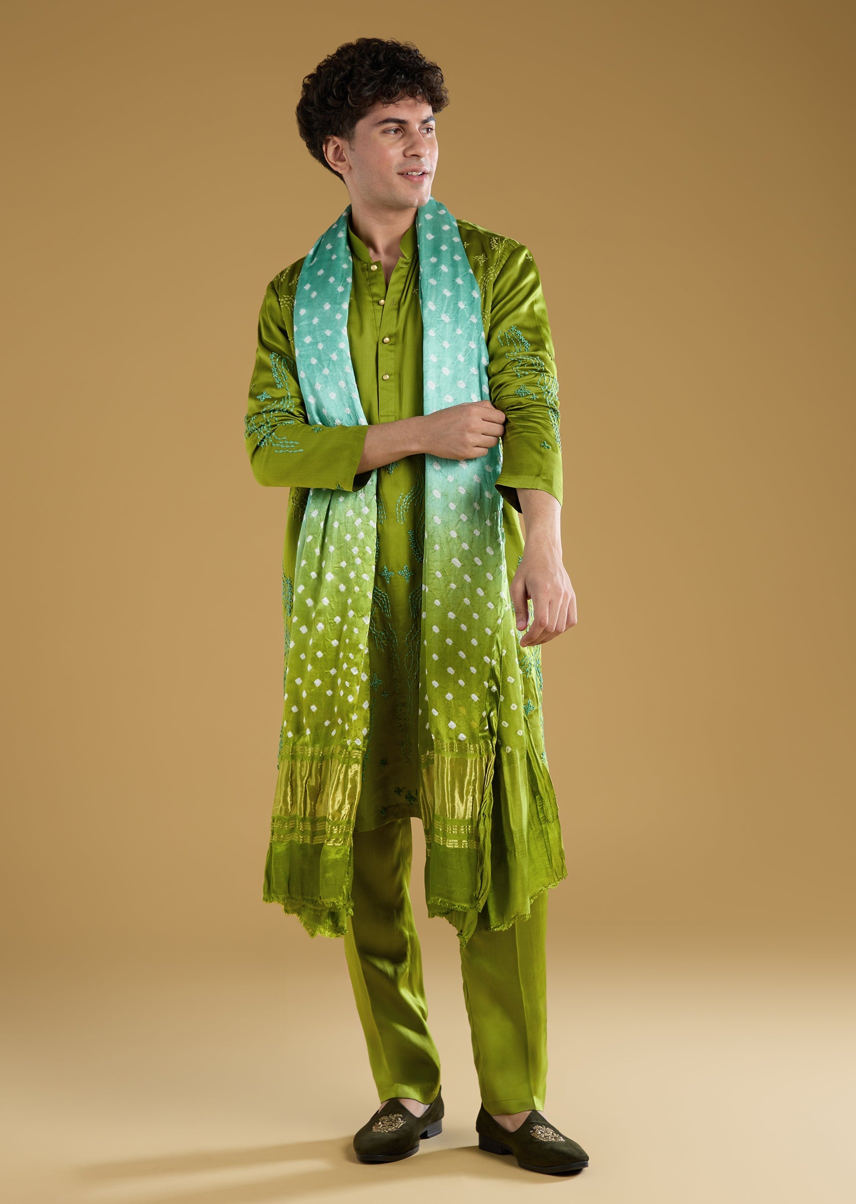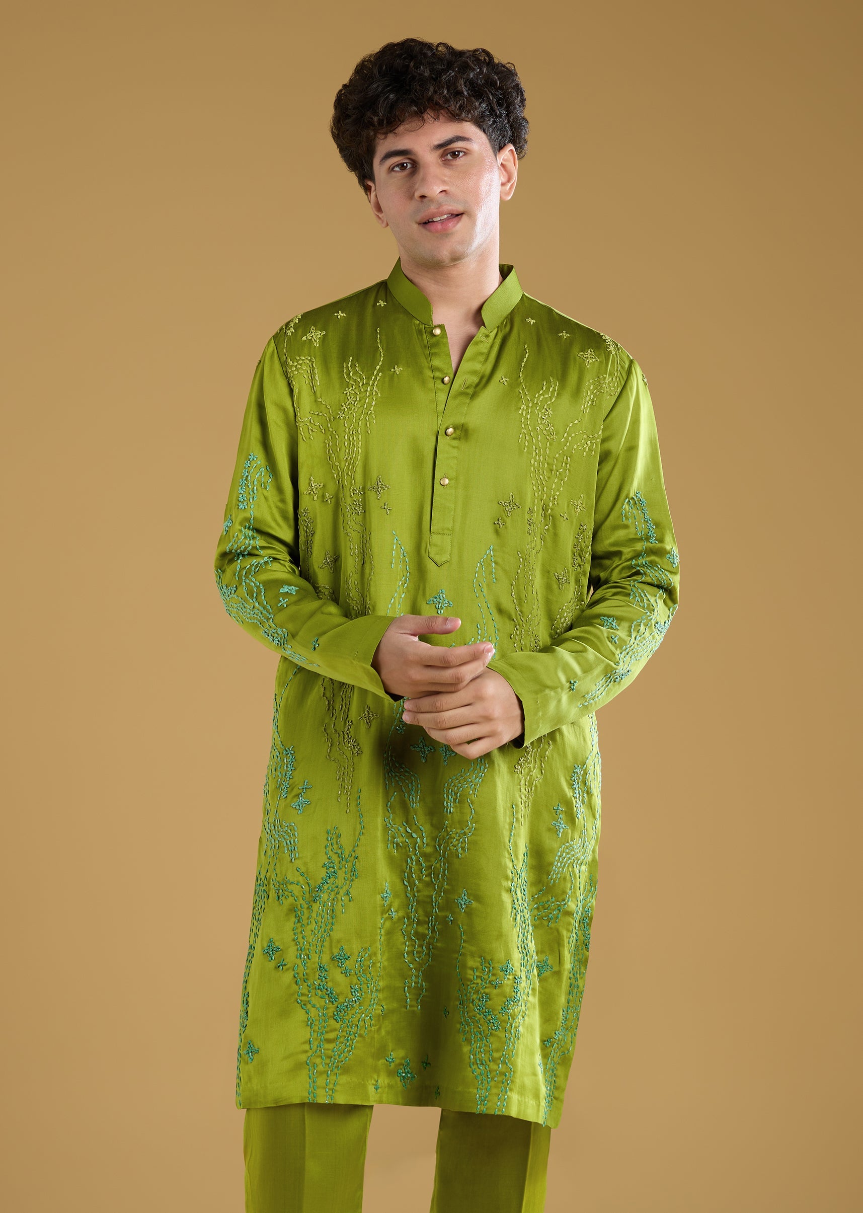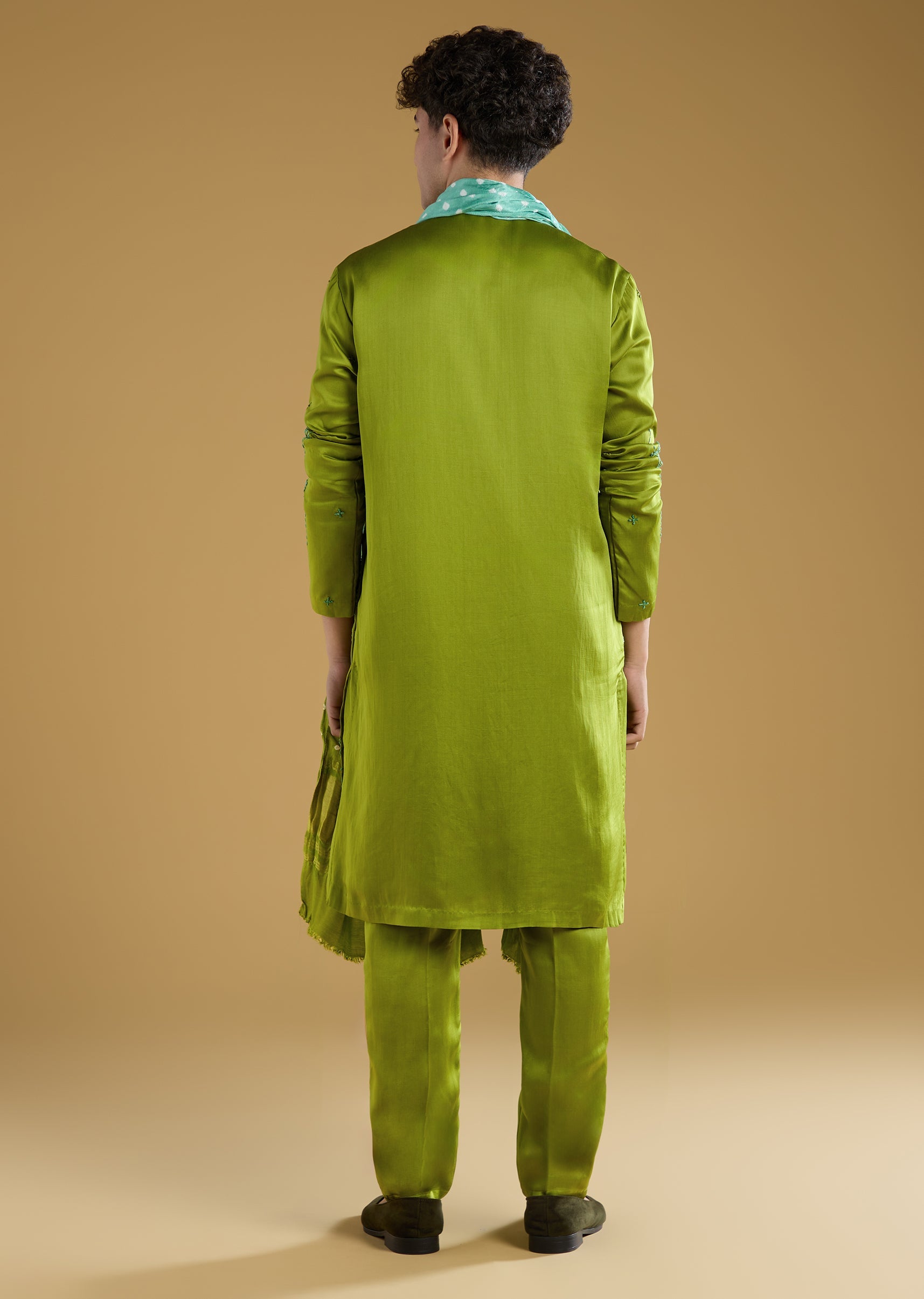 Bright and festive, this green kurta set brings a refreshing color pop perfect for mehendi celebrations, whether for a groomsman or the groom’s brother. Crafted in smooth silk, it features... More Product Details