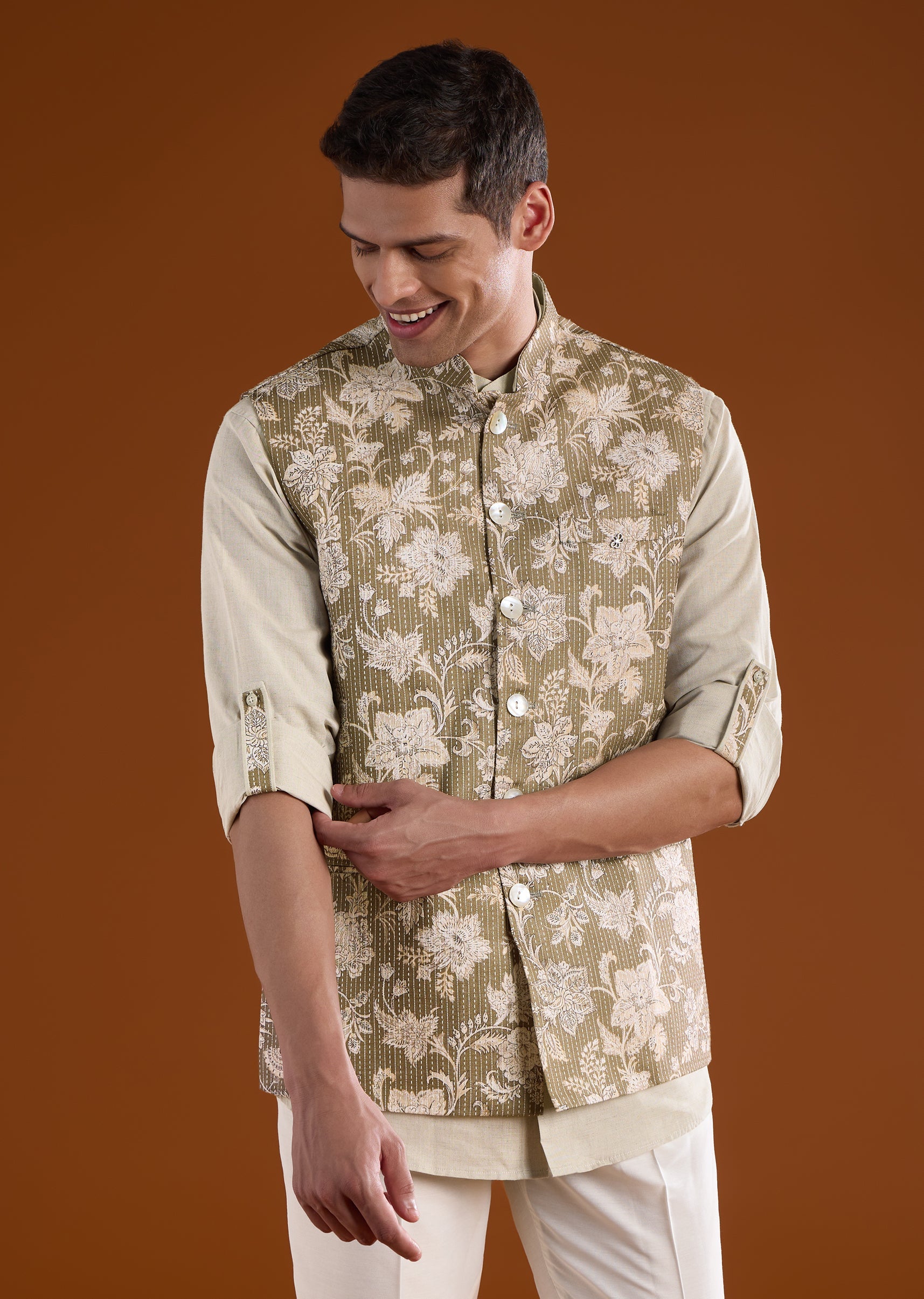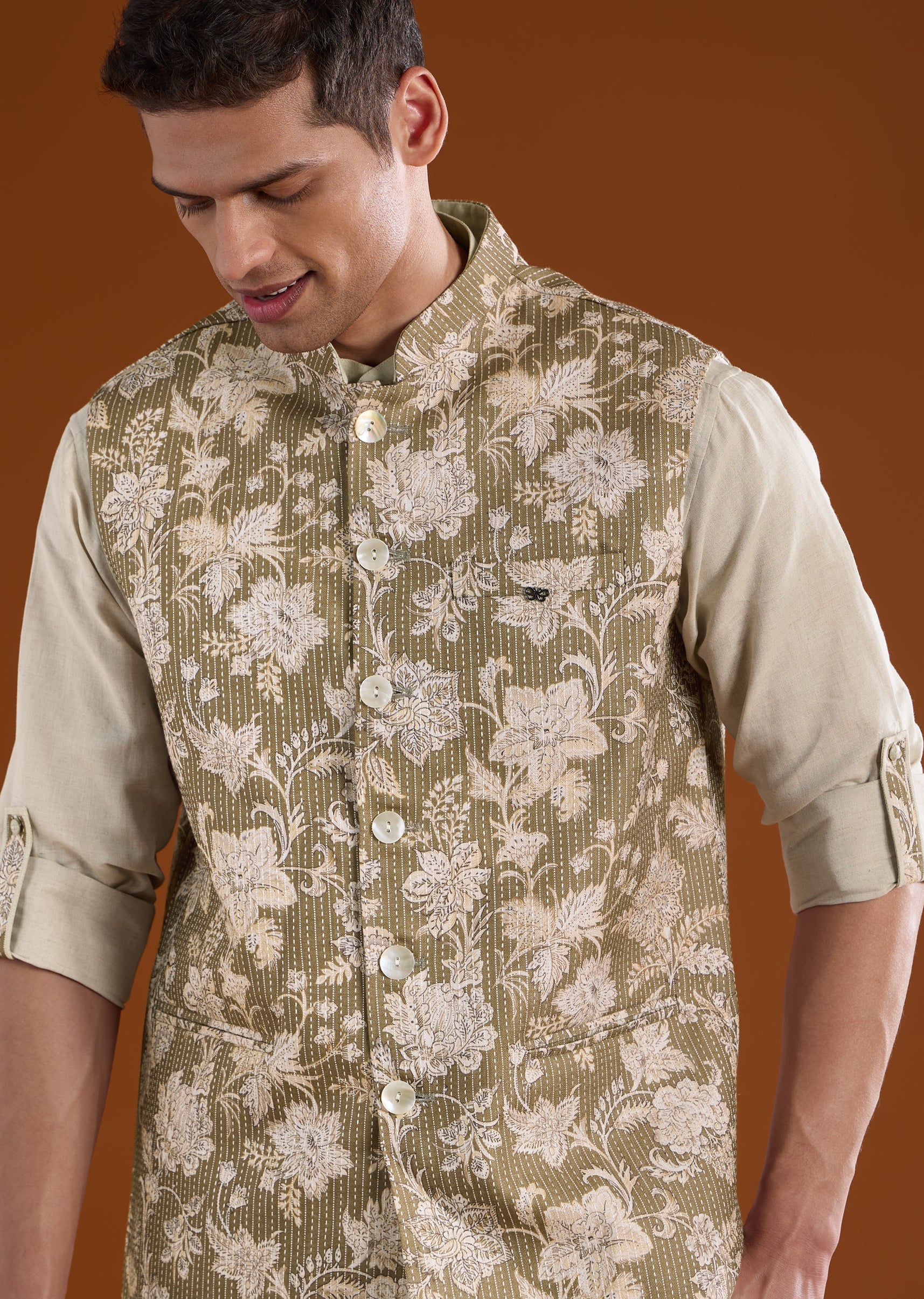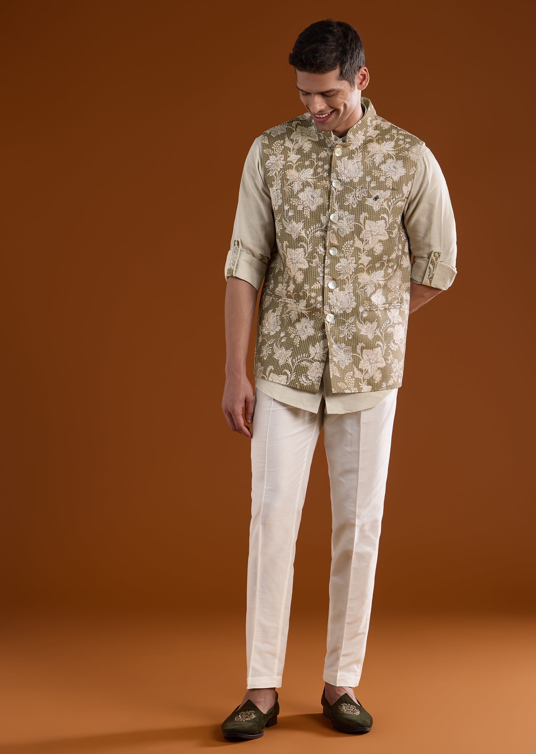 Green Silk Mens Kurta Jacket Set With Floral Pattern