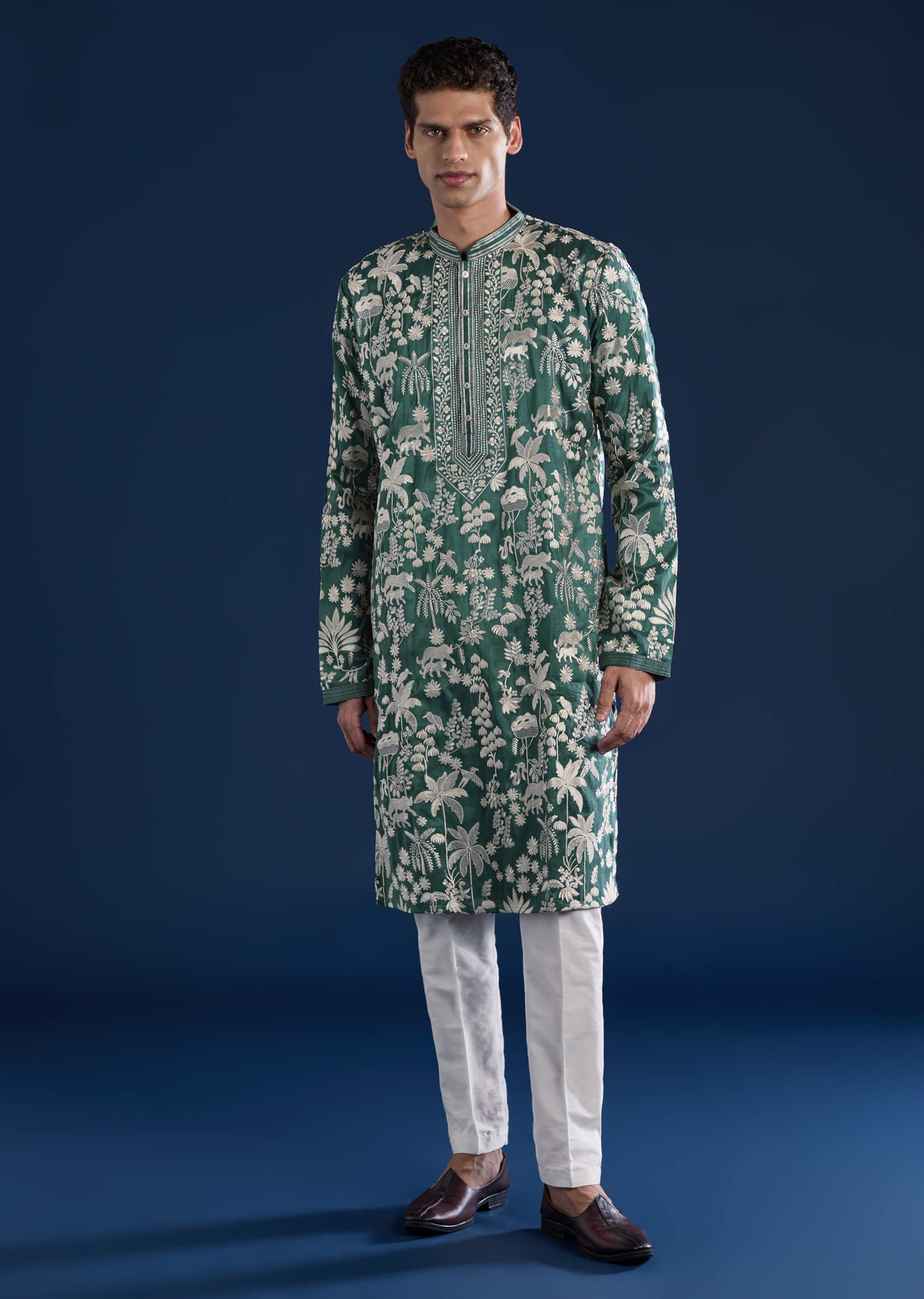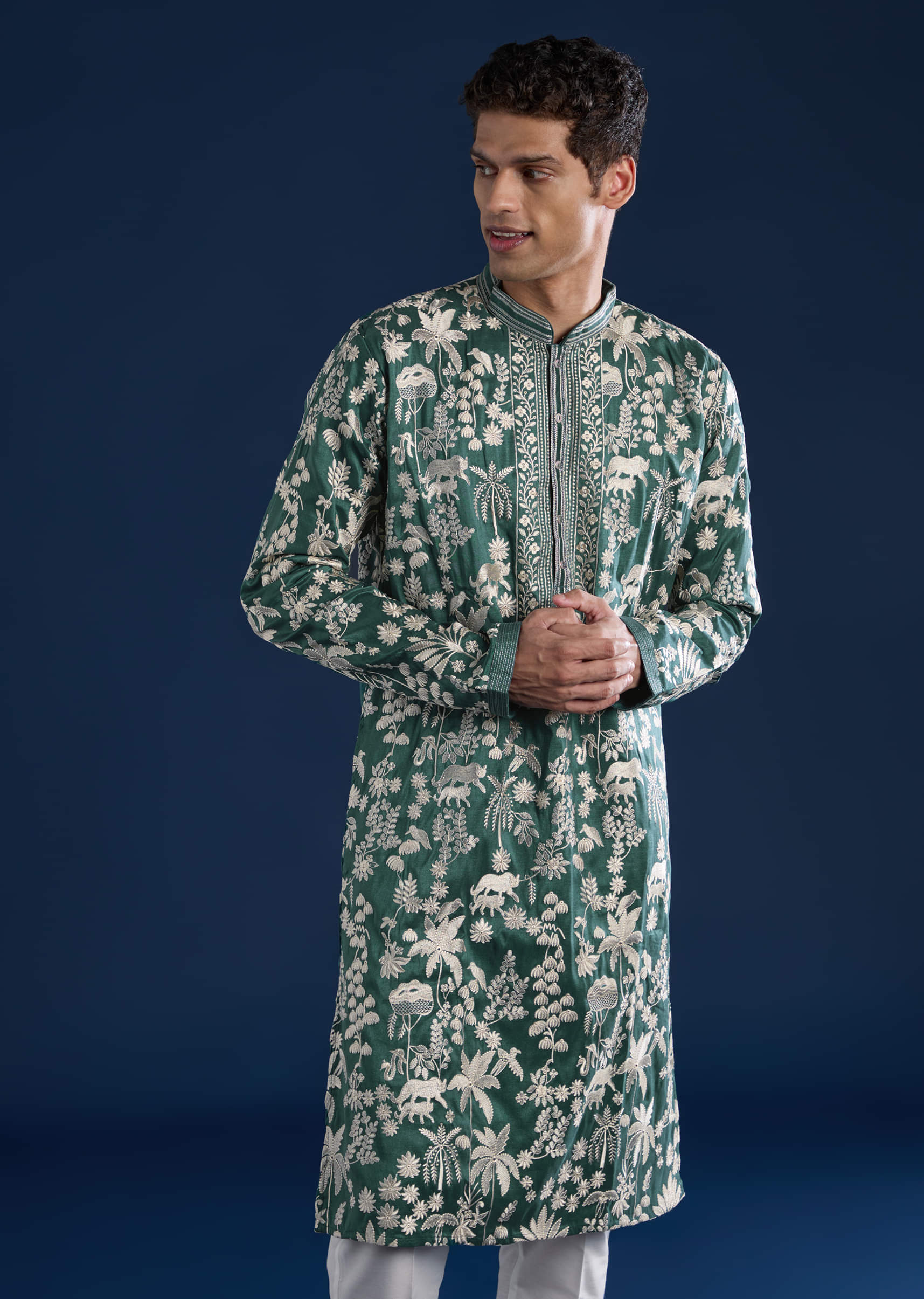 Green Silk Mirror Embellished Mens Kurta and Pant Set