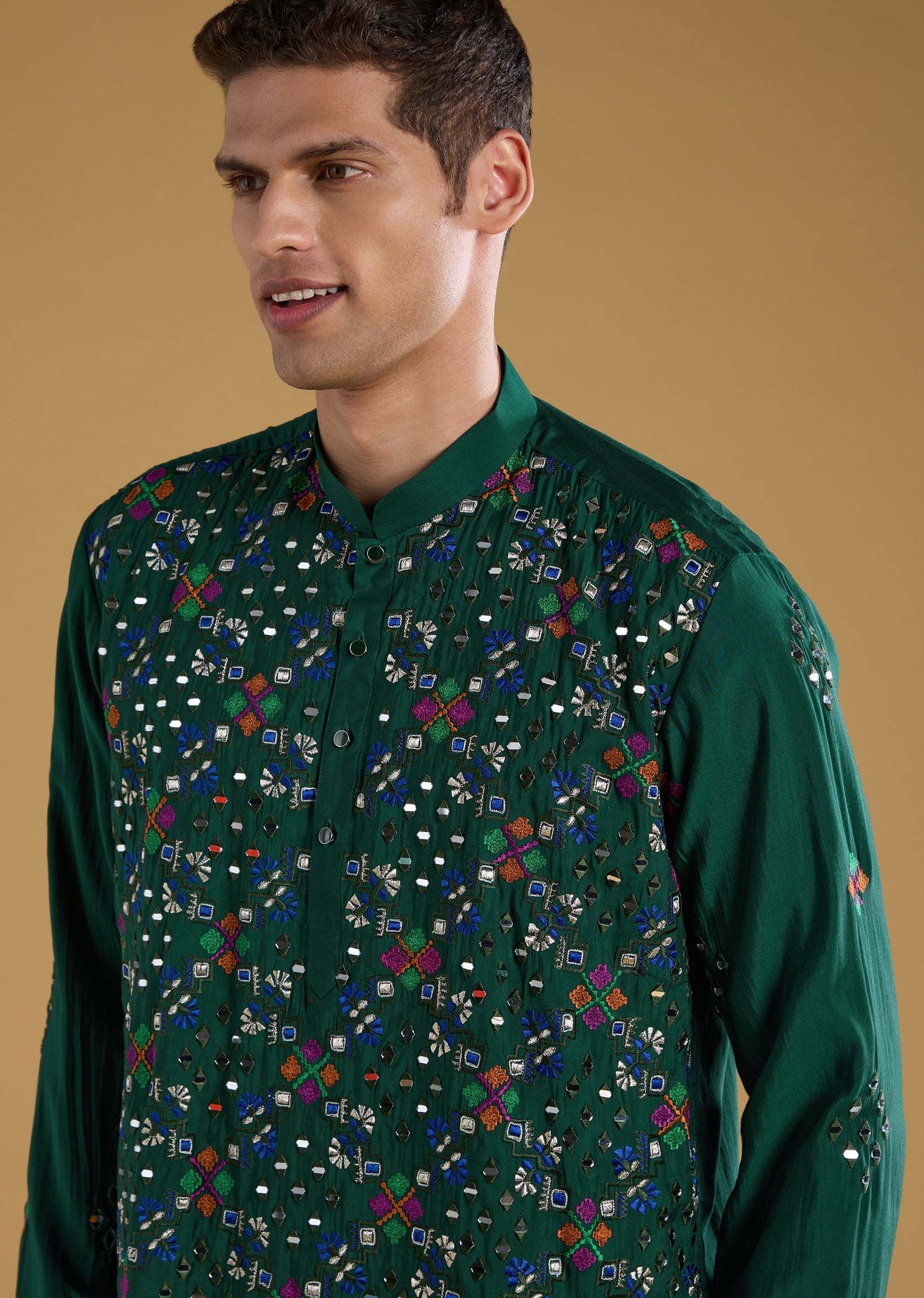 Green Silk Thread Work Men's Kurta Set with Dupatta