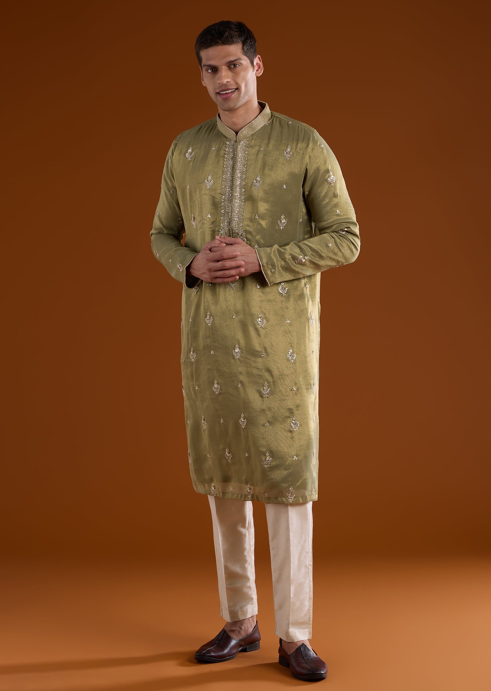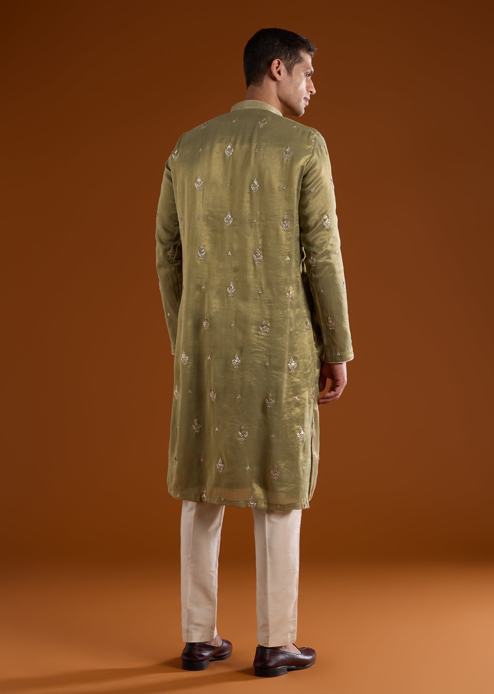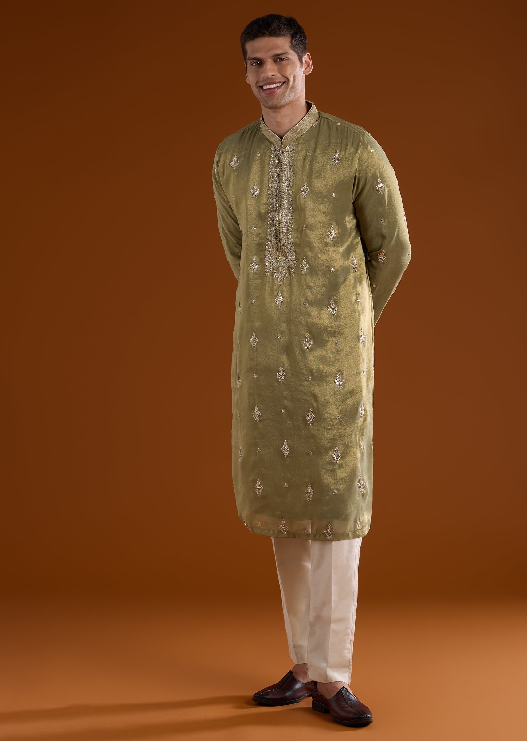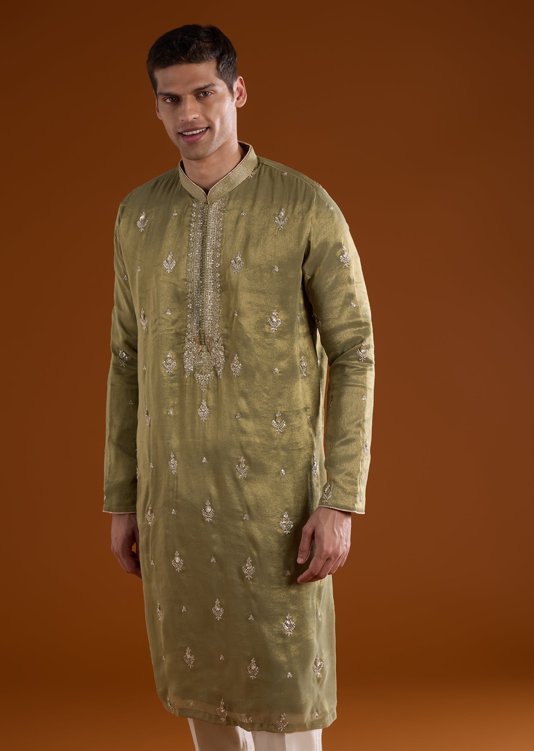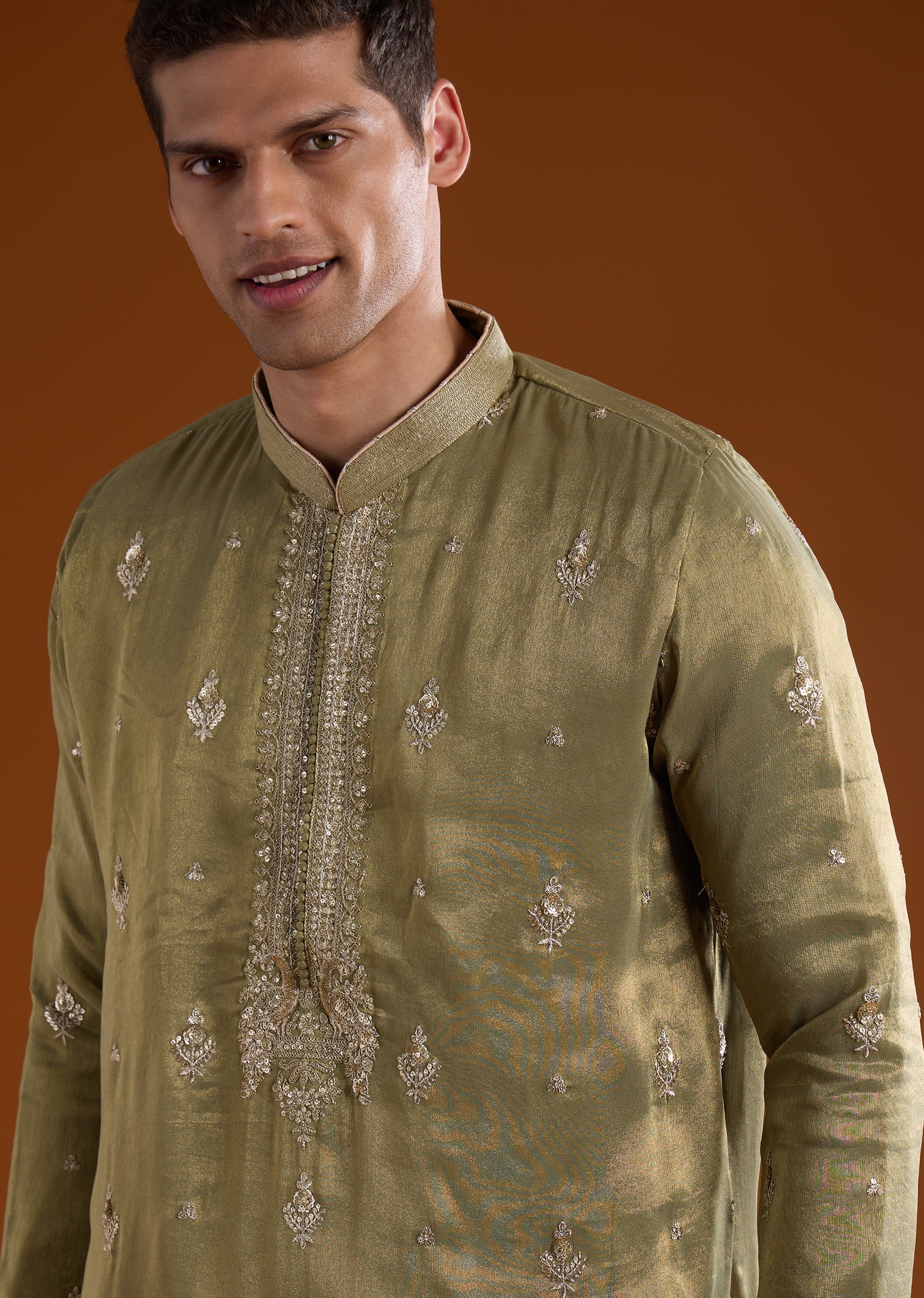 A vibrant green tissue kurta set crafted for mehendi and haldi celebrations, perfect for groomsmen and wedding guests. Enhanced with intricate thread, sequins, and zardosi work, it brings festive elegance while maintaining a lightweight and structured silhouette. The full sleeves and mandarin collar create a polished and refined look suitable for traditional wedding occasions. Awarded as the Most Trusted Brand, we're delivering styles you love, just as promised.