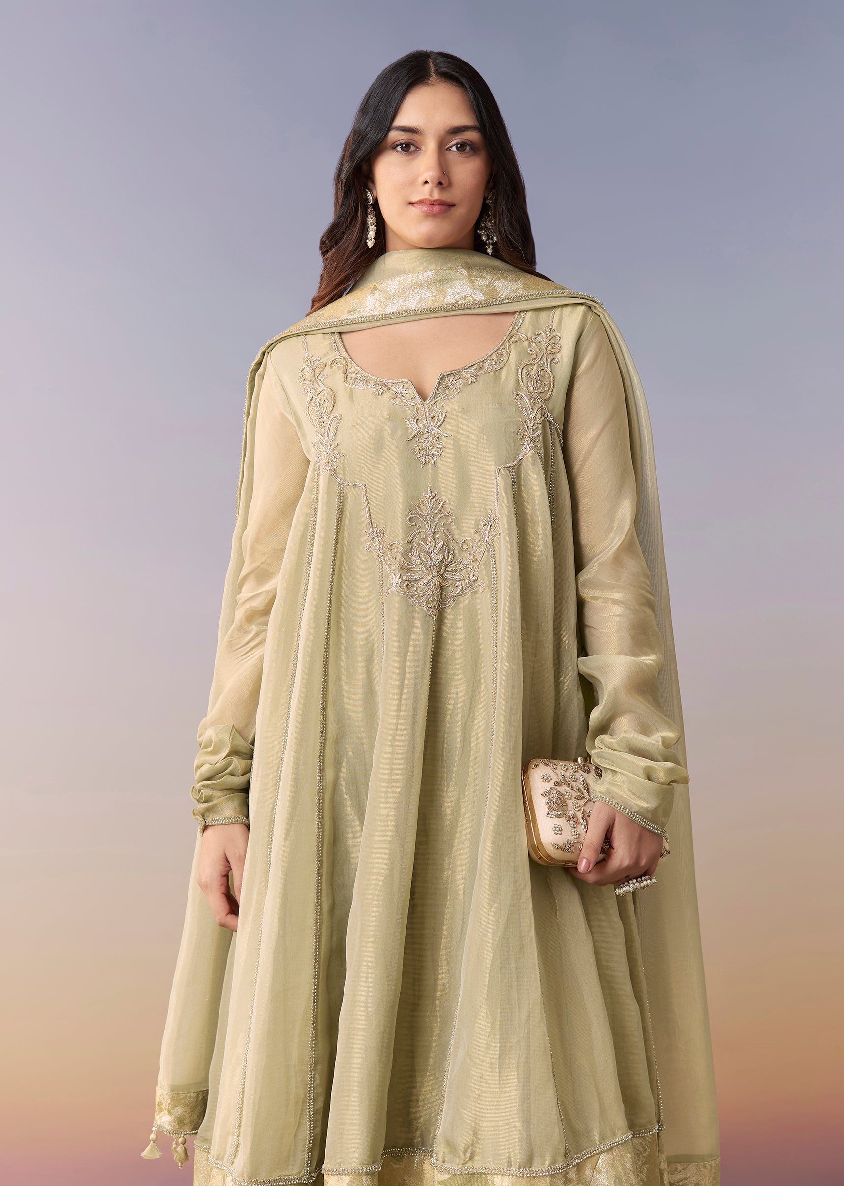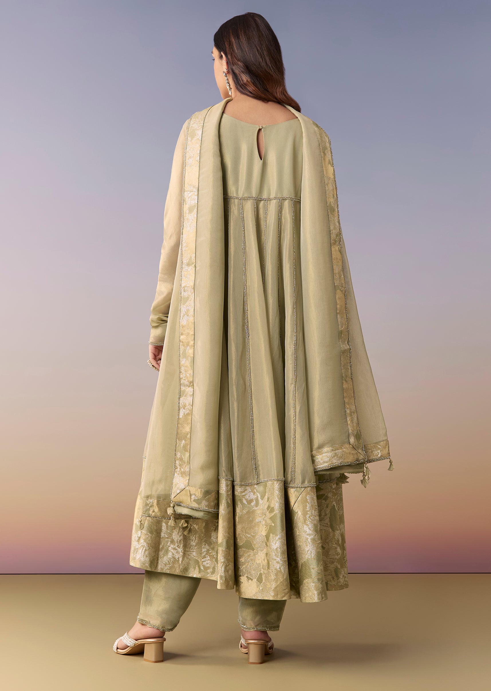Crafted in shimmering tissue, this green A-line anarkali features zardosi and bead detailing for an elevated finish. Styled with a notched neckline, churidar sleeves and back hook-eye closure, it comes... More Product Details