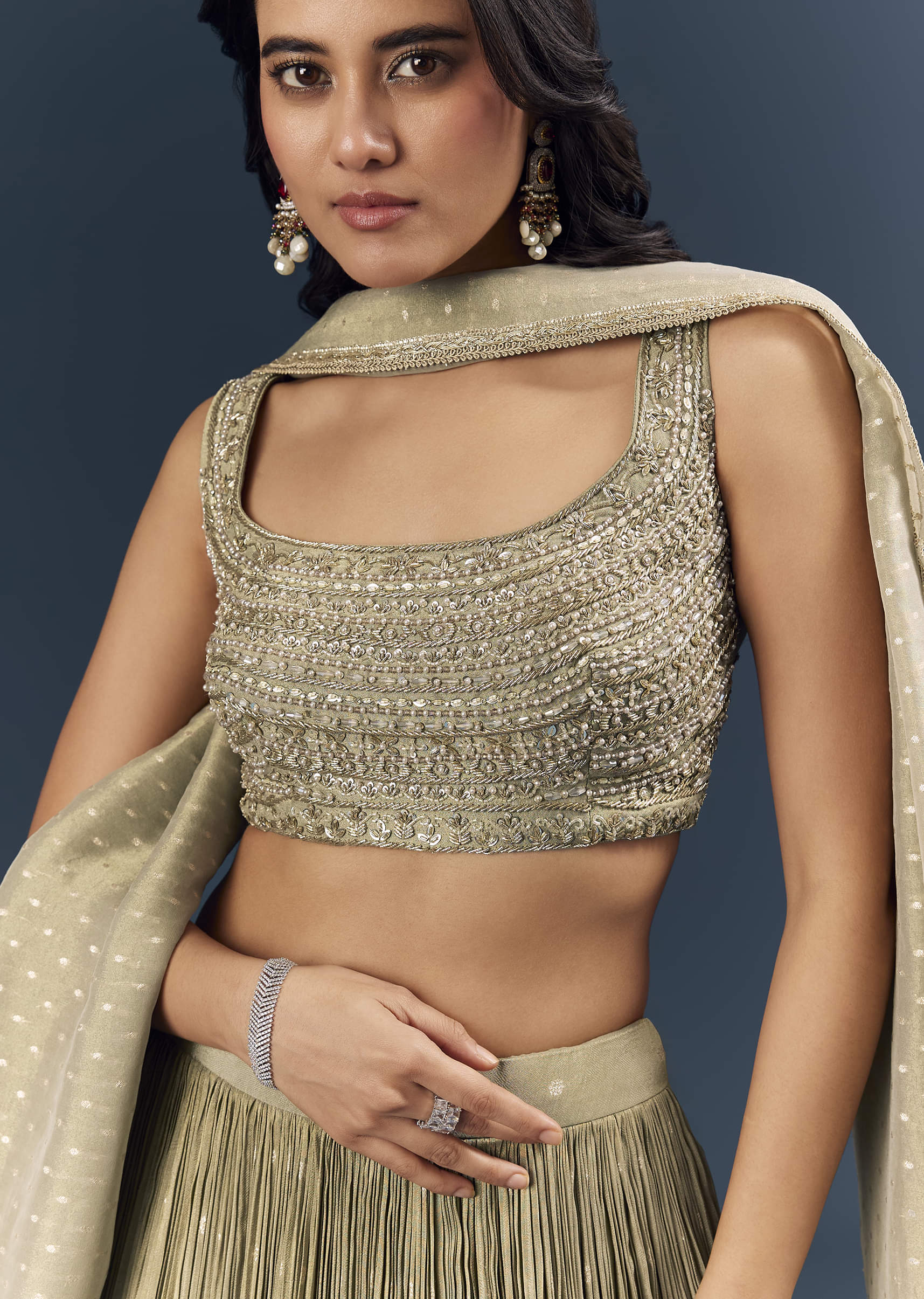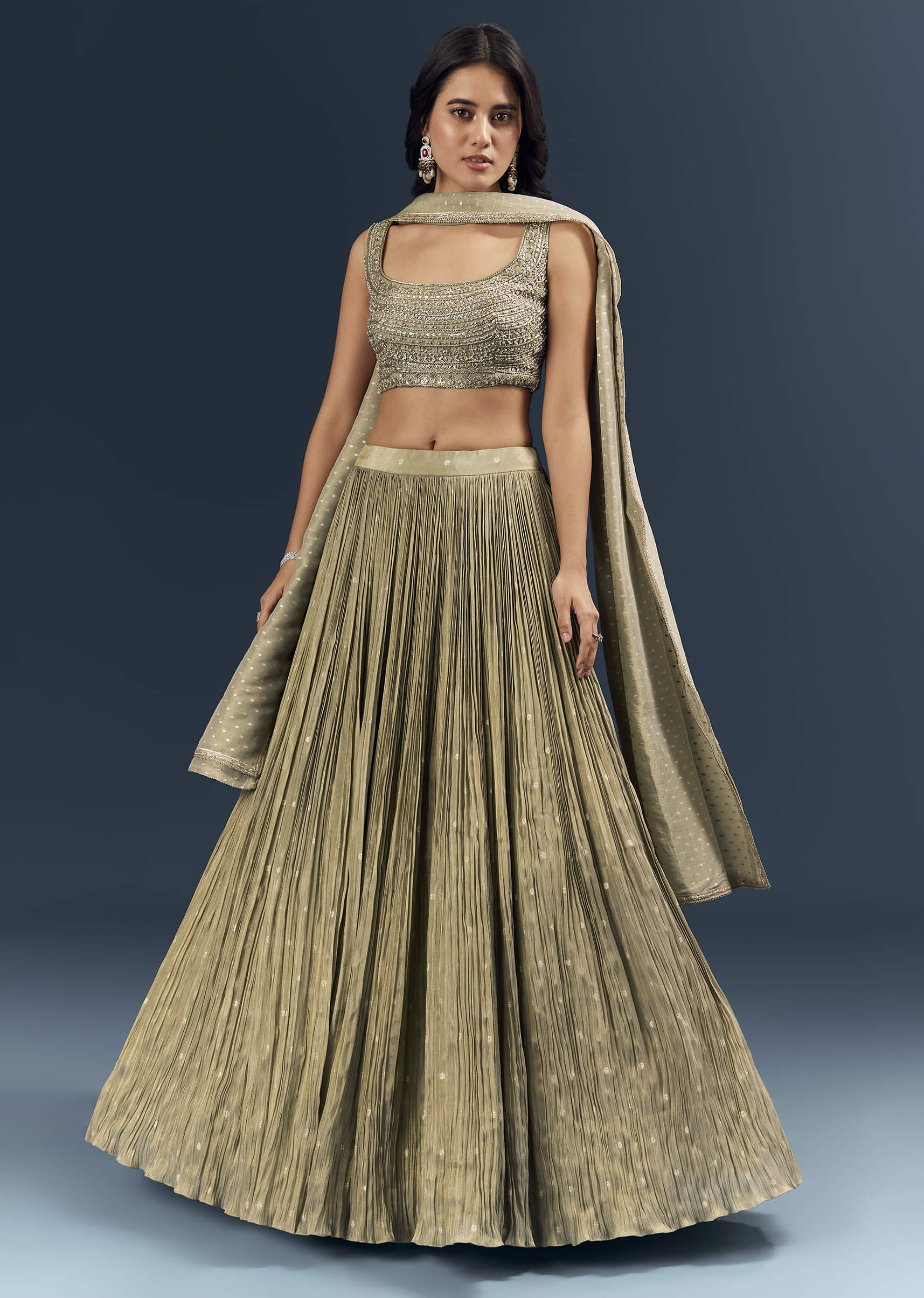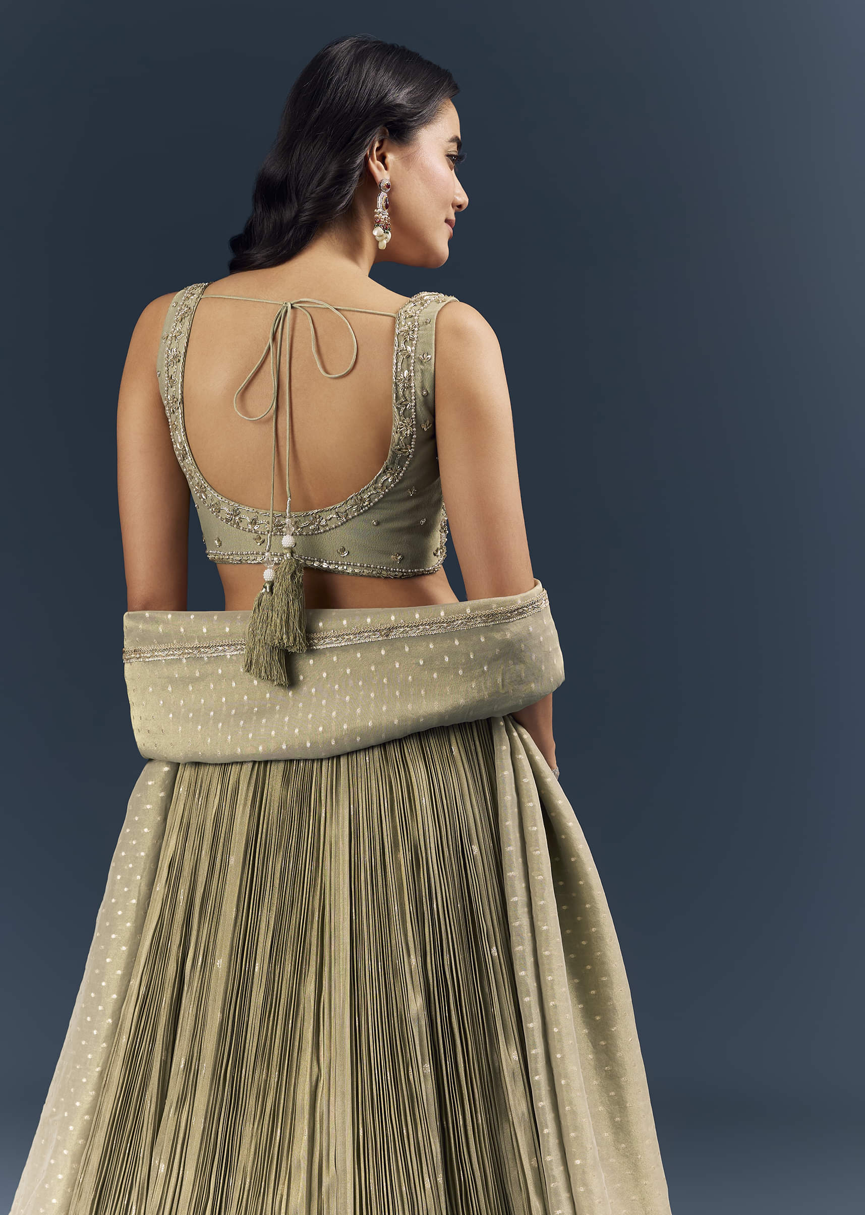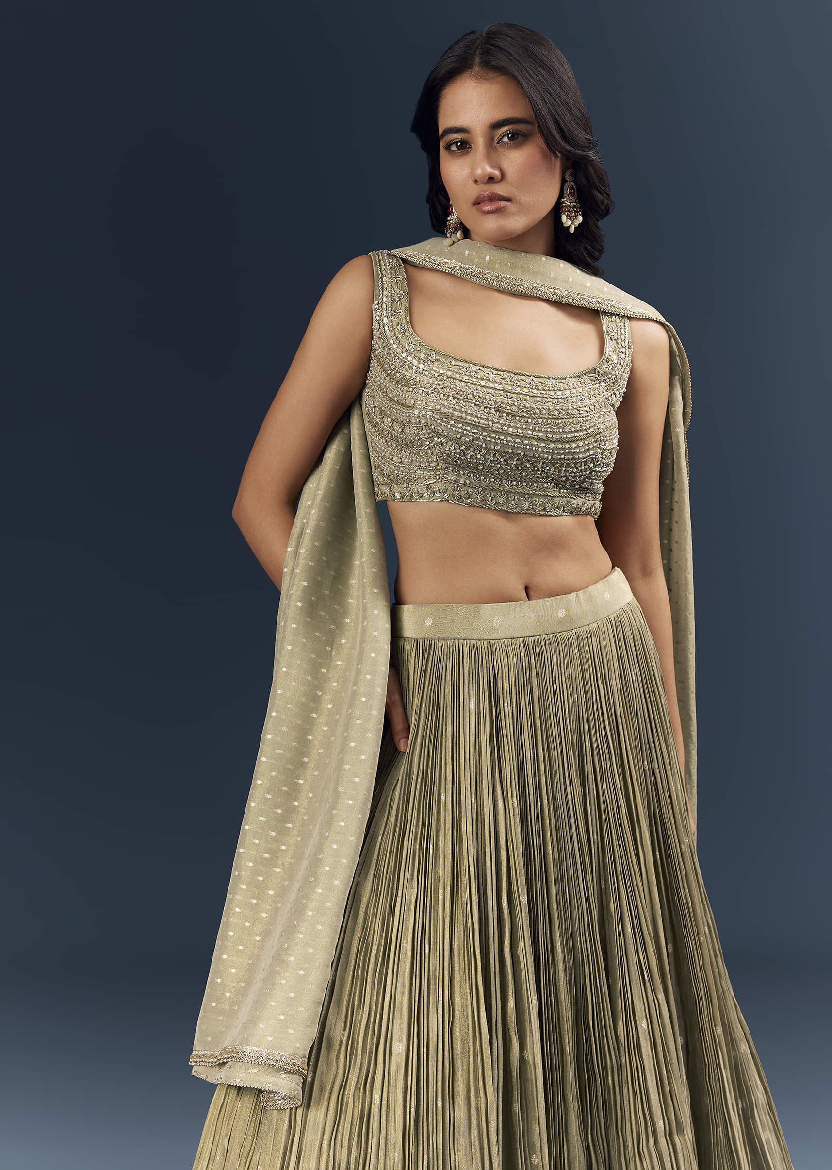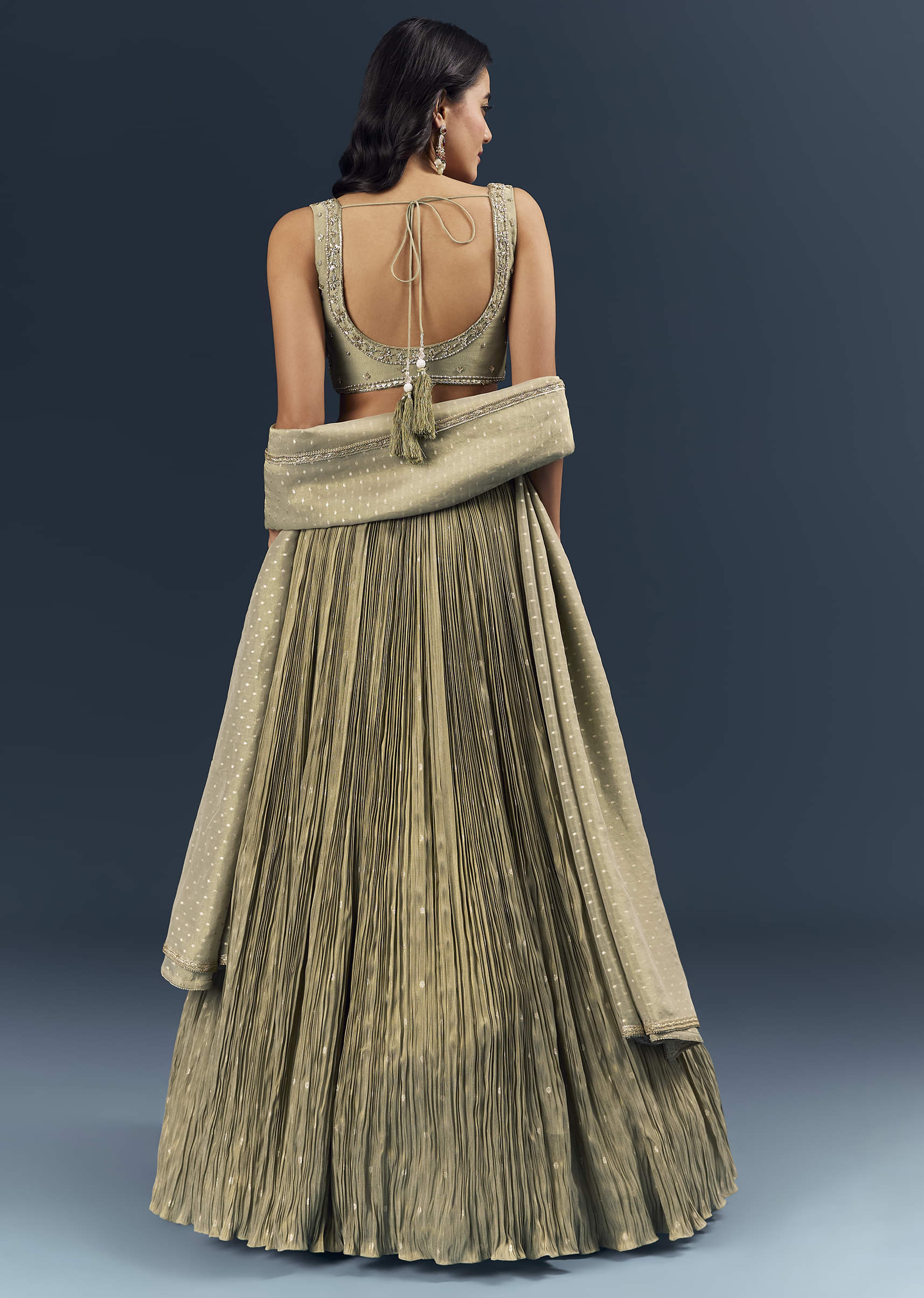 Under soft lights, this grey banarasi silk bridesmaid lehenga reads cool, composed, and very polished. Intricate handwork blends zardosi definition with sequin glow, bead detailing, and lace borders for a... More Product Details