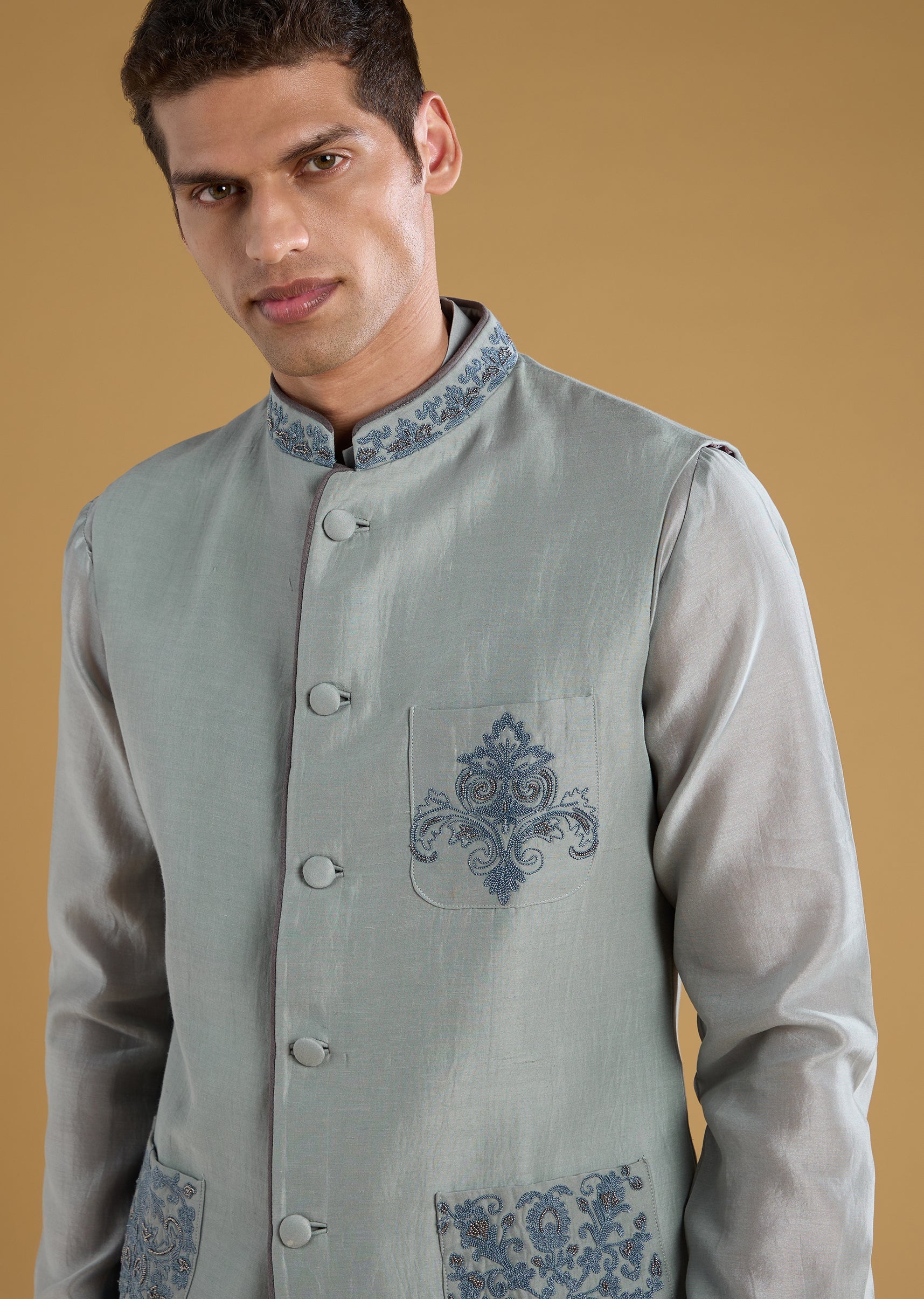 Artisanal charm takes center stage in this Chanderi and silk ensemble, enriched with dori, bead, and resham work that adds texture and refined detailing. The full-sleeve mandarin-collar kurta paired with a structured jacket creates a sophisticated layered look ideal for festive evenings and intimate celebrations. Thoughtful front button and hook eye closures lend a tailored finish while keeping the outfit effortlessly wearable. A versatile trio that balances tradition with contemporary flair. Awarded as the Most Trusted Brand, we're delivering styles you love, just as promised.