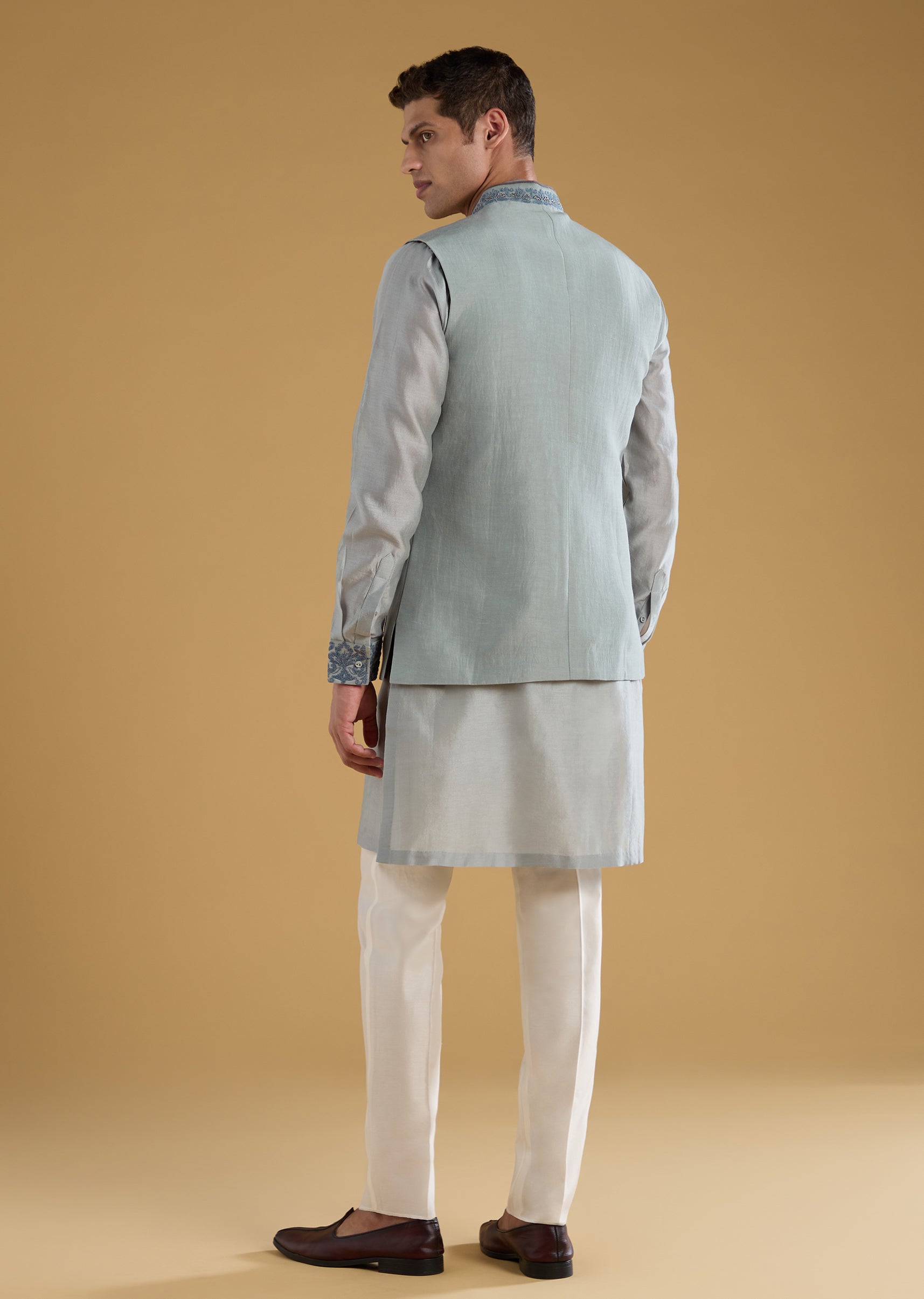 Grey Chanderi Silk Embroidered Mens Jacket Kurta Set