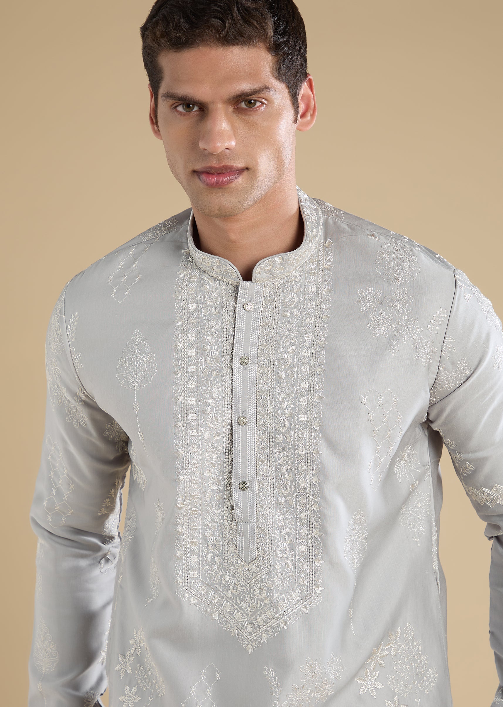Crafted in art silk, this grey kurta set features refined thread embroidery. Finished with a mandarin collar, full sleeves and front button with hook-eye closure, it is paired with straight-fit... More Product Details