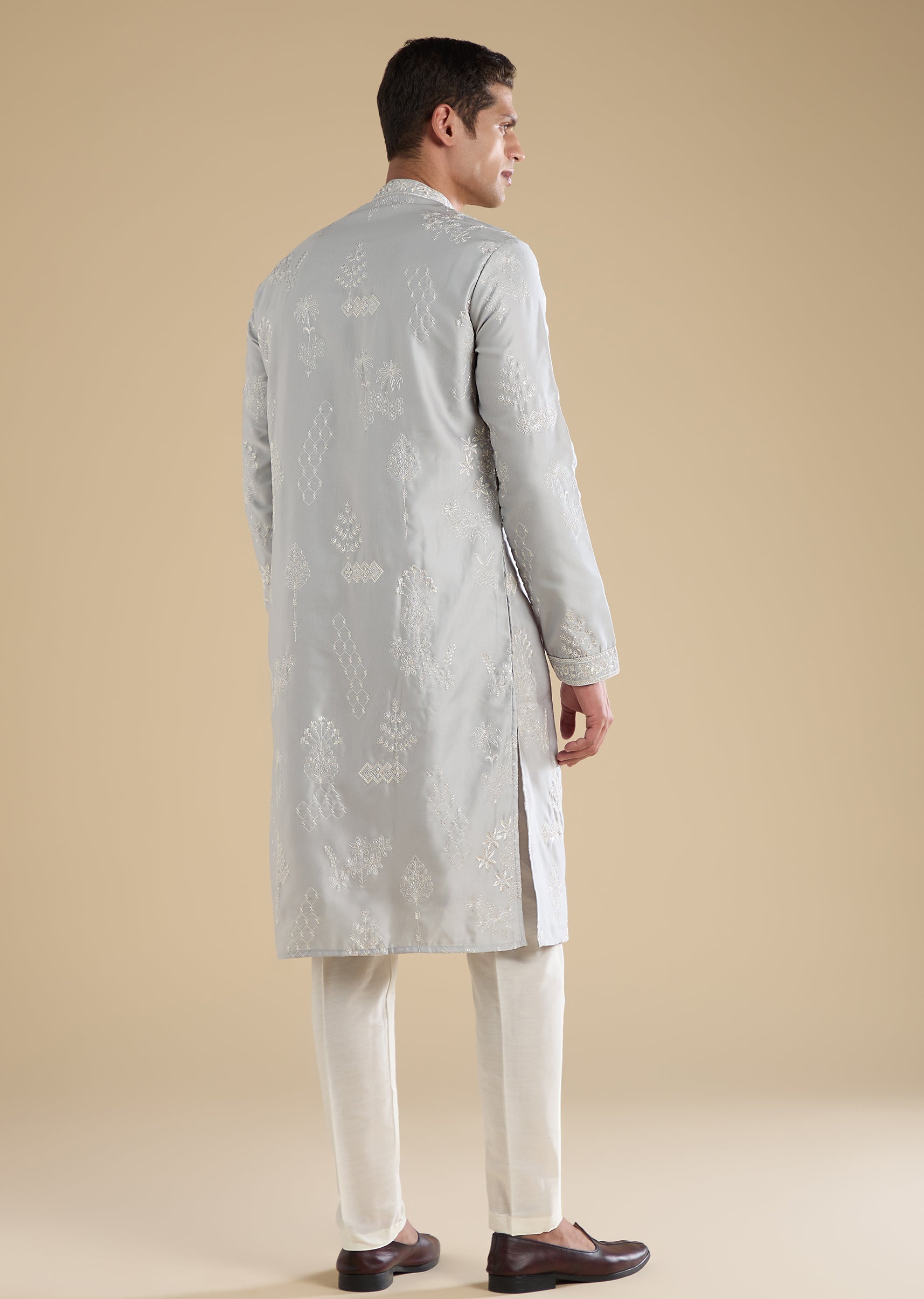Crafted in art silk, this grey kurta set features refined thread embroidery. Finished with a mandarin collar, full sleeves and front button with hook-eye closure, it is paired with straight-fit mid-waist pants—perfect for festive occasions. Awarded as the Most Trusted Brand, we're delivering styles you love, just as promised.