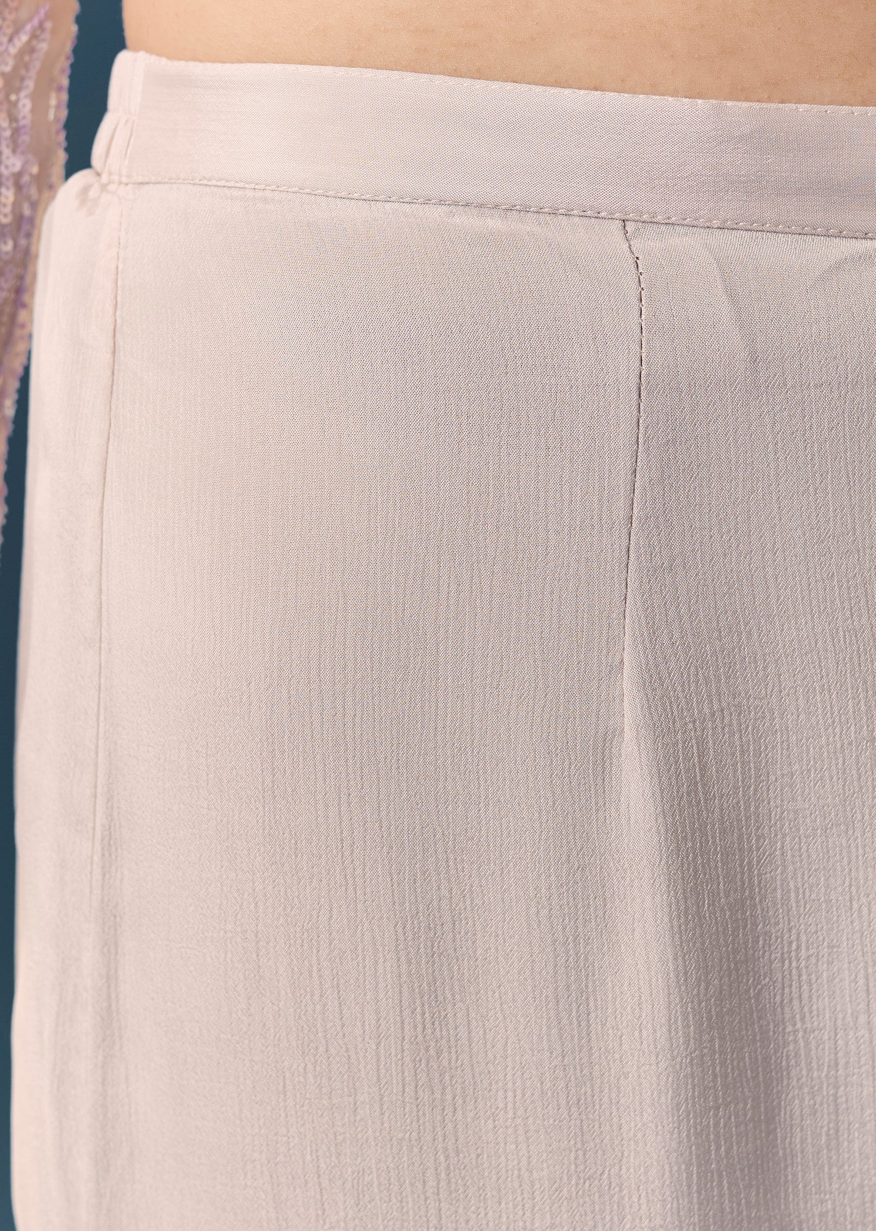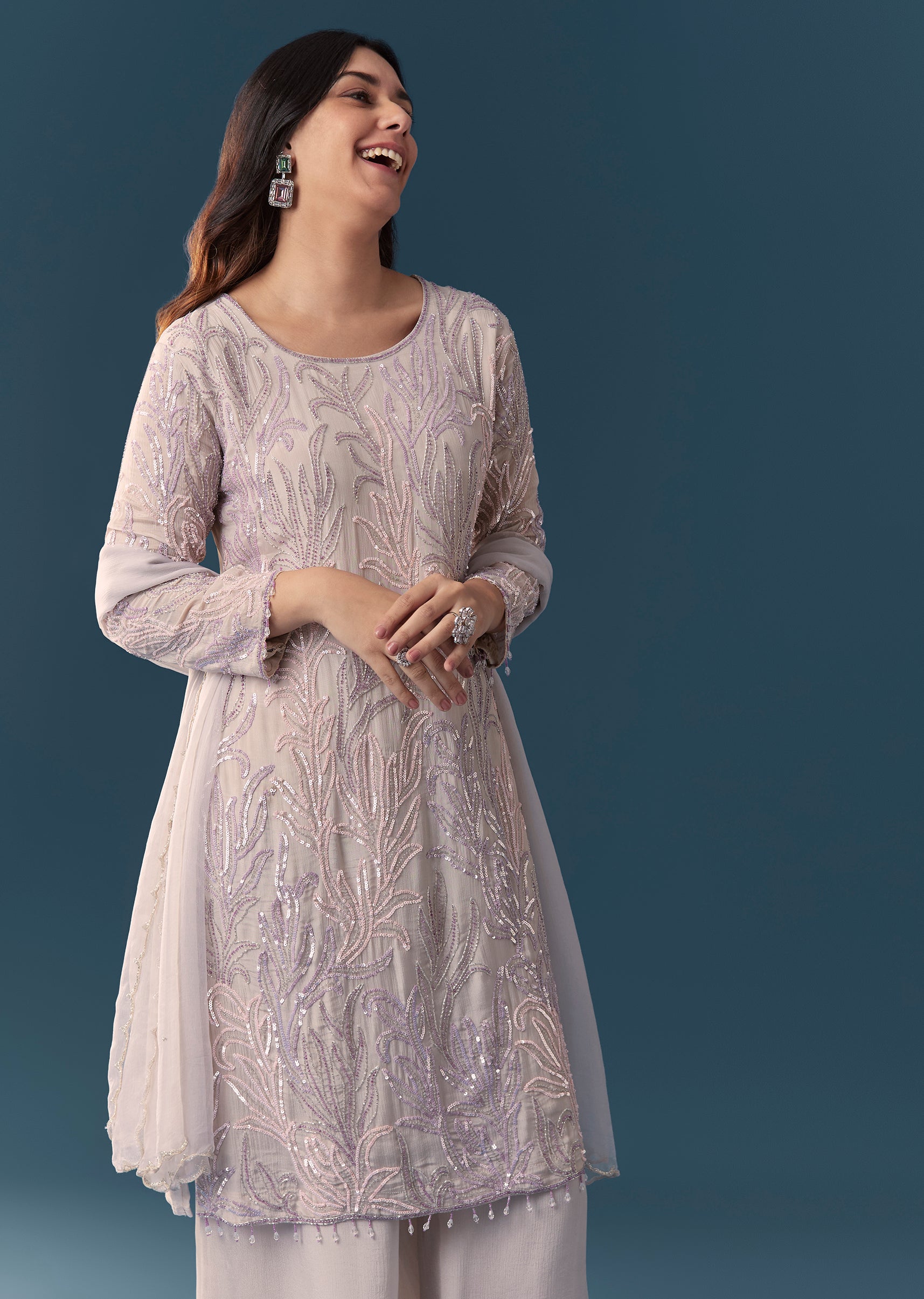 Crafted in chinon, this straight kurta is detailed with sequins, cut dana and beadwork for a soft festive shimmer. Styled with full sleeves, a round neckline and side zip, it... More Product Details