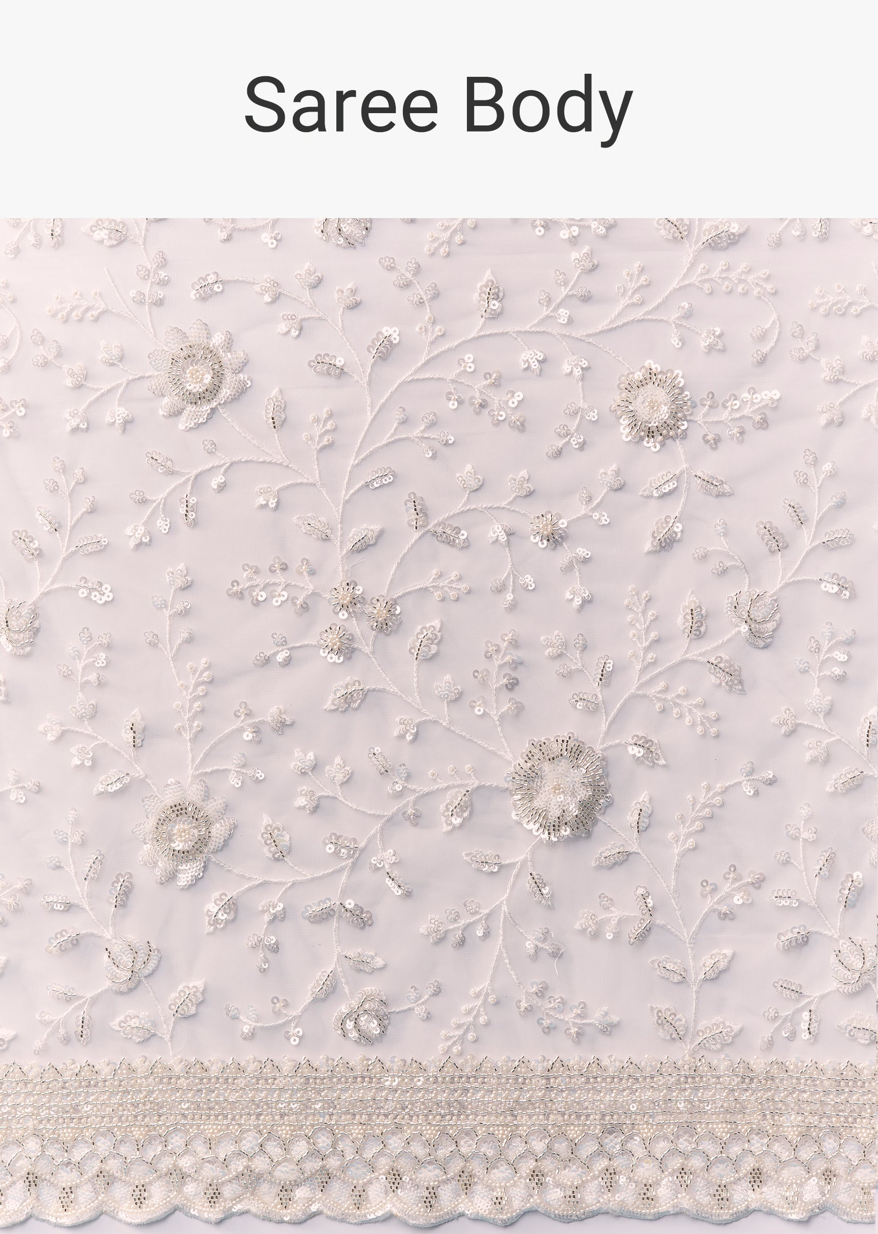 Embrace subtle glamour with this grey heavy embroidered net saree, featuring an intricate floral jaal design all over, delicately crafted with resham thread, cutdana, sequins, and beads. The elegant scallop... More Product Details