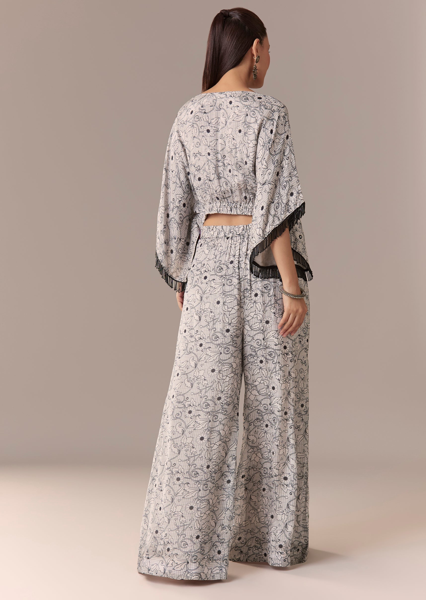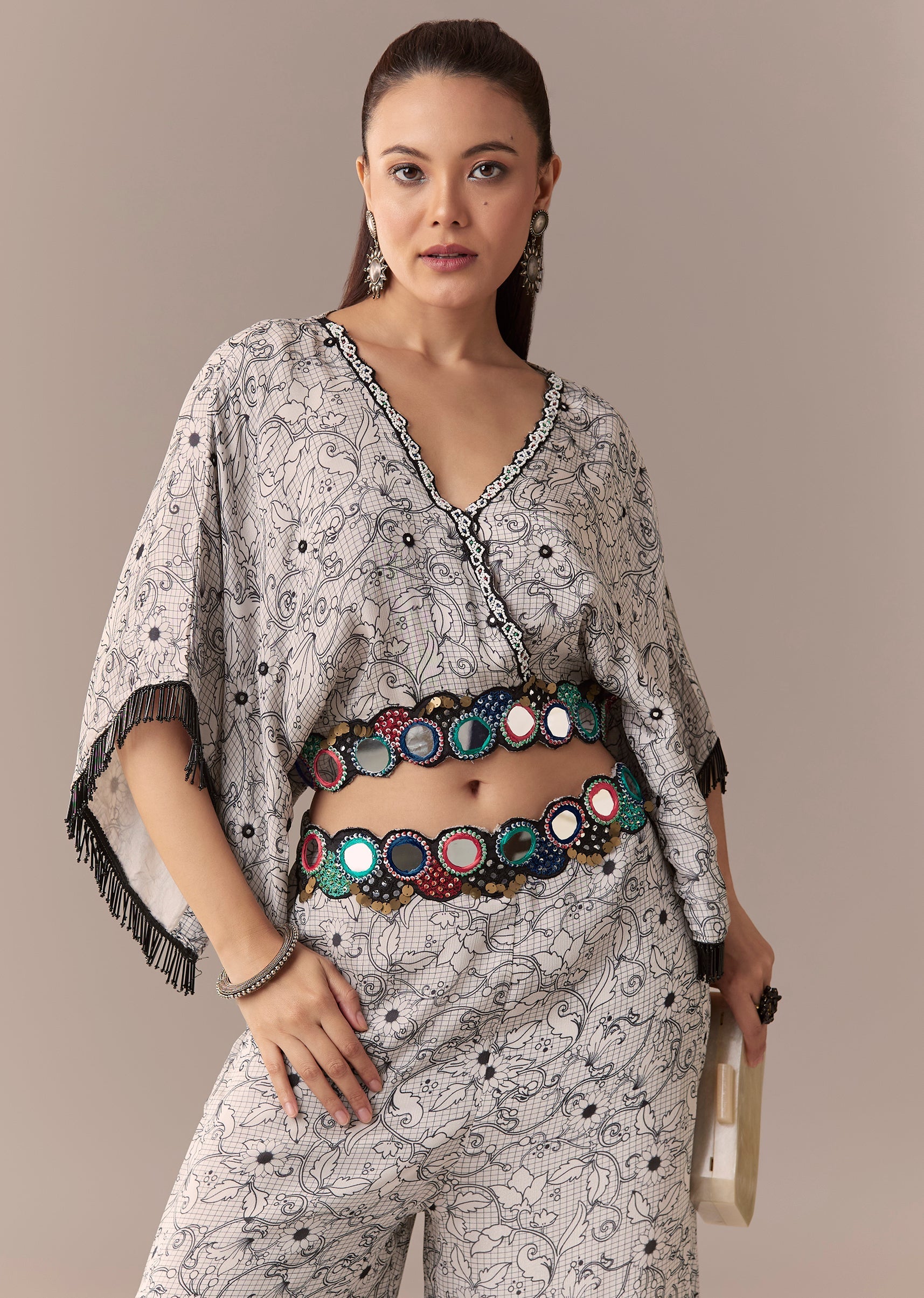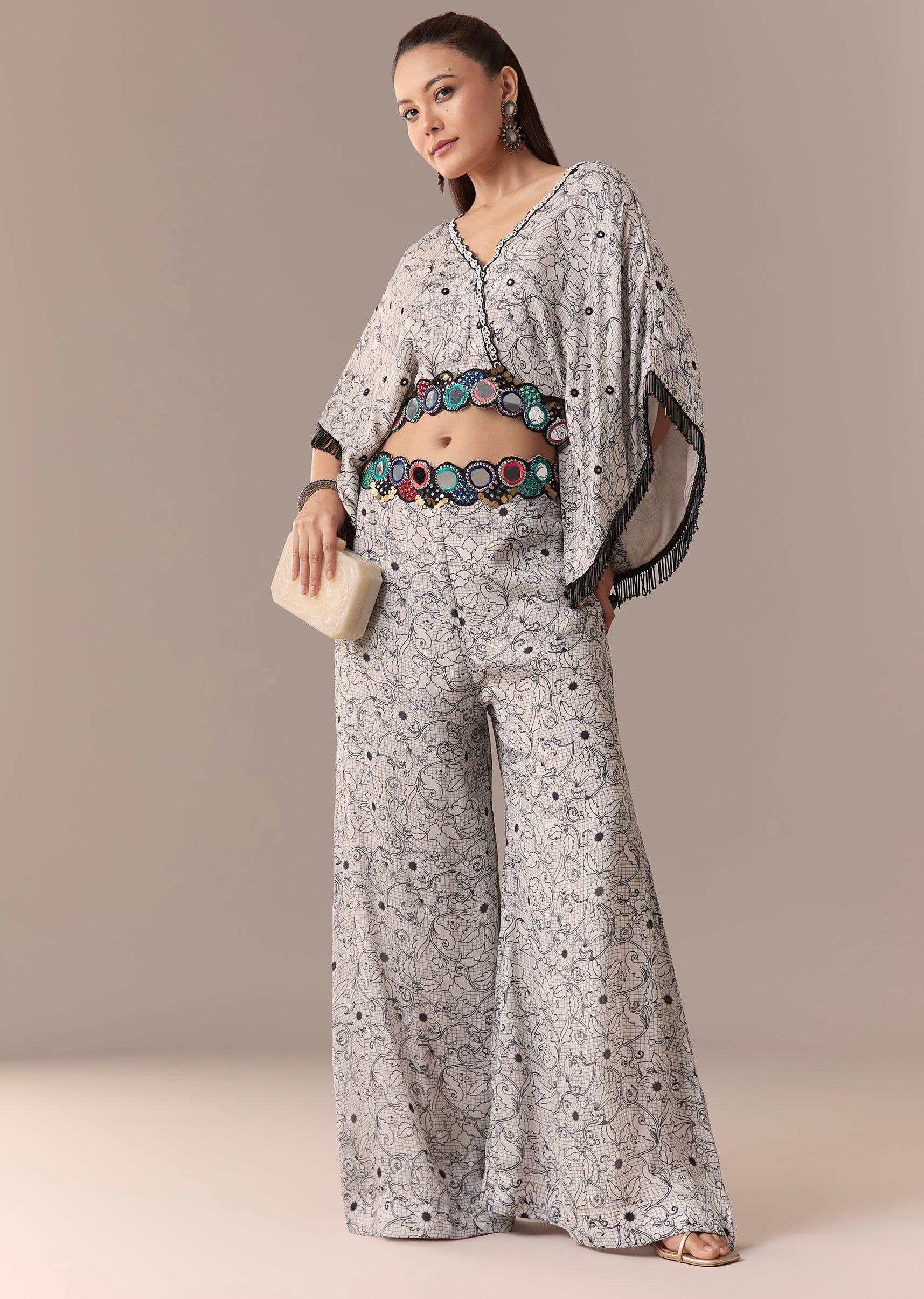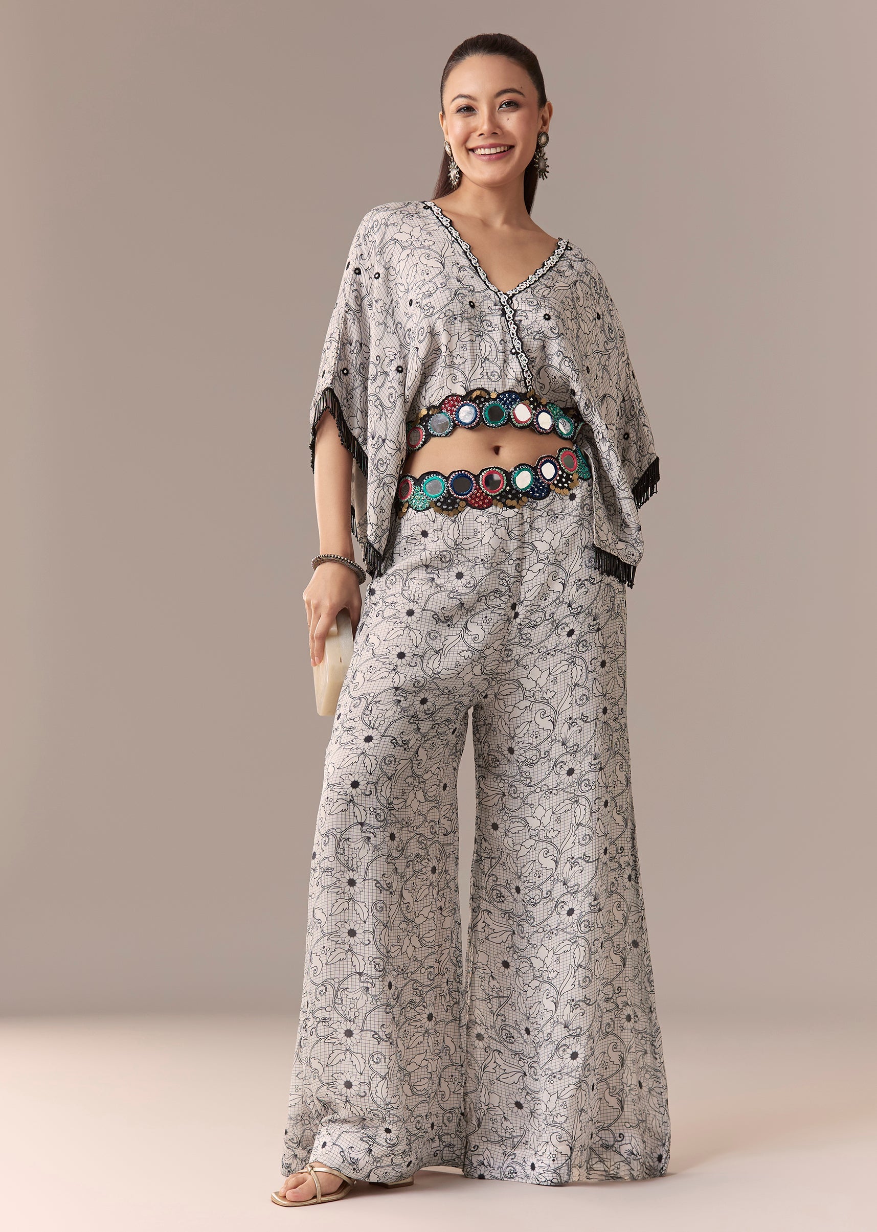 Grey Floral Mirror Work Crop Top Set With Palazzo