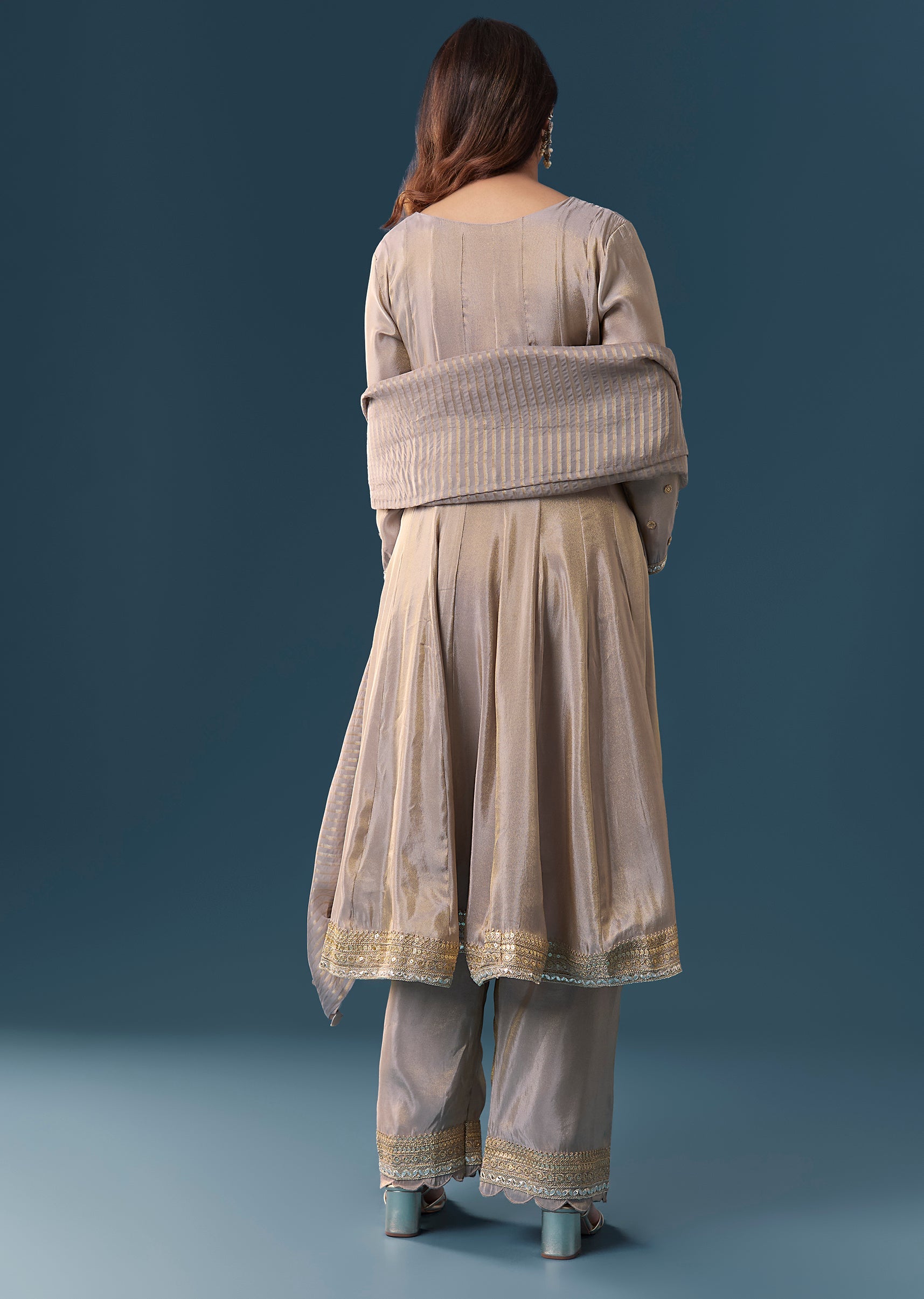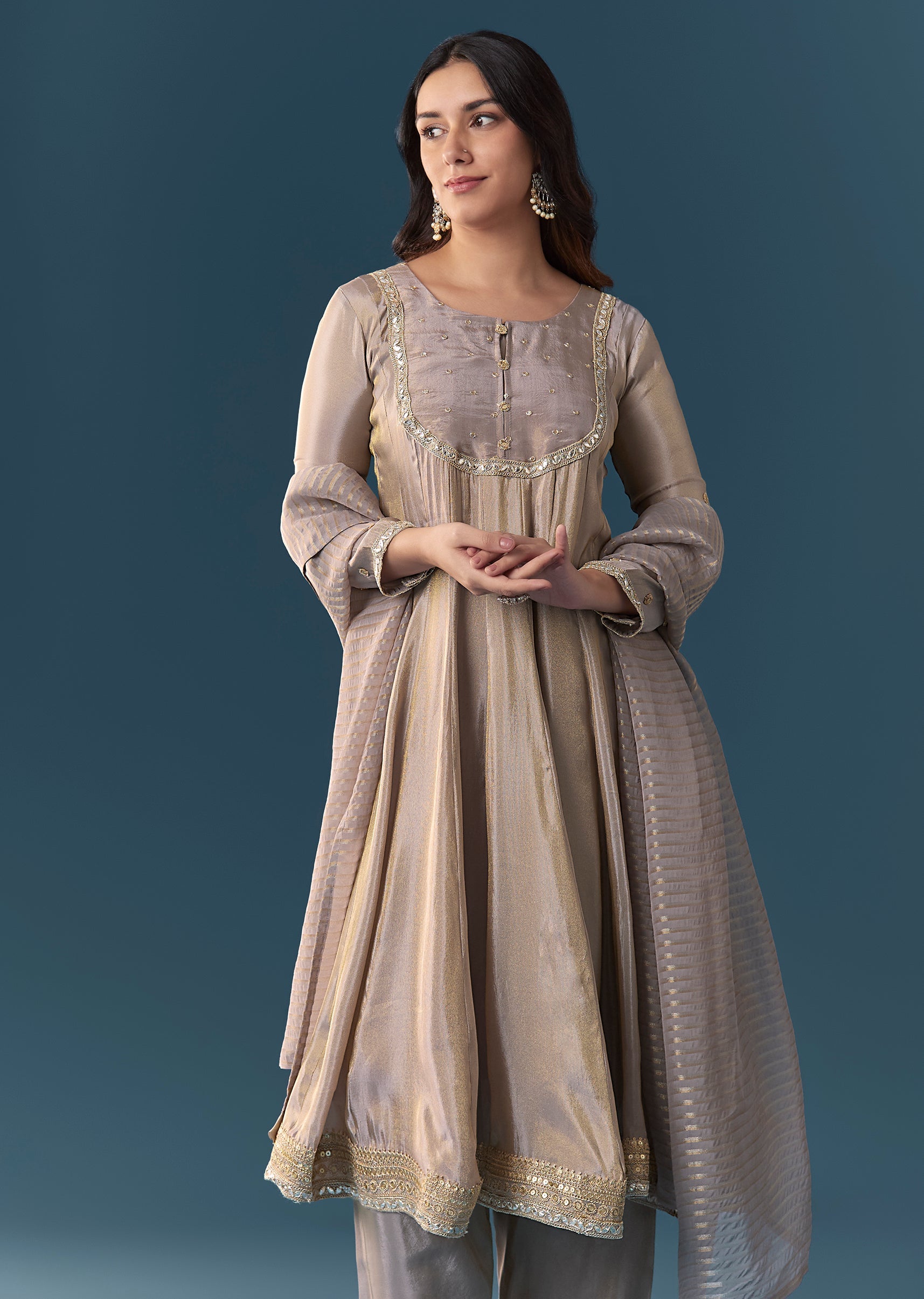 Crafted in tissue, this grey A-line anarkali is finished with elegant gotta lace detailing. Featuring a round neckline, 3/4th sleeves and front hook-eye closure, it comes with straight-fit mid-waist pants... More Product Details